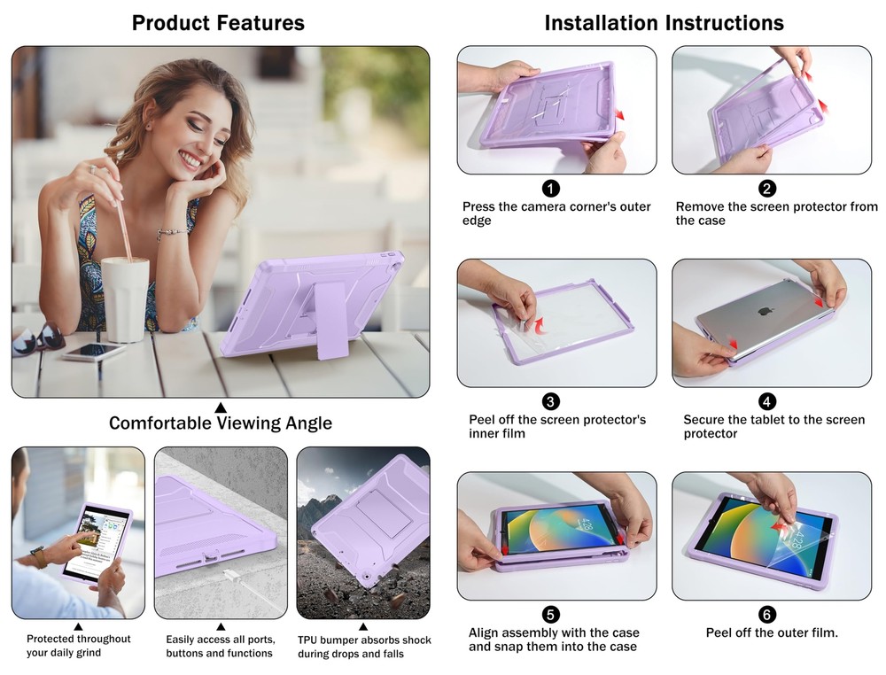 Soke Case for iPad 9th/8th/7th Generation 10.2-Inch (2021/2020/2019 Release), w Features: 【Compatibility】Exclusively designed for Apple 10.2-Inch iPad 9th generation 2021 Release (A2602 A2603 A2604 A2605); iPad 8th Generation 2020 Release (A2270 A2428 A2429 A2430); iPad 7th Generation 2019 Release (A2197 A2198 A2200) 【Rugged Armor Full Protection】Multi-layered hard PC back and flexible TPU bumper provide full protection against drops,bumps, and impacts, also easy to install 【Built-in Screen Protector】Prevents your New Apple iPad 9th / 8th / 7th Gen screen from scratches without compromising sensitivity and provides full protection 【Precise Cutouts】 Precise cutouts and design allow easy access to all ports, sensors, speakers, cameras without removing the case 【Built-in KickStand】 Functional pop-out kickstand with dual stand angles for easily enjoying movies and better working. FREE YOUR HANDS Features: 【Compatibility】Exclusively designed for Apple 10.2-Inch iPad 9th generation 2021 Release (A2602 A2603 A2604 A2605); iPad 8th Generation 2020 Release (A2270 A2428 A2429 A2430); iPad 7th Generation 2019 Release (A2197 A2198 A2200) 【Rugged Armor Full Protection】Multi-layered hard PC back and flexible TPU bumper provide full protection against drops,bumps, and impacts, also easy to install 【Built-in Screen Protector】Prevents your New Apple iPad 9th / 8th / 7th Gen screen from scratches without compromising sensitivity and provides full protection 【Precise Cutouts】 Precise cutouts and design allow easy access to all ports, sensors, speakers, cameras without removing the case 【Built-in KickStand】 Functional pop-out kickstand with dual stand angles for easily enjoying movies and better working. FREE YOUR HANDS eBay integration by