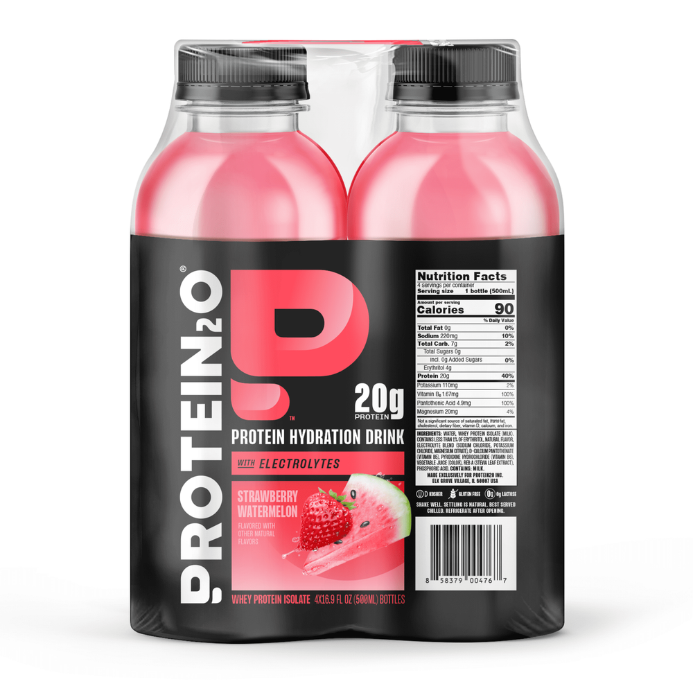 20g of Whey Protein Isolate in one hydration powerhouse. Serious muscle recovery and 350mg of electrolytes to keep you pushing through. It’s packed with 20g of protein, so whether you're lifting, running, or just owning your day, Protein2o fuels your grind. No sugar. No fillers. Just pure Strawberry Watermelon flavor that's refreshing in every sip. At only 90 calories, it’s light enough to drink anytime, now with added Vitamins B5 & B6 for that extra boost. Hydration and performance—no compromises. It's two things at once, because you're not here to choose. ENHANCED MUSCLE REPAIR: Packed with 20g of high-quality Whey Protein Isolate that supports optimal post-workout recovery, helping your muscles rebuild stronger and faster. SUPERIOR HYDRATION: Contains 350mg of electrolytes to effectively hydrate your body, keeping you energized and refreshed. COMPLETE VITAMIN RESTORATION: Includes 100% of the daily value of Vitamins B5 and B6, enhancing energy production and promoting efficient protein absorption. NO ARTIFICIAL SWEETENERS: Free from artificial sweeteners, making each bottle low-carb and keto-friendly with only 3g net carbs, 90 calories, and zero sugar. PURE AND REFRESHING FLAVORS: Enjoy flavors that are OU-D kosher, gluten-free, and devoid of artificial flavors. Each bottle is 0g lactose and packaged BPA-free for your health and convenience. BRAND EVOLUTION IN PACKAGING: As we evolve, packaging might vary momentarily. You may receive the previous version, but rest assured, the fresh, new product is on its way!