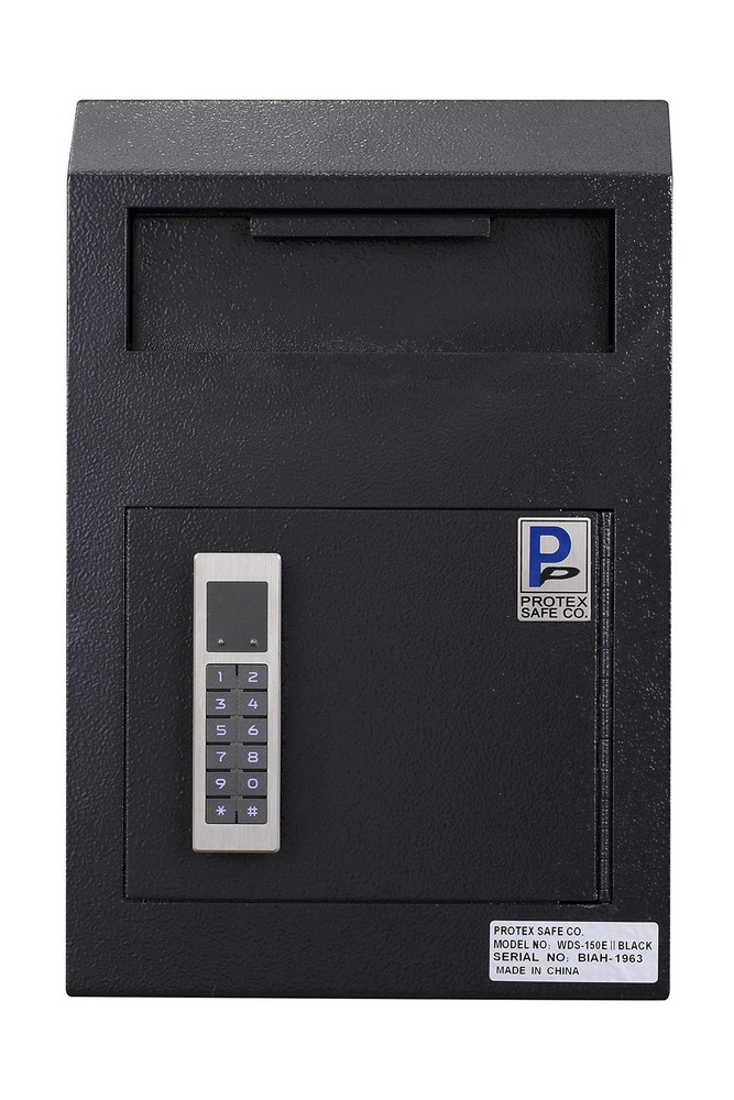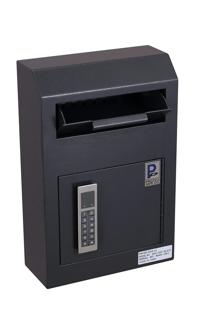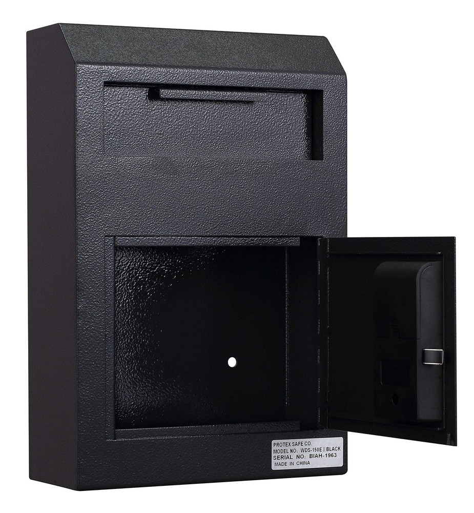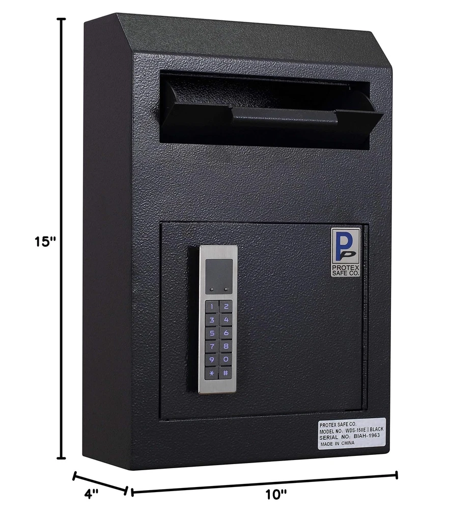 ProtexSafe Wall Mount Drop Box(WDS-150E II), Piano hinge, secure suggestions, ballots, keys, mail, money, rent checks and more, Metal baffle to protect slot, electronic lock, Black Product Details Color: Black Brand: Protex Safe Co. MPN: WDS-150E II Black UPC: 714583302764 EAN: 0714583302764 Brand: Protex Safe Co. Product Dimensions: 4"D x 10"W x 15"H Lock Type: Electronic Color: Black Material: Alloy Steel, Metal Special Feature: Quick-Drop Solution Mounting Type: Floor Mount Control Type: Touchpad Control Included Components: manual, accessories box and body of safe Alarm: Lock Brand: Protex Safe Co. Product Dimensions: 4"D x 10"W x 15"H Lock Type: Electronic Color: Black Material: Alloy Steel, Metal Special Feature: Quick-Drop Solution Mounting Type: Floor Mount Control Type: Touchpad Control Included Components: manual, accessories box and body of safe Alarm: Lock Water Resistance Level: Not Water Resistant Chamber Depth: 4 Inches UPC: 714583302764 Global Trade Identification Number: 64 Manufacturer: Protex Safe Co., LLC Part Number: WDS-150E II Black Item Weight: 15.93 pounds Item model number: WDS-150E II-B Style: Digital Keypad Item Package Quantity: 1 Special Features: Quick-Drop Solution Batteries Included?: Yes Batteries Required?: Yes Battery Cell Type: Zinc Warranty Description: 1 year limited warranty Date First Available: January 30, 2019 Safe & Heavy Duty: Sturdy Piano hinge,metal baffle to protect drop slot.Reinforced double steel door to protect against prying. User-friendly Keypad: Stable Battery operated electronic lock system (Uses 3 AA batteries)-easy to program. Diverse use: Use as a mail collection box for all out-going office mail. The perfect way to lock and secure suggestions, ballots, keys, car remotes,mail, money, rent checks and more. Size: 7-3/8 (W) x 1-3/8 (H) (7/8" drop clearance). Exterior Dimensions: 10 (W) x 15 (H) x 4-1/4 (D),Door Clearance: 7-1/8 (W) x 6-1/4 (H), Door Thickness: 1/8, Weight: 22 Lbs. Simple and quick installation: Pre-drilled mounting holes in back. Mounting hardware for wood and concrete is included. We have the most versatile line of drop boxes out there. Our drop boxes are designed for cash, checks and envelopes, this drop safe is the right solution for property managers, office, liquor stores, and restaurants that are in need of a quick-drop solution to minimize on-hand cash. You'll be able to find the right drop box for any application. We emphasize on security and ease-of-use when designing a new drop box.