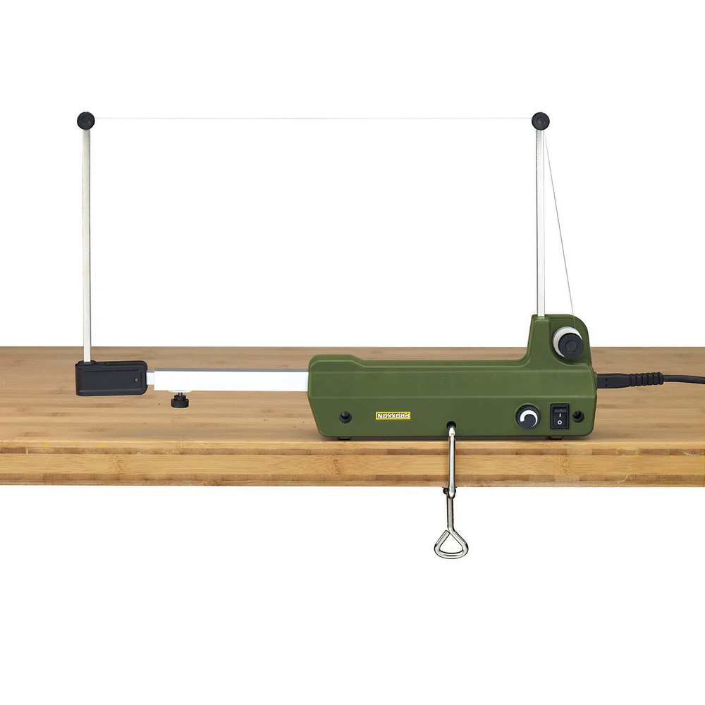 For architects, designers, artists, in prototype construction, insulation work and, not least, for classical model building (railroads, airplanes, boats). For cutting Styrofoam, hard foam, polyurethane, PU foam and thermoplastic materials. Switch-mode power supply for 110 - 120V AC connection. The heating element is operated with a safety voltage of max. 40V and 1.2A. Depending on the material the cutting wire temperature is pre-selected using the practical control knob and remains stable while working. Supporting surface with lateral bore for fixing a c-clamp to allow for stationary use. Telescopic arm for adjustable cutting lengths from 400 - 650mm (15 3/4" - 25 1/2"). Cutting depth (throat capacity) 200mm (7.9"). A c-clamp and a spool with 30m (98ft) of cutting wire Ø 0.2mm are included in the scope of delivery. Technical data: 110 - 120V. AC 50/60Hz. 50W. Secondary voltage max. 40V, 1.2A. Cutting temperature of wire Ø 0.2mm (0.008") continuously variable from 100 - 350 °C (210 - 660 °F). Weight 850g (1.9 lbs). Insulated to Class 2. Quiet, precise and vibration-free for fatigue free use Low weight and slim design, without ever compromising performance High quality precision tools