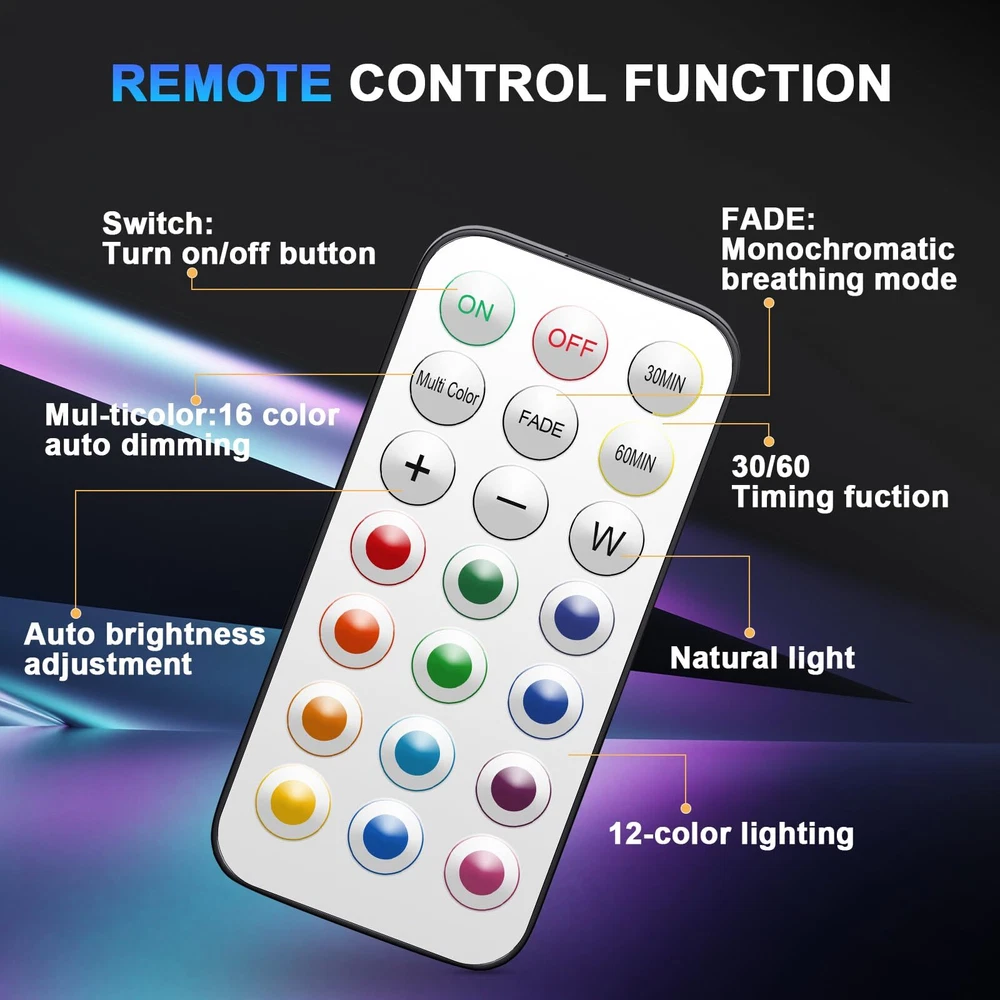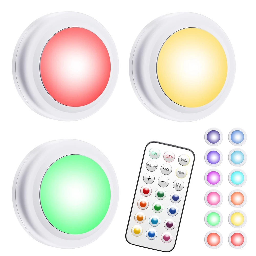 【Wireless Remote】 led puck lights with 1 remote control(3Packs) with control modes: turn on/off with the remote control or manually press the dome button. The remote control distance range: 16 feet ~ 21 feet, which is very convenient and easy to use. 【Dimmable Light and 13 color RGB】Battery Powered Puck Lights has 30 lumens, bright enough. Press the "-" and "+" buttons on the remote to get the exact brightness you want (5 levels of adjustment).13 color options: warm white and 12 preset colors. smooth, cycle through 12 rainbow colors; Fade in and out and slowly change the brightness of a color. 【Smart Timekeeping】Upgraded led push lights with Wireless Remote can be set to turn off after 30 or 60 minutes, which is convenient for energy saving. It can intimately accompany babies who are affected by darkness. Reboot from the indicator when it was last turned off. 【Widely Used】This indoor led night lights are widely used in bedrooms, baby rooms, counters, kitchens, garages,basements, closets, stairs, corridors, cabinets, etc. 【Easy Installation】Each wireless LED closet light is powered by 3 AA batteries (batteries not included), using original tape (including 3) for quick installation. When the light brightness starts to weaken or the remote control is not sensitive enough, just unscrew the light from the base and insert a new battery to replace it. 【Note】 When the light dims, changes color, doesn't light up or flickers a bit, remote control malfunctions these situations, usually it's dead, just change the batteries to solve the problem.