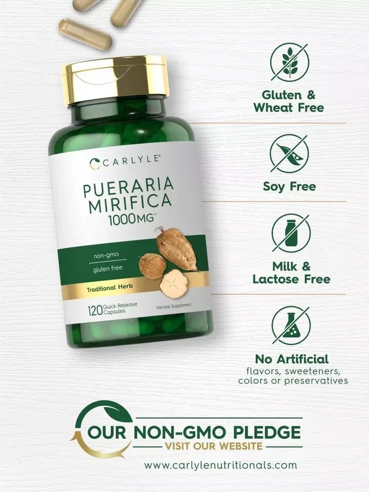 PUERARIA MIRIFICA: Traditional Asian herb whose roots contain naturally occurring phytoestrogens ROOT EXTRACT: Supplies the equivalent of 1,000 mg of Pueraria Mirifica per quick-release capsule ROOTED IN WELLNESS: Carlyle provides premium, honest supplements in your pursuit to healthy living CARLYLE MANUFACTURERS: Laboratory Tested, Trusted Ingredients, Superior Quality, 100% Guaranteed! NATURALLY FREE OF: Gluten, Wheat, Yeast, Lactose, Artificial Sweetener & Non-GMO Suggested Use: Take 2 capsules after a meal or with a full glass of water. "What is Pueraria Mirifica? Pueraria Mirifica is a traditional herb that is widely grown in certain parts of Thailand and Southeast Asia. This exotic plant has been used by men and women in herbal wellness practices dating back over 1,000 years! Its abundant, tubular-shaped roots contain naturally occurring phytoestrogens and other plant-derived antioxidants. Carlyle Pueraria Mirifica: At Carlyle, our premium herbal supplement delivers the equivalent of 1,000 mg of Pueraria Mirifica extract, in one daily capsule for maximum antioxidant support. We lab-test our herbs for purity and potency, ensuring you receive nothing, but the best nutritional benefit nature can offer. Enjoy exceptional value today with our 120-day supply! Rooted in Wellness: Our expertise in sourcing the purest ingredients combined with advanced technologies makes us proud to deliver premium, honest supplements at the best value. Carlyle Pueraria Mirifica are a testament to our commitment to excellence, made with powerful ingredients rooted in wellness. Thanks for choosing us in your pursuit of living healthy." WARNING: Not intended for use by pregnant or nursing women. If you are taking any medications or have any medical condition, consult your doctor before use. If any adverse reactions occur, immediately stop using this product and consult your doctor. Not intended for use by persons under the age of 18. If seal under cap is damaged or missing, do not use. Keep out of reach of children. Store in a cool, dry place.