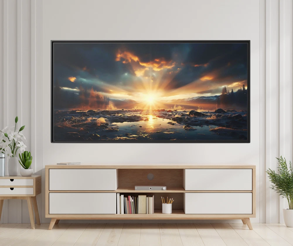 "Falling Light, Rising Beauty" – Epic Sunset Landscape Illustration Product Description: Immerse yourself in the breathtaking splendor of " Falling Light, Rising Beauty " , a licensed reproduction of an AI-generated epic sunset landscape by Hypnotik Creations. This panoramic masterpiece captures the golden hues of twilight as they cascade across a tranquil, wide-angle view, blending rich and vivid colors with dramatic light and shadow. The scene radiates beauty and serenity, making it a perfect focal point for your home or office. Expertly printed in HDR on museum-quality cotton-polyester composite gallery-wrapped canvas , this artwork features a special proprietary matte finish coating that enhances detail and guarantees long-lasting vibrancy. Using state-of-the-art printing technology and UL-certified Greenguard Gold inks , the image delivers stunning, eco-friendly clarity while being non-toxic, non-hazardous, and non-flammable. Choose between two elegant display options: with or without the 1.25" solid pine wood frame in black . The handcrafted frame, sustainably sourced and FSC-certified, adds a sleek floating effect, elevating the canvas to gallery-quality perfection. Both options are ready to hang out of the box , with sawtooth hardware pre-attached and rubber dots ensuring the canvas stays securely in place. Whether displayed in a living room, bedroom, or office, " Falling Light, Rising Beauty " is an awe-inspiring piece that brings the magic of nature into any space. Available framed or unframed, this eco-conscious artwork is a timeless investment in style and tranquility. Key Features: Title: " Falling Light, Rising Beauty " by Hypnotik Creations Design: Panoramic sunset landscape featuring epic colors and a dramatic wide-angle view. Material: Museum-quality cotton-polyester composite gallery-wrapped canvas with a proprietary matte finish for vibrant, long-lasting color. Printing: HDR printing with UL-certified Greenguard Gold latex inks ensures eco-friendly, non-toxic, and high-quality imagery. Frame Options: Framed: 1.25" solid black pine wood frame with a floating effect, FSC-certified and sustainably sourced. Unframed: Same premium materials without the frame. Eco-Friendly: Made with sustainable materials and safe, environmentally responsible inks. Ready to Hang: Pre-attached sawtooth hardware and rubber dots for secure installation. Size Variations: Slight deviations of +/- 1/8" (3.2mm) due to production processes. Care Instructions: Wipe gently with a clean, damp cloth to remove dust or smudges. Size Options: 32x16, 48x24, 60x30. Transform your space with the timeless beauty of " Falling Light, Rising Beauty " , a stunning sunset panorama that exudes warmth, elegance, and a sense of wonder. 4o * Shipping to Alaska, Hawaii, and unincorporated territories of the United States can take additional 7 ? 12 business days, weather permitting.