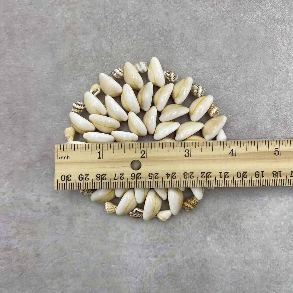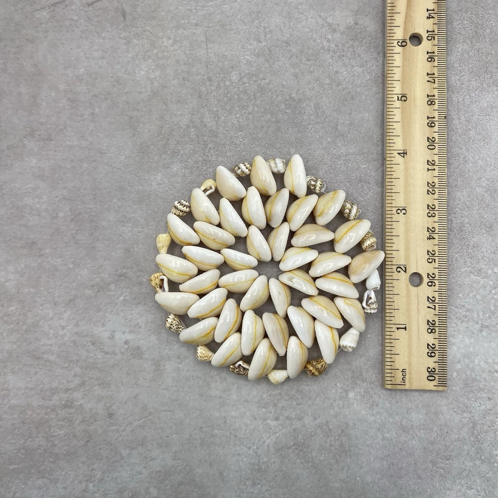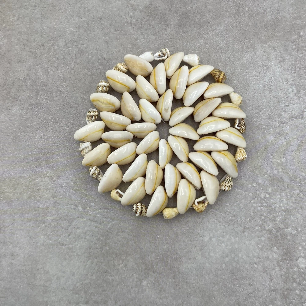Preowned Puka and Cowrie Seashell vintage Coaster. It is in good condition with little wear. Perfect for a Beach and Coastal decorated Home. It measures about 4 Inches. Please see pictures.