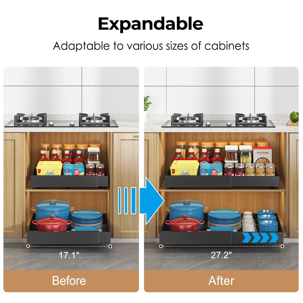 【Adjustable Slide Out Drawers for Kitchen Cabinets】The Homehut pull out cabinet organizer is designed with flexibility in mind, featuring an expandable system that can be adjusted to fit a variety of cabinet sizes. With dimensions of 16.5 inches in depth by 2.9 inches in height and a width that adjusts from 17.1 inches to 27.2 inches, this cabinet pull out shelves solution is a perfect fit for your kitchen storage needs. Before selecting, please ensure to confirm the size of your cabinet for seamless integration. 【Cabinet Drawers Slide Out Silently and Smoothly】 Engineered for durability and quiet operation, our pull out drawers for cabinets boasts dampened glide rails that have undergone rigorous testing for 40,000 cycles of opening and closing. Experience the convenience of slide out drawers with a one-second glide out motion, free from jamming or snagging. The smooth and quiet operation ensures a pleasant user experience every time. 【Enhanced Load Capacity with Upgraded 3-Rail System】 Our pantry organizer has been thoughtfully upgraded with a 3-rail system, offering a 30% increase in load-bearing capacity over similar organizers with only two rails. This robust design allows the cabinet pull out shelves to support a maximum weight of up to 65lbs, making it a reliable choice for your heaviest kitchen items. 【No Screw Adjustable Cabinet Drawers for 10S Quick Installation】Say goodbye to complex assembly with our easy 10-second installation process. The kitchen cabinet organizer and storage cabinet come with clear instructions and can be mounted using either the provided screws or nano adhesive—no tools required. This peel and stick slide out drawers solution is ideal for quick setup in your kitchen, bathroom, under the sink area, or pantry. 【Versatile Under Cabinet Drawers Slide Out】The multifunctional pull out cabinet organizer is an essential addition to any kitchen, making it easier to organize and access your cookware, frying pans, small kitchen utensils, cleaning products, canned goods, and other items. The under cabinet drawers slide out design ensures that you can make the most of your cabinet space, providing effortless access to your belongings.