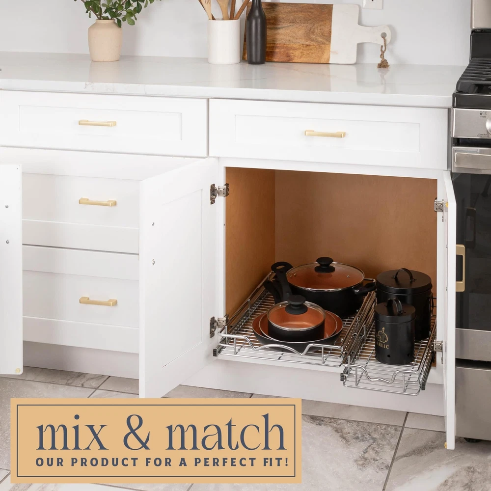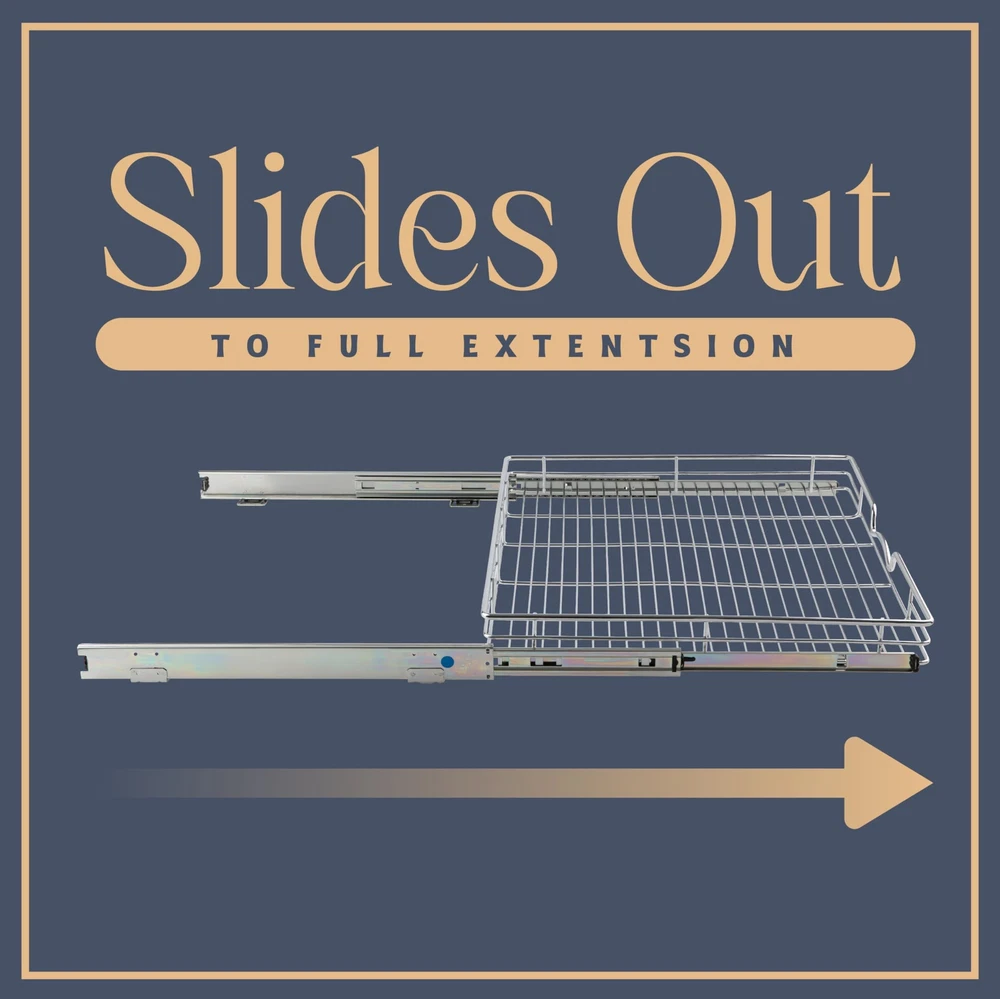 A MUST HAVE PULL OUT DRAWER: This sliding cabinet organizer installs in under 30 minutes and makes it super easy to store, organize, and access spice rack, pots, and baking sheets. SMOOTH SLIDE-OUT DRAWER: This kitchen cabinet roll out shelf is manufactured with a pull out system that slides out ultra-smooth. Other than other drawer organizers, our Pull Out Cabinet shelf slides out all the way, providing you with easy access. RELIABLE SHELF INSERTS FOR CABINETS: Our adjustable sliding cabinet organizer features elegant heavy wire construction which is durable enough to handle up to 50 pounds. EASY TO INSTALL & HARDWARE INCLUDED: Our pull out cabinet organizer dimensions measure 24”W x 21”D x 3.25” and include simple step-by-step instructions along with all of the hardware necessary for easy installation. Installs with just a few simple screws, and Fits cabinet openings 25-1/4”and larger HIGH QUALITY: Made of durable metal with chrome finish the pull out shelf for kitchen cabinet is simple and easy to install. Designed to fit any style of cabinetry and easy to clean.