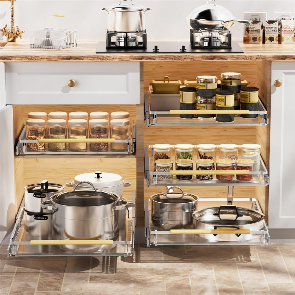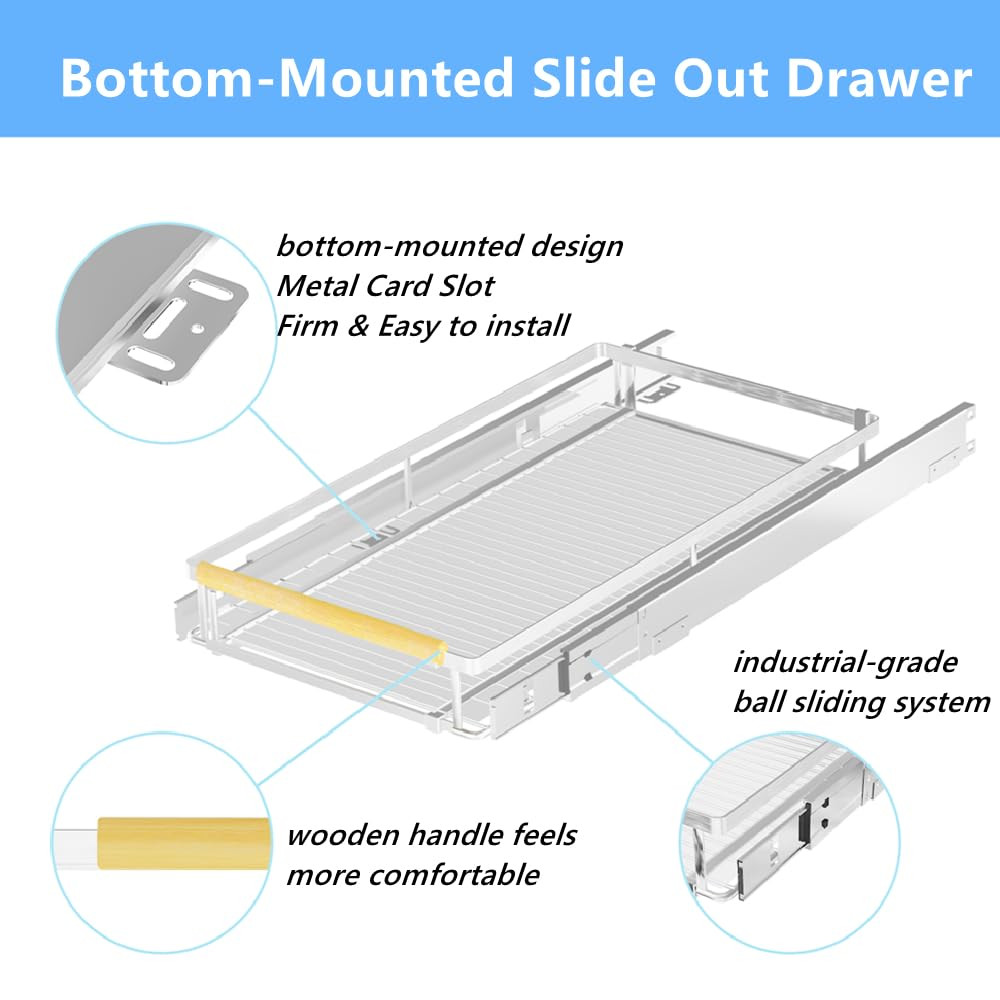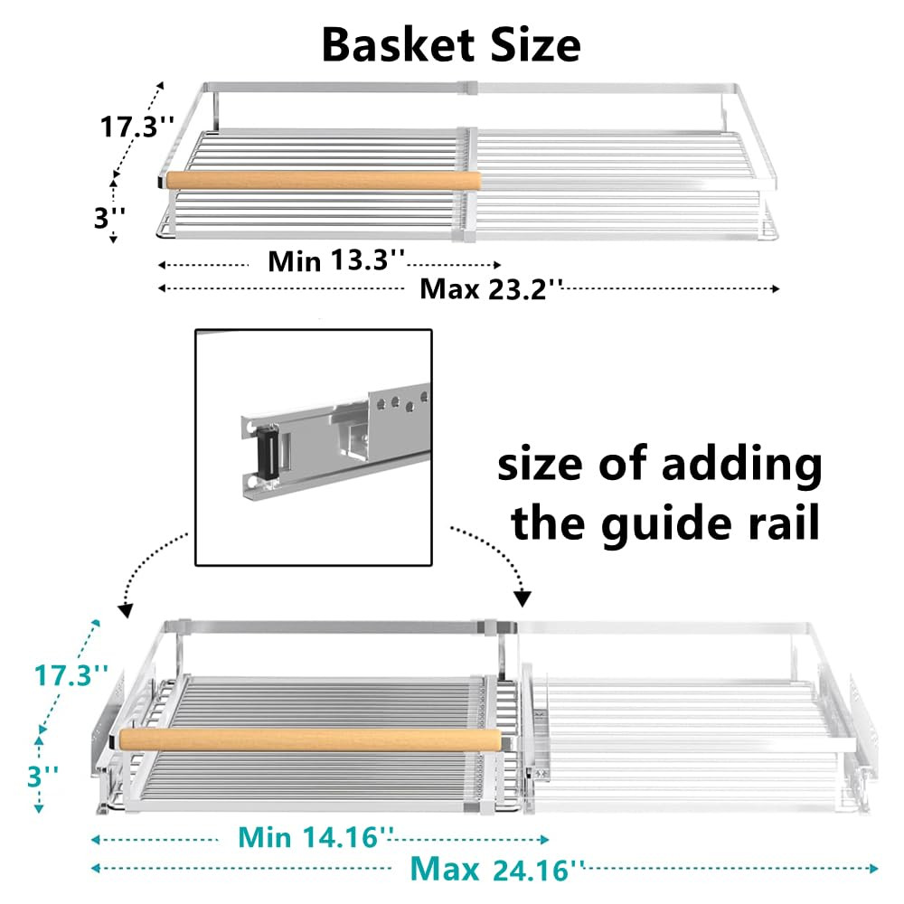 The pull-out cabinet organizer with a size of 14.16''-24.16''W x 17.3''D x 3"H. Package contains detailed instructions and all necessary hardware. Notice for proper installation, please make sure that the width of your cabinet. This cabinet organizer is manufactured with a ball bearing system, the slide-out will be smooth. And add the ability to adjust the width, you can expandabel the shelf to fit your cabinet. It can better utilize and save more cabinet space than ordinary pull-out cabinet organizers. Made of high quality chrome stainless steel, which is sturdy and durable and has a strong load-bearing capacity. The drawer shelves is removable and washable, give you a tidy home. Includes a 2-year limited warranty to ensure top quality. Perfect for anywhere you want to keep things tidy, such as your kitchen cabinets, under the sink, your room's closet, bathroom vanity, pantry, on bookshelves, etc. If you have any questions about the product(missing parts/bend/crack), please feel free to contact us, we will provide the best service!