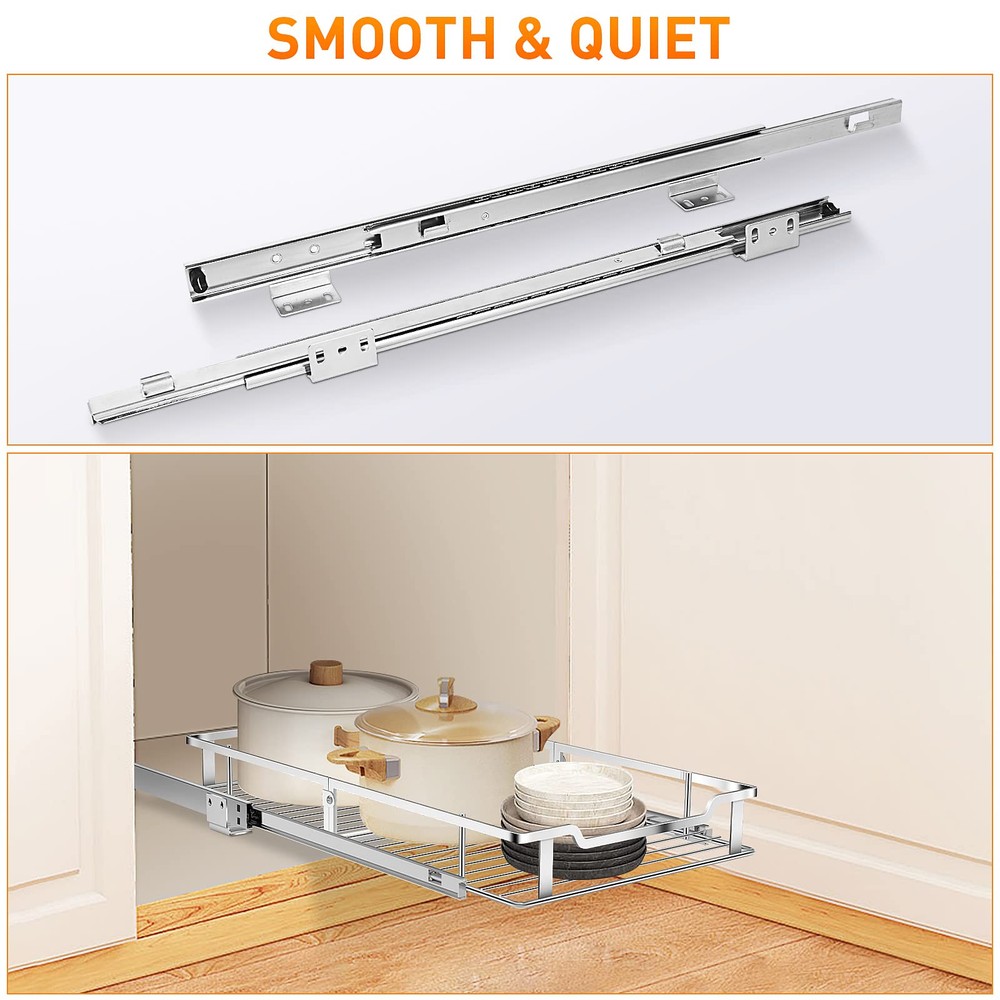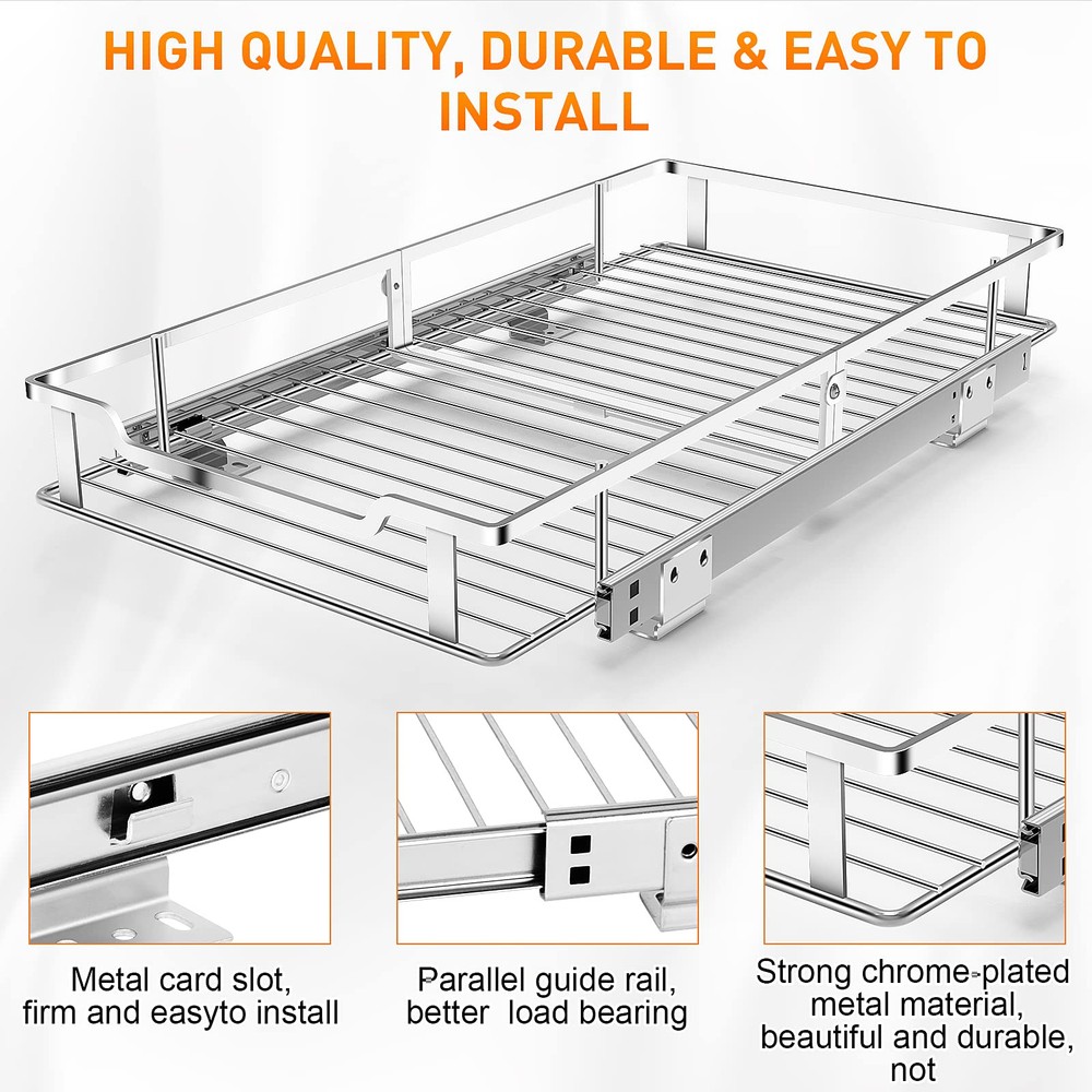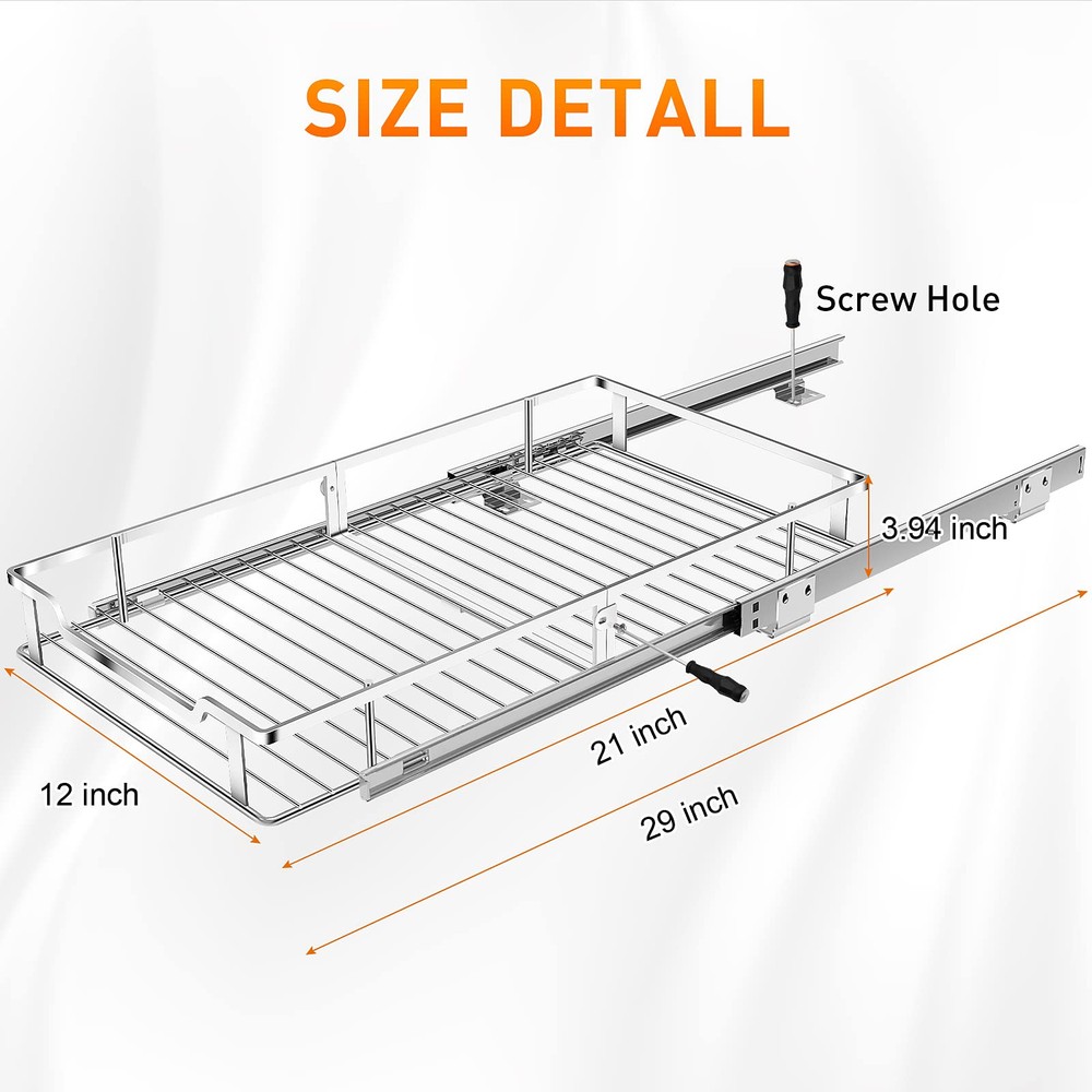 ►MULTIPURPOSE CABINET ORGANIZER - Pull out cabinet organizer is great to storage many other items and put the clutter away in order to give you a tidy home.pull-out sliding shelving system suitable for many places in the kitchen, such as under sink organizer, pot rack, spice rack, etc. And it's suitable for bathrooms and laundry rooms, organizing cleaning supplies, etc. The drawer shelves is removable and washable, give you a tidy home. ►EASY INSTALLATION - Kitchen cabinet organizer dimensions measure 21 inch length × 12 inch width × 2.44 inch height. Its simple design and easy installation instruction make your installation successful quickly. Only takes a few steps, you will get a entire pull out organizer for cabinet. Perfect for your kitchen, bathroom, under sink and pantry storage organizing. Note: this product needs to be fixed with screws to your cabinet. ►HIGH QUALITY CHROMED STAINLESS STEEL - Slide out cabinet organizer made up with high quality chrome stainless steel. Its excellent stability make it can be used in everywhere, like kitchen, bathroom, living room and etc.Its heavy duty construction design makes it totally capacity up to 100 lbs. ►SMOOTH SLIDE-OUT DRAWER - The sliding shelf is professionally designed with an industrial-grade ball sliding system to ensure smooth and quiet sliding every time. The unique vertical guide rail can provide better load bearing. Perfect for your kitchen, Bathroom, and pantry storage organizing. This is great for you because now you won't have to waste time-fighting with an under the cabinet system that gets stuck, breaks or is too loud. ►PERFECT SERVICE - We pursue the best experience. If you have any questions before purchasing or after receiving the product, please feel free to us, we will provide the best service! NOTE: Needs a minimum of 13" W and 22" D cabinet opening space to properly fit.