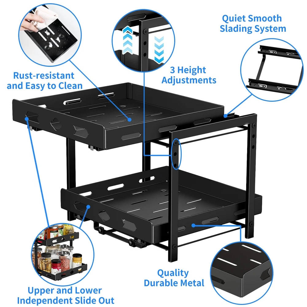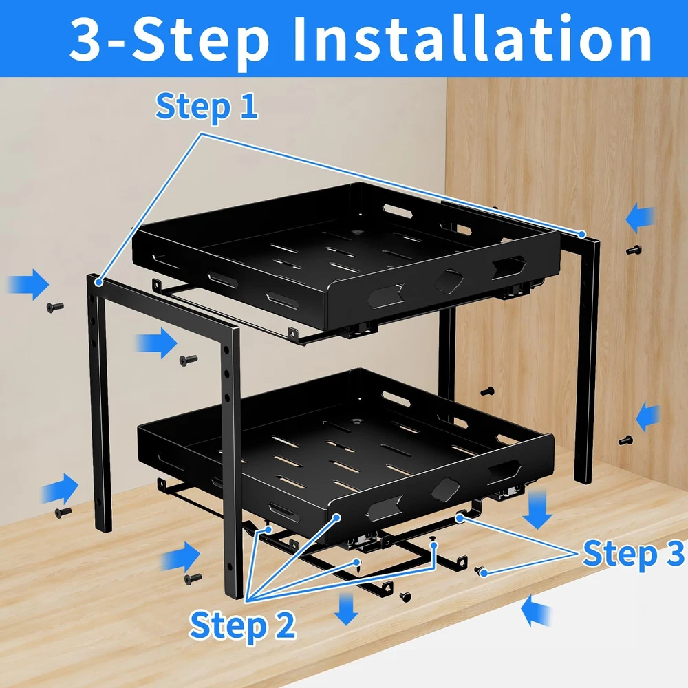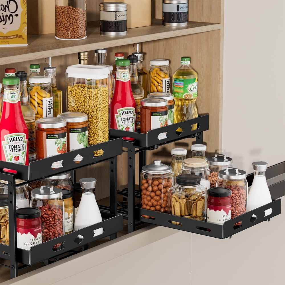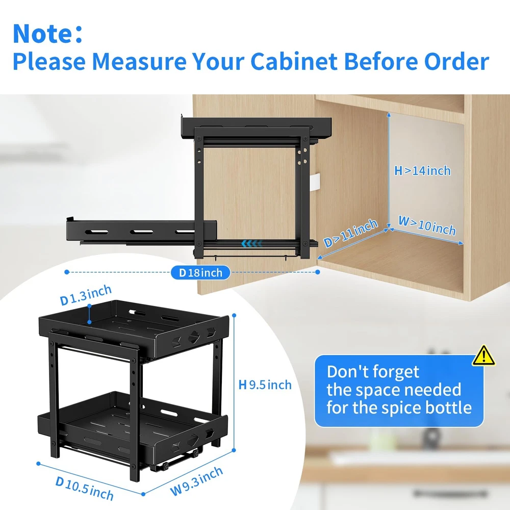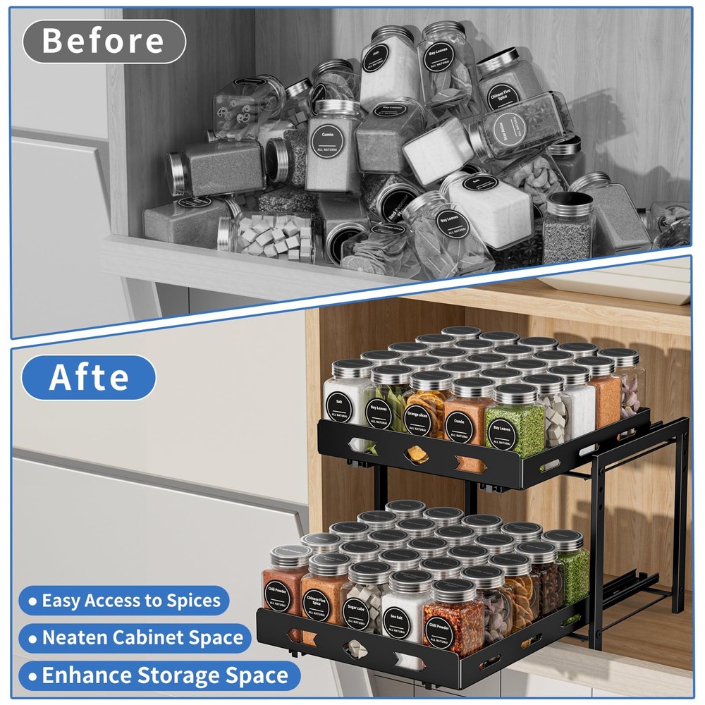 This 2-tier cabinet pull-out spice rack is an ideal spice organizer for kitchen cabinets. With dimensions of 11.9 inches in width, 10.8 inches in depth, and 9.2 inches in height, it can easily hold spice bottles of various sizes and shapes, allowing you to conveniently store and organize all your spices. The slides are designed with a ball-bearing system to ensure smooth and quiet operation. The full-extension slides allow you to easily access all the spices in your cabinet, making cooking a breeze. Made of high-quality metal, the spice rack is rust-resistant and not easily deformed. The independent slide design allows the upper and lower baskets to move independently, making it easy to quickly find and reach the spices you need. The top basket is height adjustable, perfect for storing tall spice bottles such as olive oil and flaxseed oil, providing ample organizing space for all your spices and keeping your cabinets neat and tidy. Installation is very simple, requiring at least a 13-inch wide and 12-inch high cabinet space. No assembly experience is needed, and it can be installed in just two easy steps. It is compatible with both cabinets with and without edge lips. Spice Rack: 2 tier pull out spice rack organizer for cabinet is for kitchen cabinets, increase cabinet storage space. Spice rack organizer size 11.9''Wx10.8''Dx9.2''H. As spice spice for cabinet, they can hold spices of various sizes and shapes. Allows you to easily access and organize all your spice bottles. Note: Jars not included. Smooth Sliding and Quiet Slide Out: The slides are designed with a ball bearing system to ensure that the cabinet spice organizer are smooth and steady during sliding, with no noise at all. The full extension slides allow you to easily access all the spices in your cabinet. Let you enjoy cooking food completely. Quality Metal and Independent Slides: The spice rack made of high quality metal, not easy to deform the surface is painted to prevent rusting. Shelf design, spice jars will not tip over or fall out of the basket when the spice rack slide out. Ensure spice jars are neatly arranged. The upper and lower baskets slide independently of each other, making it easier to find and reach the spices. Wide Use: Spice racks for inside cabinets storage variety of sizes of spice jars and bottles, perfect for storing spices, seasoning grinds, grains, canning jars, salt and pepper grinders and more. The top basket is height adjustable for storing tall bottles of spices such as olive oil and flaxseed oil. Provide enough organizing space for all your spice storage, cabinets are not cluttered. Easy to Assemble and Install: Our spice shelf organizer for cabinet it requires at least 13'' wide x 12''high cabinet space. Please measure your cabinet first. No assembly experience required, assembles in 2 easy steps. Note: Cabinets with edge lip! Cabinets without edge lip! Works for both 2 kinds!