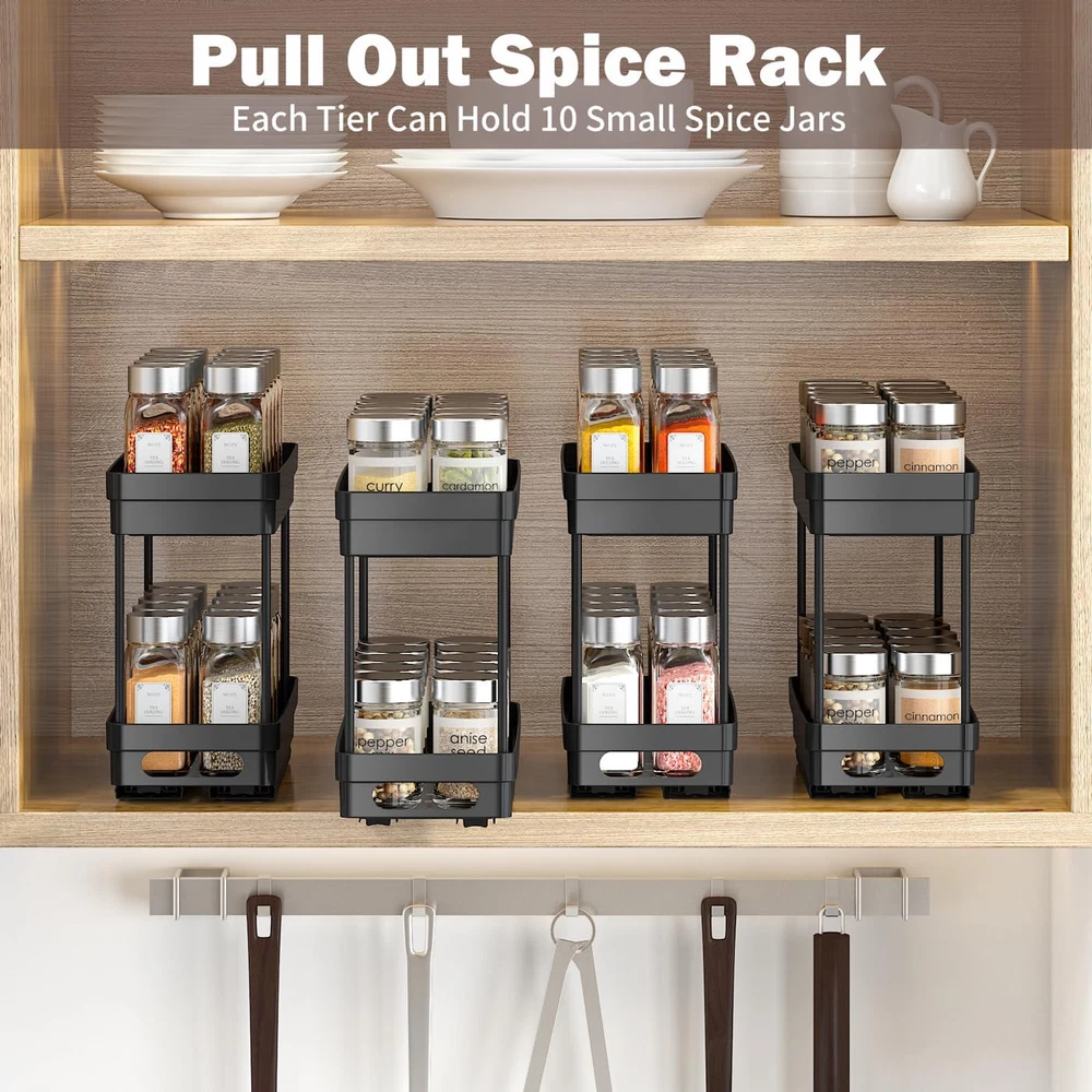 Store New Arrivals Add to Favorite View Feedback Contact Pull Out Spice Rack Organizer for Cabinet, 2-Tier Slide Out Spice Racks Organizer,Easy Installation Cabinet Organizer Seasoning Kitchen Organizer,4.4''Wx10.5''Dx8.26''H,2Pack Description Item model number 909-2 Style Modern Batteries Included? No Unit Count 2.0 Room Type Kitchen Is Customizable No Assembly Required No Product Dimensions 10.5"D x 4.4"W x 8"H Material Plastic Finish Type Powder Coated Included Components 2* Lower Baskets, 2* Top Baskets, 8* Support Tubes, 8* Screws, 4* Nano Double Sided Adhesive Strip Item Package Quantity 1 Indoor/Outdoor Usage Indoor Batteries Required? No Item Weight 3.56 pounds Finish Powder Coated Number of Shelves 2 Special Features Pull out, Slide out,Rust Resistant Special Feature Pull out, Slide out,Rust Resistant Part Number 909-2 Mounting Type RM Shelf Type Sliding Shelf Color Black Recommended Uses For Product Food Brand XIANKE Size 10.5"D x 4.4"W x 8"H [Perfect Size for Most Cabinets]: Our spice rack measures 10.5'' D x 4.4'' W x 8'' H(2pcs), making it an ideal fit for cabinets with a minimum height of 12 inches. It’s compact yet spacious enough to hold a variety of spice jars, ensuring your kitchen stays neat and organized while maximizing your cabinet space(Don't fit framed cabinets). [Smooth and Easy Sliding Action]: This pull out cabinet organizer features two smooth sliding tracks at the base of each shelf, allowing you to pull out and access your spice bottles effortlessly. The pull-out design makes it easy to find and grab exactly what you need, while the tracks ensure the shelves slide in and out without any hassle or resistance. [Two Installation Options]:The seasoning organizer offers two installation methods to suit your preferences: you can either use included nano adhesive strips for easy, no-drill mounting or secure it with screws for a more permanent setup. Both options ensure a strong, stable hold, so your spice rack stays in place while providing convenience and flexibility. [Durable and High-Quality Materials]: Crafted from premium ABS plastic and connected using rust-resistant metal tubes, this pantry organizer spice rack is built to last. The sturdy construction ensures long-term durability and reliable performance, even with daily use. The combination of plastic and metal also adds a modern and sleek touch to your kitchen decor. [Two-Tier Storage for More Bottles and Jars]: 2Pack cabinet organizer rack features a convenient two-tier design, offering extra space for spice bottles and other jars and containers, such as medicine bottles, cosmetics, or snack jars. Keep your cabinets neat and organized while maximizing storage capacity for various items in your kitchen or bathroom. Product description Specifications: Size: 10.5"D x 4.4"W x 8.27"H Pices: 2Pack Material: ABS Plastic & Metal Note: Donot fit for Cabinets with lip! XIANKE 2Pack 2-Tier Slide Out Spice Racks Organizer Dual-Layer Storage for More Spice Bottles This spice rack features a two-tier design, providing extra storage space to accommodate more spice bottles and condiments. With the added layers, you can organize your spices more efficiently, keeping your kitchen cabinets neat and orderly. Maximize your storage capacity while ensuring easy access to all your seasonings. 2 Installation Methods Easy Installation Options: use included nano adhesive strips for easy, no-drill mounting or screws for a more permanent setup, both ensuring a stable hold. Multi-purpose To Use Utilizes it in any place of the house, including the bathroom, under the sink, kitchen cabinet, pantry, craft room, shelves, and more. Pull-out Design Making take out your item easier,helps you make full use of spaces. Durable and High-Quality Materials- keeping your kitchen cabinets neat and orderly! How to install-Easily assemble in minutes! ABOUT US We offer the best prices around on high quality products. Our E-store includes media such as books, movies, music and games while offering electronics, toys, sporting apparel, clothing, tools, general home, garden items and more. SHIPPING We are always working hard to ensure your package arrives as soon as possible. Please understand that some factors like weather, high postal traffic, and the performance of shipping companies are outside of our control. We offer free shipping to the lower 48 states and ship within 2 business days of payment, usually sooner. We do not accept P.O. Boxes. Please provide a physical address. RETURNS We offer a 30-Day Return Policy on items which you are not completely satisfied with. You have the option for a full-refund or an exchange of the item. No returns are available on items shipped outside of the USA. PAYMENT We accept PayPal. CONTACT US This page content is yet to come Please ad us to your favorite seller and visit again later Thank You CUSTOMER SATISFACTION We try our very best to make sure every customer is completely satisfied. If there's a problem, message us! We're happy to help.