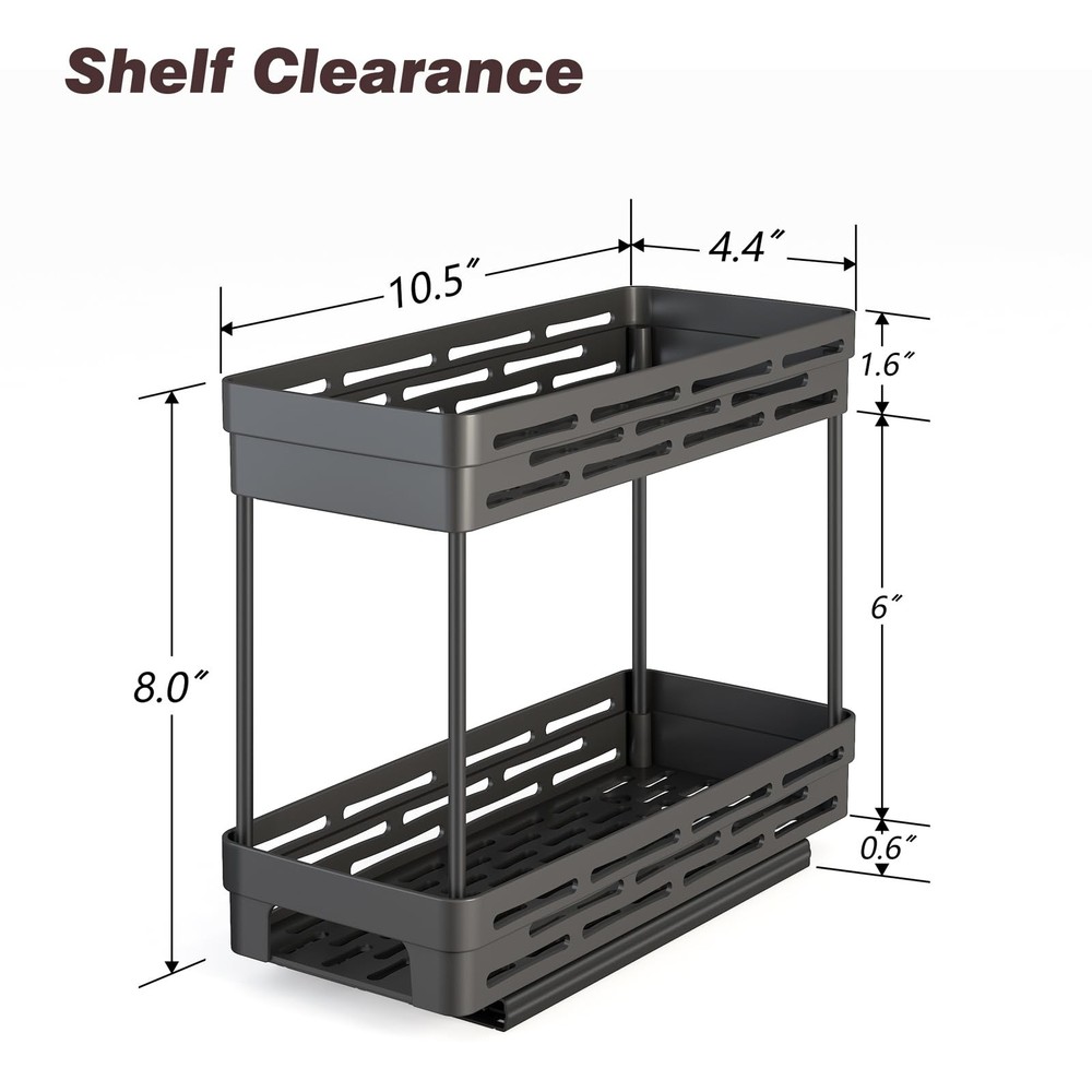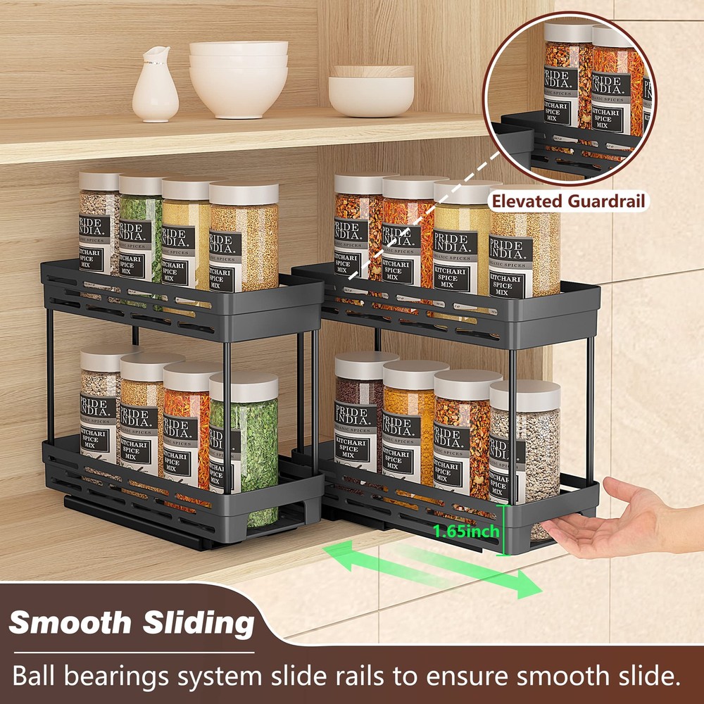 [Please Note] - It's NOT suitable for a framed cabinet at the edge! cabinet needs at least 12'' high,11‘’ Deep and 5‘’ Wide. Please MEASURE the cabinet before order! [Perfect Cabinet Spice Organizer Solution] -3 pcs pull out spice rack organizer for cabinet is the perfect solution to organize your cabinet. Slide out spice rack organizers size 4.4''W x 10.5''D x 8.0''H, which are great for utilizing tight spaces & narrow cabinets. As a must-have for spice storage, they can hold the various size & different shapes of spices. Pull out the spcie rack, find the seasoning you want. Each tier can hold 10 small spice jars. [Two Installation Ways] - Sliding out seasoning organizer fits almost all cabinets. Please measure your cabinet first, it requires at least 12‘’high, 11'' deep and 5'' wide cabinet space. We offer a easy-to-follow instruction and a step-by-step video, just with 4 screws, and you can easily assemble this vertical & space-saving spice rack in minutes. If you mind drilling holes into your cabinets with screws, we also have nano glue to secure the spice rack, making installation a breeze! [Smooth Sliding & Elevated Guardrail] - The slide rails are designed with a ball bearings system to ensure smooth slide, so you can slide the rack with a full load of spice jars effortlessly. Full extension glides offer you easy complete access to all spices inside the kitchen upper cabinets. The spice rack has guardrails, preventing the spice jars from tipping over or drop out of the basket when you pull out the spice rack. [Quality & Rust-Proof Material] - The slide rails and support tubes of DABIGE pull out spice rack for cabinet are made of premium-quality metal material, which will not deform easily, together with the spray-painted surface. And the baskets are made of ABS plastic, tough and BPA free, safe and non-toxic. Effectively preventing the surface from scratching and rusting. DABIGE aims to provide perfect spice organizing solutions with a balance of innovation, aesthetics and enduring value. [Customer Satisfaction Guarantee] - DABIGE pull out spice racks come with 2-tier basket that helps you organize cluttered spice bottles in a limited cabinet space. Well-organized cabinet spice rack always adds more cabinet space for you! If you have any questions about installing the rack or have any other problems, please feel free let us know. It comes with 365-day warranty for the defective parts.