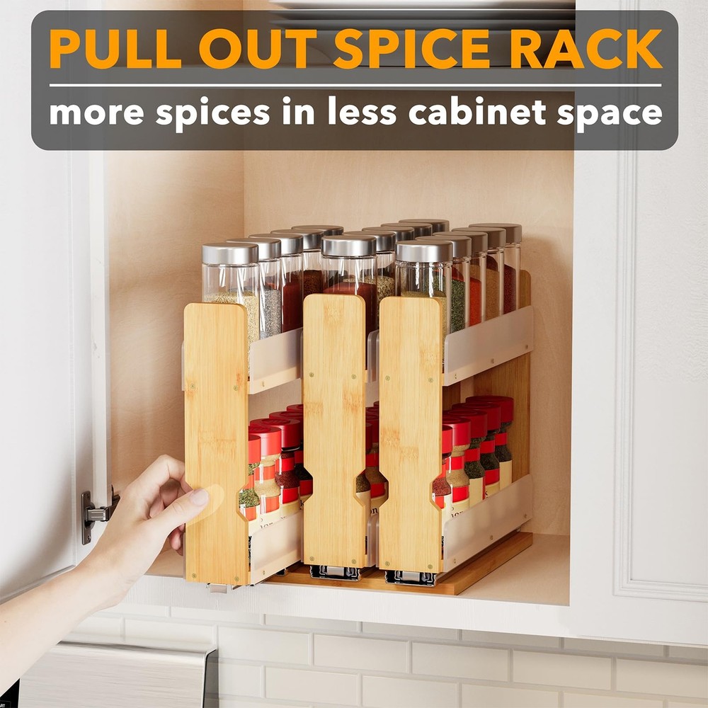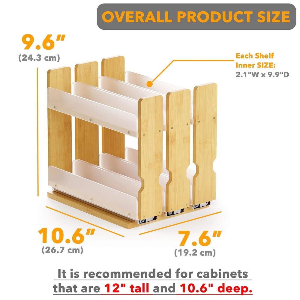 Pull Out Spice Rack Organizer for Cabinet, Heavy Duty Slide Out Seasoning Kitchen Pantry Sliding Vertical Organization, 7.6" Wide, 3 Drawers(2" Wide), 2-Tier, Natural MEASURE CABINET SIZE - Please measure the interior dimensions of your kitchen cabinet first; It is recommended for cabinets that are 12" tall and 10.60" deep; This is the version of 3 Drawers(2" Wide), 2-Tier; Overall Product Size: 7.6"W x 10.6"D x 9.6"H MAXIMIZE SPICE STORAGE SPACE - The easy pull out spice rack organizer lets you more spices in a compact area, keeping everything organized; Effortlessly access all your spices in your kitchen cabinet HEAVY-DUTY SPICE RACK FOR CABINET - Smooth bearing glides allow easy sliding; Full extension rails give complete access to all your spices in kitchen upper cabinets; Bottom panel clears any cabinet lip for a perfect fit DURABLE MATERIAL TO LAST - Crafted from premium quality , this slide out seasoning organizer is built for long-lasting use; Our space-saving spice rack complement your home storage system and maximize cabinet space efficiency EASY TO ASSEMBLE - It is super easy to put the cabinet sliding spice rack together; You will clear instructions and all the hardware needed (even the screwdriver!) in your package