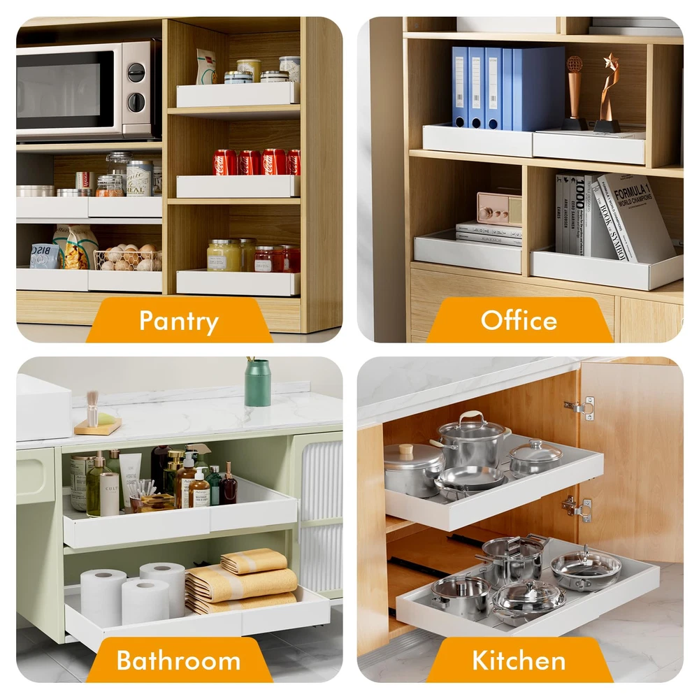 Expandable Drawer: The PXRACK pull out cabinet drawer organizer with an extendable design can be adjusted to fit different kitchen cabinets. It measures 17" d *2.3" h, and from 12.6" to 20.5" in width. Therefore, you can just adjust the slide out drawers for kitchen cabinets base as you need. Please measure the size of the cabinets in your home before purchase, and select the corresponding product size according to the cabinet size. Easy Installation: The pull out drawers for cabinets contain detailed instructions, easy to install, no need to drill & nail, and just follow the manual, you can finish the installation in 10S. Perfect for your kitchen, bathroom, under sink and pantry storage organizing. Heavy-Duty: The slide out drawers for kitchen cabinets are made of heavy-duty metal with an extra smooth sliding system to accommodate a large number of pots and pans, placing glides beneath the drawers, and not on the sides, maximizes every inch of your valuable cabinet space while providing a sleek and seamless look. Smooth and Quiet Slides: Our sliding drawers for cabinets designed with damping guide rails, and damping guide rails have been tested by many times of opening and closing. Our slide out cabinet organizer slides out all the way, providing you with easy access, it can slide smoothly without unpleasant noise. Slide Out Drawers: Organizing your cabinet space just got easier with the cabinet pull out shelves, you can make the most of cabinet space and easily access all your pots, pans, small kitchen appliances, cleaning products, canned goods, and other items.