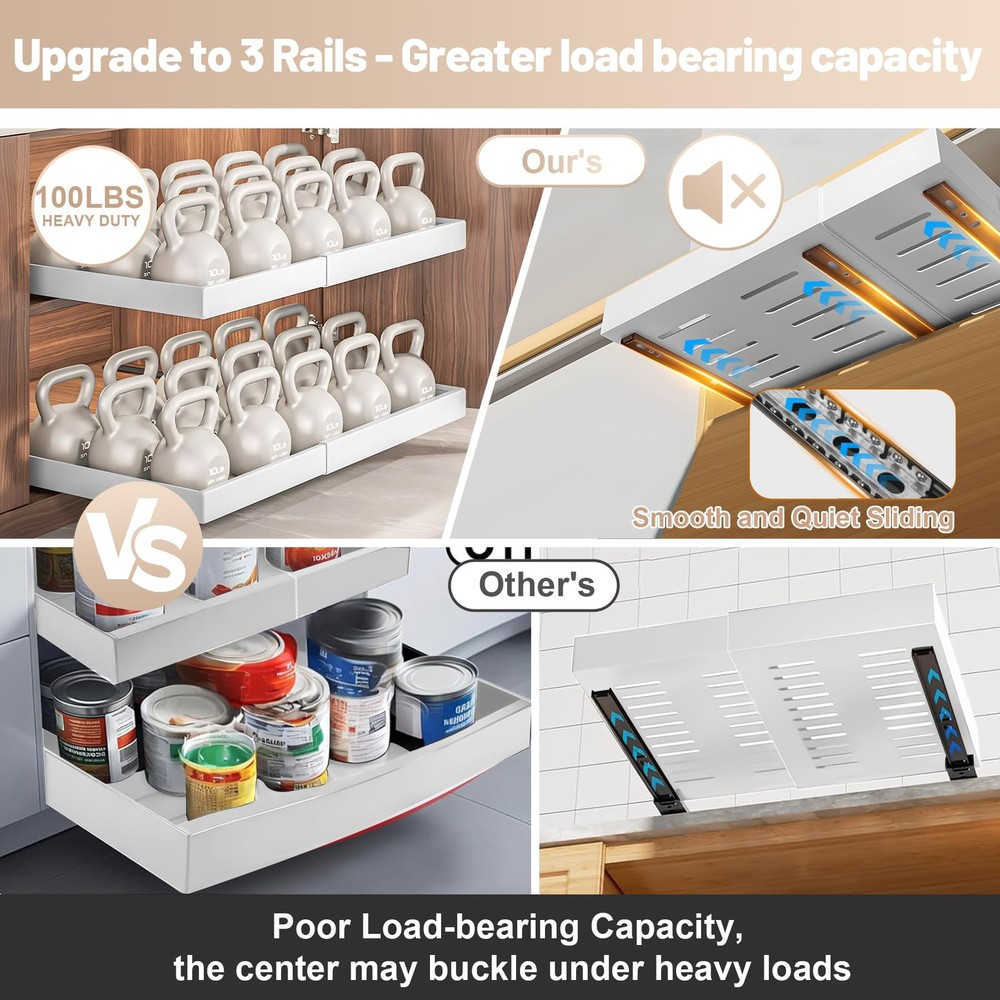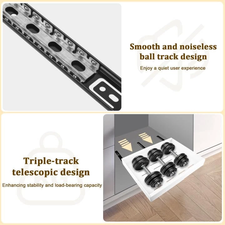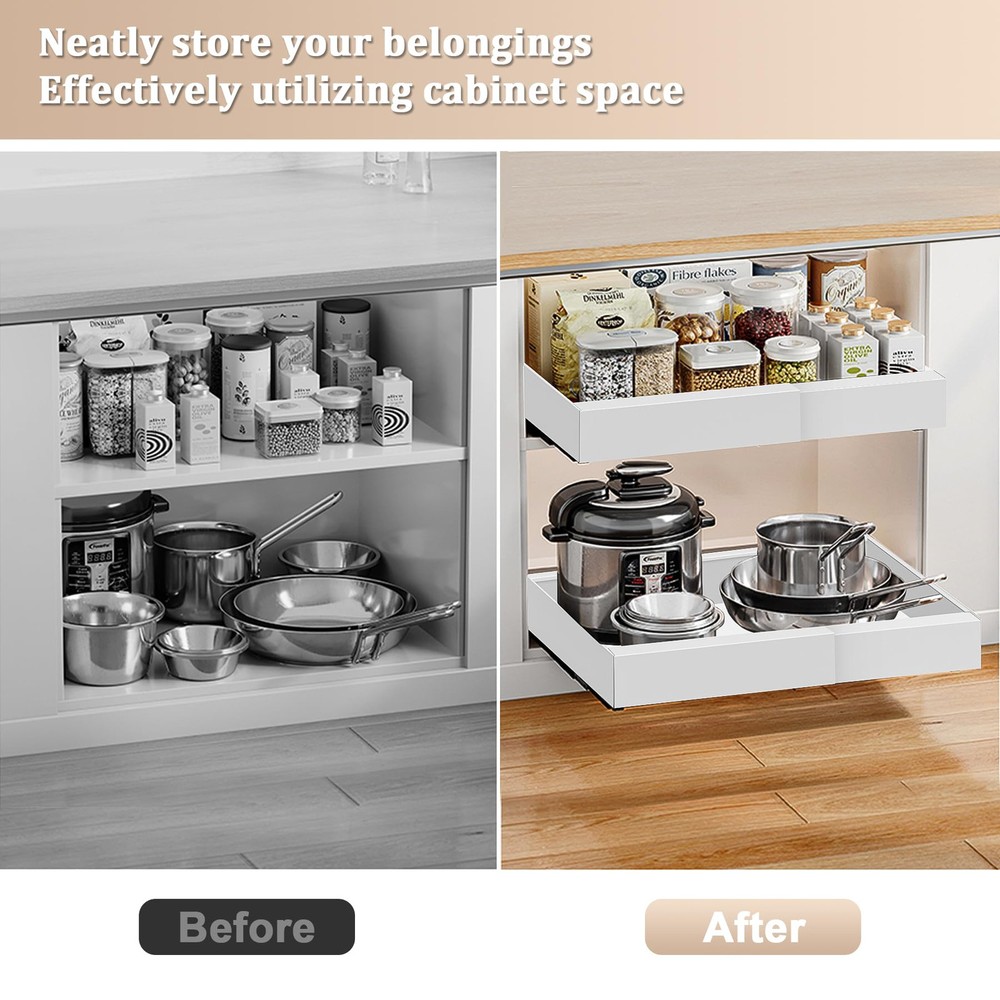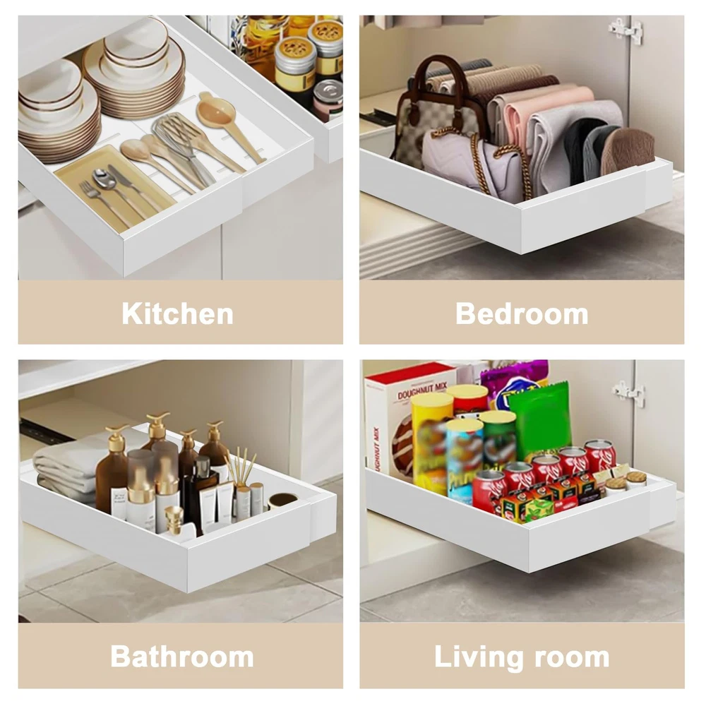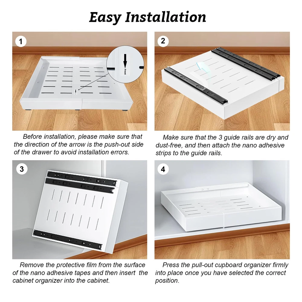 3 Track Expandable Drawer Organizers: Our pull out cabinet drawers features an advanced telescopic design with a 3-rail system, offering stronger load-bearing capacity compared to traditional 2-rail systems; The unique smooth cushioning track design ensures a quieter and smoother user experience Size & Compatibility: 12.2" to 20.5" Expandable Width, 17" Depth, 2.36" Height, slide out cabinet organizer with adjustable width optimizes cabinet space utilization, offering a more convenient retrieval experience; To ensure compatibility, please note that this drawer is suitable for cabinets with a width greater than 22" and a depth greater than 18"; This product is not suitable for framed cabinets No Need to Drill or Nail: Our pull-out home organizers don't require tedious drilling or screwing; Simply tear off the protective film on the 3 nano adhesive strips, stick them onto the 3 guide rails, and then insert the drawer into the cabinet, saving time and effort Heavy Duty and Easy to Clean: The expandable slide out drawer is made of durable carbon steel, which is sturdy and long-lasting; The surface is coated with high-quality paint, making it rust-proof; Easily clean with a damp cloth, and the hole design promotes air circulation Multi-Functional Storage Cabinet: This cabinet pull out shelves is suitable for various places such as the kitchen, bathroom, office, bedroom, pantry, and living room; It can store a variety of items, including spices, cookware, toiletries, clothing, and snacks, helping to create an organized and orderly space Tips: The nano adhesive strips are highly sticky, so please ensure the roll out drawer's pull-out side is facing outwards before installation; We have attached installation guide arrows on the pullout drawer surface to assist you; If you need any additional help, we will provide an excellent solution