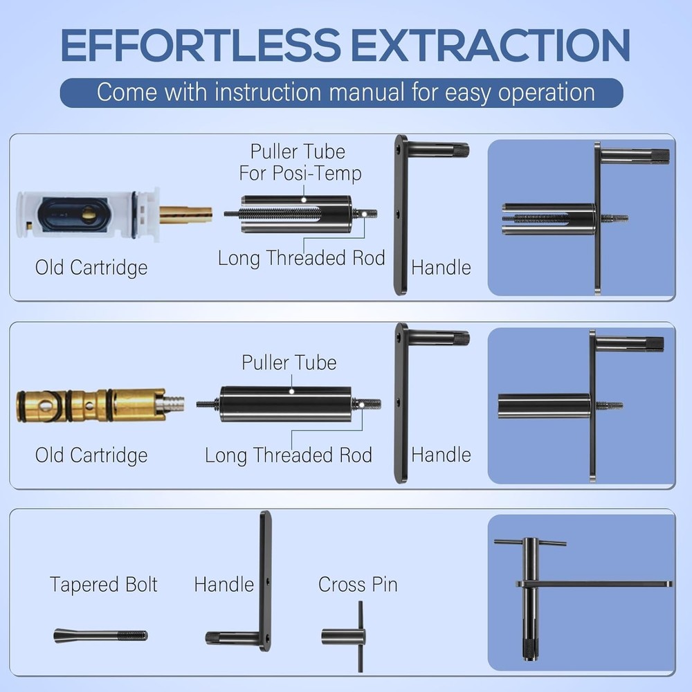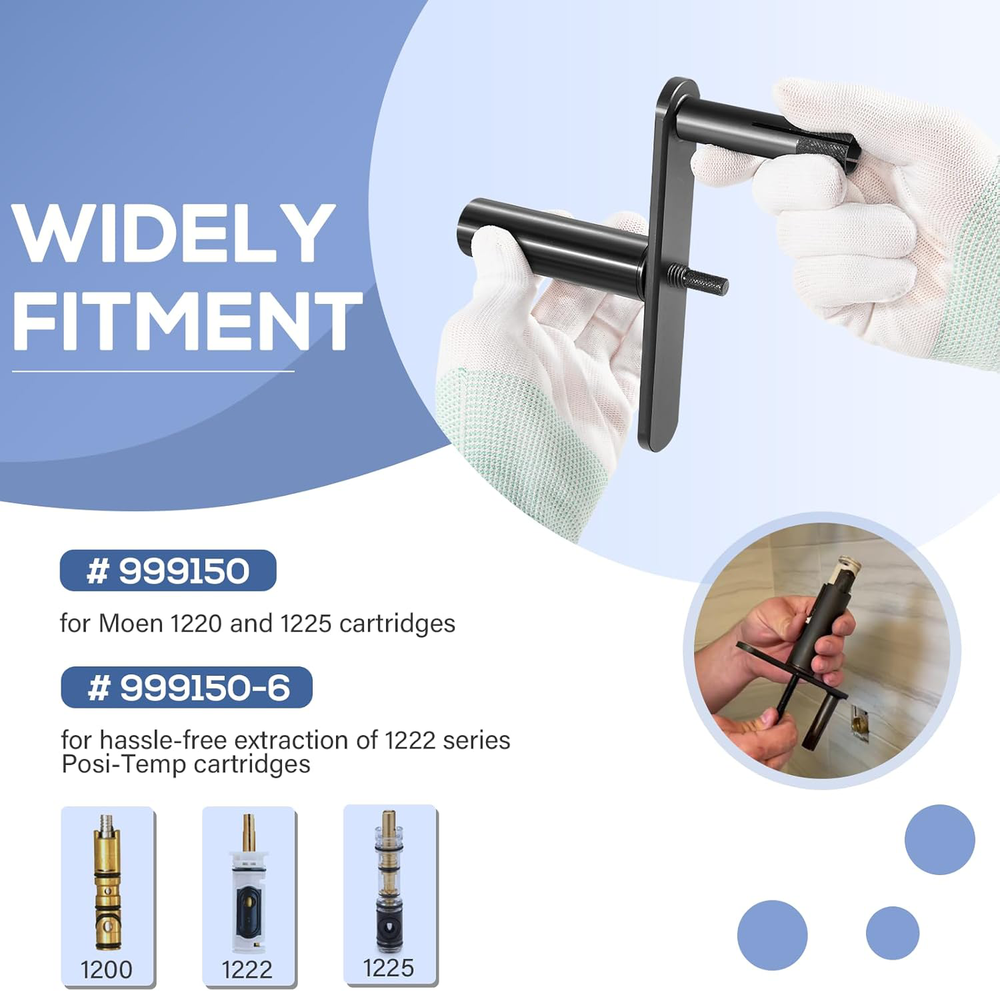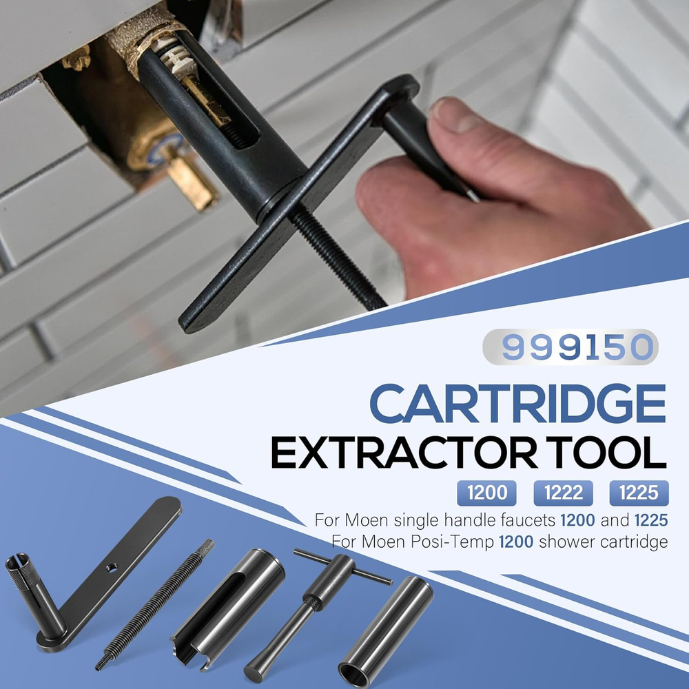 Puller Premier For Moen Cartridge Extractor Tool Posi-Temp 1222, 1225 and 1200 Features: Widely Fitment -- 999150 Shower cartridge puller tool fits for Moen single handle faucets 1200 and 1225, for Moen Posi-Temp 1200 shower cartridge. Innovative Design -- Features a unique threaded rod, sleeve, and crank system that eliminates the need for brute force, making the extraction process easier and safer for your plumbing fixtures. Effortless Extraction -- Say goodbye to the hassle of stuck cartridges! Designed for repeated use by professionals, our cartridge extractor tool allows for smooth, easy removal of frozen cartridges without excessive force. Jaga-tools In Search of Excellence! Puller Premier For Moen Cartridge Extractor Tool Posi-Temp 1222, 1225 and 1200 Puller Premier For Moen Cartridge Extractor Tool Posi-Temp 1222, 1225 and 1200 Features: Widely Fitment -- 999150 Shower cartridge puller tool fits for Moen single handle faucets 1200 and 1225, for Moen Posi-Temp 1200 shower cartridge. Innovative Design -- Features a unique threaded rod, sleeve, and crank system that eliminates the need for brute force, making the extraction process easier and safer for your plumbing fixtures. Effortless Extraction -- Say goodbye to the hassle of stuck cartridges! Designed for repeated use by professionals, our cartridge extractor tool allows for smooth, easy removal of frozen cartridges without excessive force. Comprehensive Kit -- Cartridge removal kit includes model # 999150 for Moen 1220 and 1225 cartridges, and model # 999150-6 designed for hassle-free extraction of 1222 series Posi-Temp cartridges. Excellent Quality -- Constructed from premium steel and finished with coating to prevent corrosion, rust and oxidation. Hardened construction offers high strength and impact resistance for long service life. Package Included: 999150 Shower Cartridge Removal Tool Item Specifics Brand JT-Motor Type Shower Cartridge Extractor Tool MPN 999150 Warranty 1 Year Material Stainless Steel Features Easy installtion Item Weight 2 pounds Color Black Set or dingle item Set Batteries Included No Batteries Required No Number in Pack 5 Payment Returns Jaga-tools In Search of Excellence! DESCRIPTION PAYMENT SHIPPING RETURN POLICY Puller Premier For Moen Cartridge Extractor Tool Posi-Temp 1222, 1225 and 1200 Puller Premier For Moen Cartridge Extractor Tool Posi-Temp 1222, 1225 and 1200 Features: Widely Fitment -- 999150 Shower cartridge puller tool fits for Moen single handle faucets 1200 and 1225, for Moen Posi-Temp 1200 shower cartridge. Innovative Design -- Features a unique threaded rod, sleeve, and crank system that eliminates the need for brute force, making the extraction process easier and safer for your plumbing fixtures. Effortless Extraction -- Say goodbye to the hassle of stuck cartridges! Designed for repeated use by professionals, our cartridge extractor tool allows for smooth, easy removal of frozen cartridges without excessive force. Comprehensive Kit -- Cartridge removal kit includes model # 999150 for Moen 1220 and 1225 cartridges, and model # 999150-6 designed for hassle-free extraction of 1222 series Posi-Temp cartridges. Excellent Quality -- Constructed from premium steel and finished with coating to prevent corrosion, rust and oxidation. Hardened construction offers high strength and impact resistance for long service life. Package Included: 999150 Shower Cartridge Removal Tool Payment Returns All rights reserved.