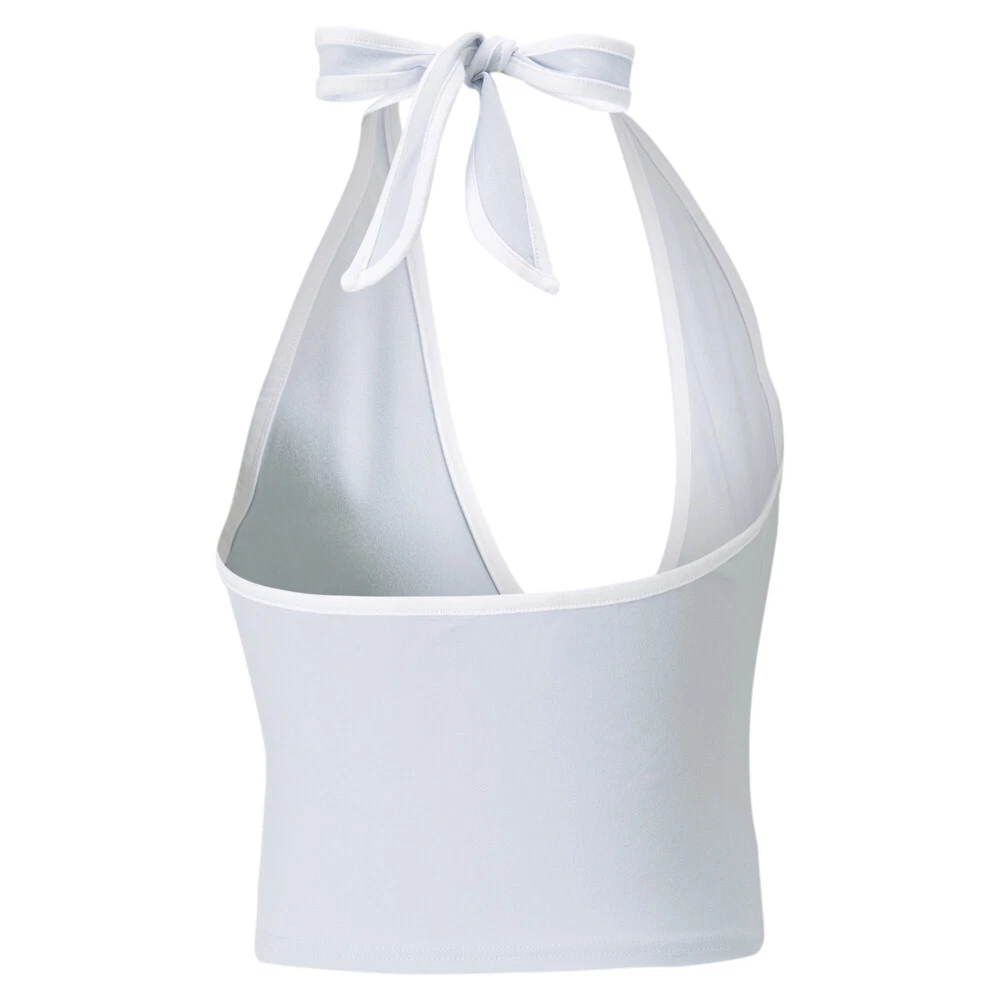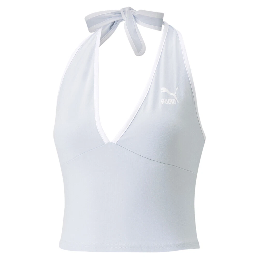 Classics Summer Resort Halterneck Top Product Details Tight fit Elastic halter neck tie construction Printed PUMA Archive No.1 Logo on left chest 93% cotton 7% elastane The essence of cool: This sleek halterneck from PUMA's Classics collection captures the spirit of simple, effortless style. Its sleek design puts the woman who wears it centre stage, creating a sleek silhouette that's sure to look on point whether you're on the street, at the gym or on the move. Sometimes basic is beautiful, too. Additional Details Color: Blue Occasion: Casual Gender: Womens Age: Adult Brand: Puma