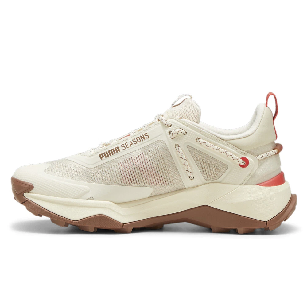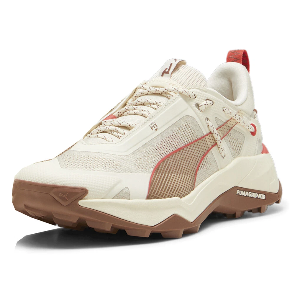 Explore Nitro Hiking Shoes Product Details Booty construction Mono-mesh upper Flared midfoot shape Toe drainage port OPTIFIT adaptive fit system designed to offer a secure lockdown and support during exercise Introducing our first hiking-specific shoe: the Explore NITRO. It's designed for all trails, from flat and gravelly to steep and rocky, with a combination of NITRO foam and PROFOAMLITE through the midsole maximising comfort over any terrain. Throw in a PUMAGRIP ATR outsole and a unique collar shape – complete with integrated, heel supporting lacing system – and you have your next trail companion. Get ready to tackle and terrain, no matter the season. Additional Details Color: Beige Occasion: Casual Gender: Womens Age: Adult Brand: Puma