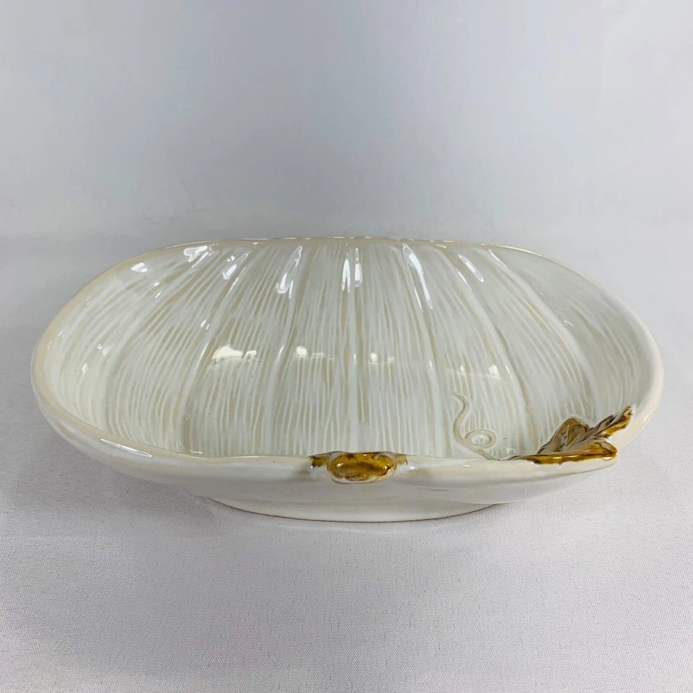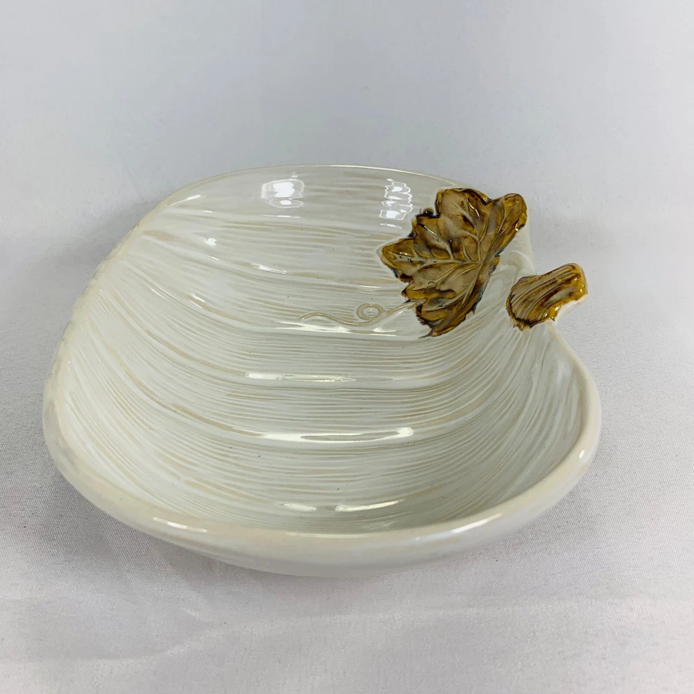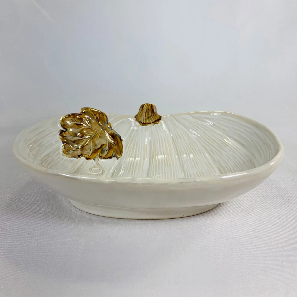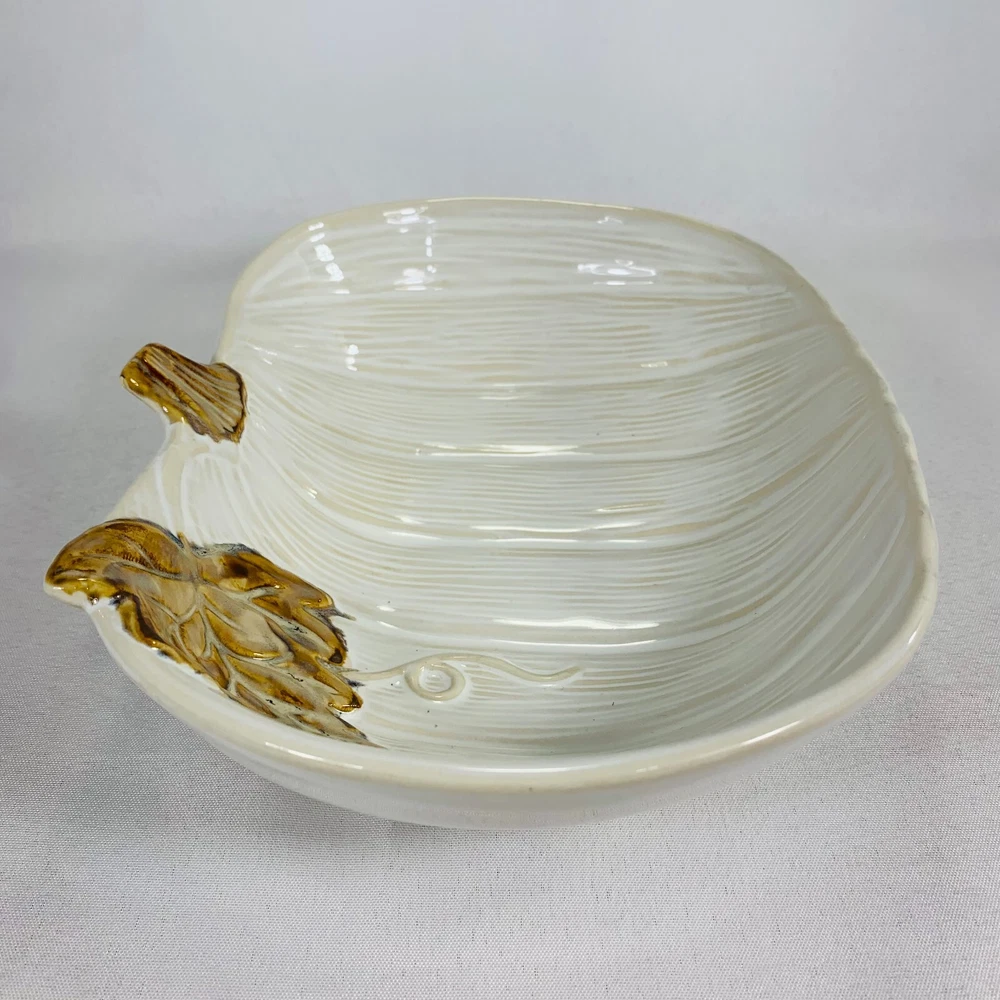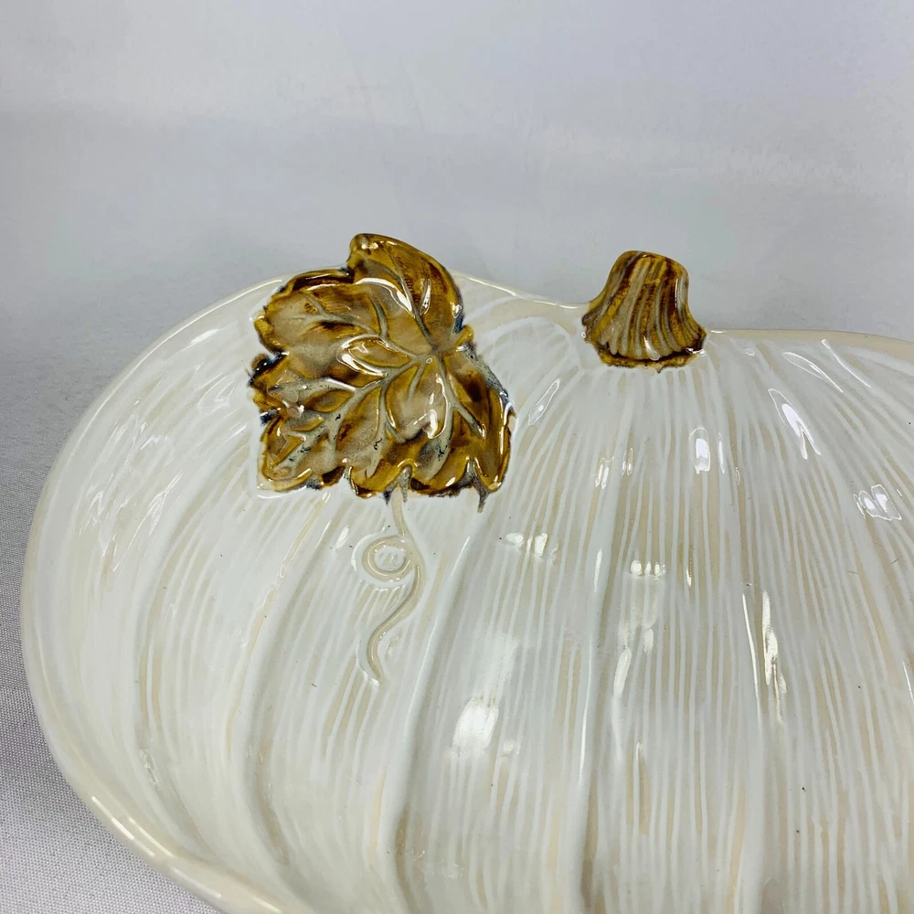This cream-colored figurine is the perfect addition to your Fall and Thanksgiving decor. The pumpkin shape and leaf design make it a great centerpiece for any table or shelf. Measuring at 10 inches, it is the perfect size for displaying candy, food, or other small items. It is a great gift for any occasion, especially Thanksgiving. We can do combined shipping! See what else you'd like from our store! πRetro and Beyond