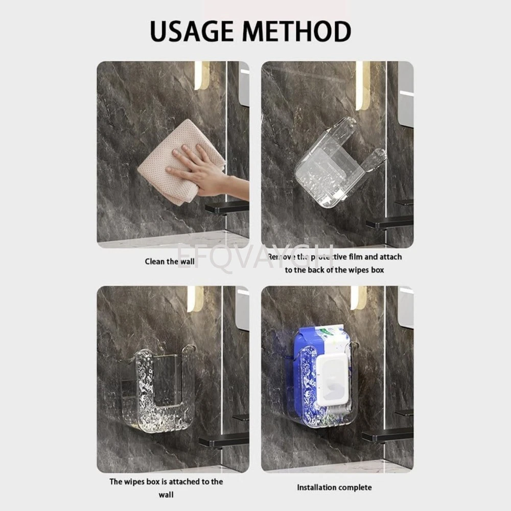 Product Description Kitchen Wipes Storage Box, Flushable Wipe Holders for Bathroom, Flushable Wipes Container for Bathroom, Kitchen Wipes Storage Box Wall Mount Features: -The top large opening is convenient for changing paper. -No drilling installation, no damage to the wall. -The paper does not get stuck and draws smoothly. -One object can be used in any scene. How to use: 1. Clean the walls. 2. Remove the protective film and attach it to the back of the wipes box. 3. The wipes box should be attached to the wall. 4. Installation is complete. Specification parameters: Product size: 4.92*4.52*3.26IN/12.5*11.5*8.3CM Product weight: 200g Product color: Transparent gray/Transparent white Material: Plastic