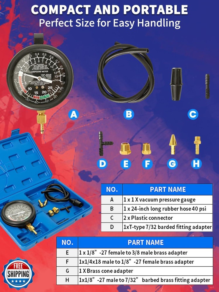 Punmew Vacuum Gauge Automotive Fuel Pump and Vacuum Tester Gauge Features Versatile Testing: The TU-1 Vacuum Gauge Automotive is designed for a range of diagnostic tests, including fuel pump output pressure is 0-14 psi/g, 0-1 kg/cm2. and Range of vacuum dials is 0-28in/Hg Vac, 0-70cm/Hg. Wide Application: This vacuum tester automotive is ideal for diagnosing fuel delivery pressure, carburetor intake manifold issues, and vacuum system problems in carburetor engines with mechanical fuel pumps operating below 14 PSI(1.0 kg/cm2) Comprehensive Kit: The fuel pressure tester kit includes a large 3-1/2" diameter gauge, a 24" long vacuum hose, and a variety of adapters suitable for most vehicles. Precise Readings: Use the vacuum gauge to check carburetor settings and valve adjustments, ensuring optimal engine performance. Convenient Packaging: Packed in a storage case, the vacuum gauge kit is easy to store and transport, with product instructions included for user guidance. Shipping Free & Fast Shipping: We offer free shipping to most of the USA with a normal delivery time of 3-7 days. However, due to the current situation, additional delivery time (up to 3 weeks) may be required for some items. Alternative Carriers: We may use alternative carriers (e.g., USPS, FedEx, UPS) to ensure your package arrives safely and on time. Due to the use of multiple carriers, we are unable to provide a tracking number automatically. Handling Time: Orders are processed and shipped within 1-2 business days of receiving cleared payment. Shipping Restrictions: Shipping to Alaska, Hawaii, Puerto Rico, Guam, and other US territories may incur shipping charges or delivery restrictions. Please contact us before ordering, or your order can be refunded/cancelled. State Restrictions: Certain items may not be shipped to California due to state regulations. Contact for Tracking Updates: If you require tracking updates or have any concerns about the delivery of your order, please feel free to contact us, and we will be happy to assist you. Return Policy 30-Day Hassle-Free Returns: If you are not completely satisfied with your purchase, you can return the item for free within 30 days of receiving it for a full refund or exchange. Easy Return Process: Contact us, and we will provide you with a prepaid return shipping label and detailed instructions. No Restocking Fee: There are no restocking fees for returns. However, the buyer is responsible for return shipping costs if the return is not due to a seller"s error. Refund Processing: Refunds will be processed within 1 business day of receiving the returned item in its original condition. Feedback Your feedback is extremely important to us. We strive to provide the best products and customer service possible. If you are satisfied with your purchase, please take a moment to leave us a positive review. If you have any concerns or issues with your order, please contact us before leaving negative feedback. We are committed to resolving any problems and ensuring your satisfaction. Contact Us If you have any questions or concerns, please feel free to reach out to our customer support team. You can contact us through the eBay messaging system. We are available Monday to Friday, 9:00 am to 5:00 pm EST, and we will do our best to respond to your inquiry within 24 hours. Thank you for supporting our small family business!