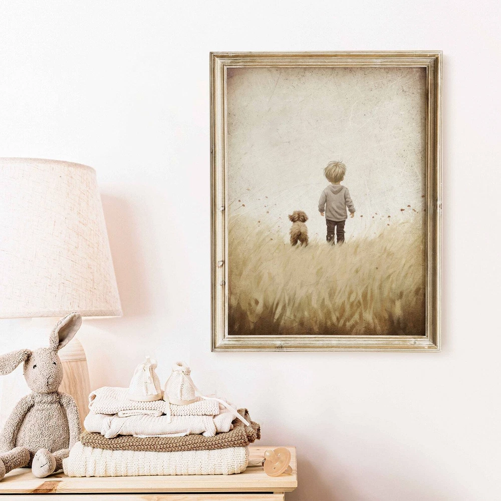 Puppy Nursery Print Boy And Dog Painting Toddler Room Decor Boy Dog Decor Nursery Boys Room Wall Art Dog Decor For Kids Material: Premium luster photo paper Print type: Inkjet printing One side printed + The finish provides the highest possible resolution and color saturation + Lasts up to 200 years in color and 400 years in black-and-white + Printed on high-quality resin-coated photo base paper medium + Posters can be hung with double-sided tape, tacks, or framed + Hand washing with a gentle cry cloth is recommended for extended durability I will hand select the best choice of paper for your chosen design to ensure top quality results for a beautiful, bright and luxurious print. All prints are sealed in cellophane slips for protection during transportation, and are shipped in a protective cardboard envelope.
