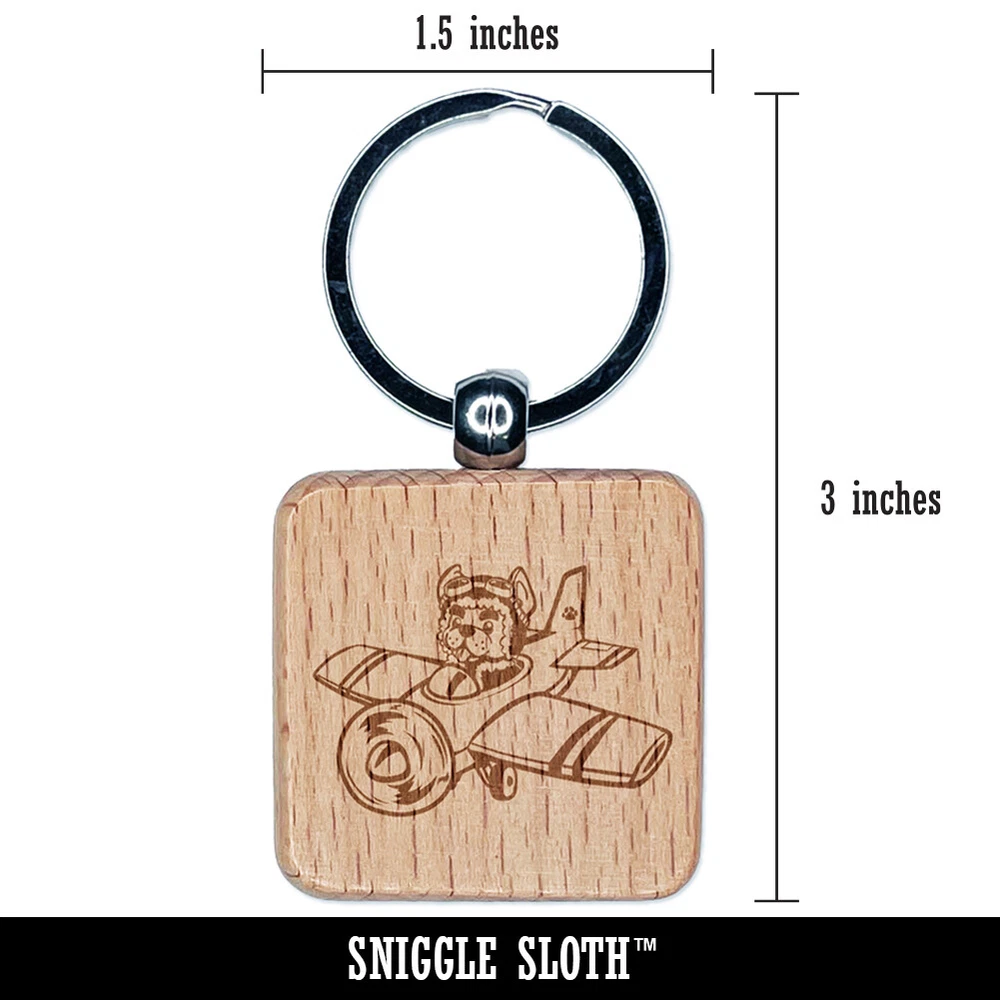 Puppy Pilot Dog in Airplane Engraved Wood Square Keychain Tag Charm