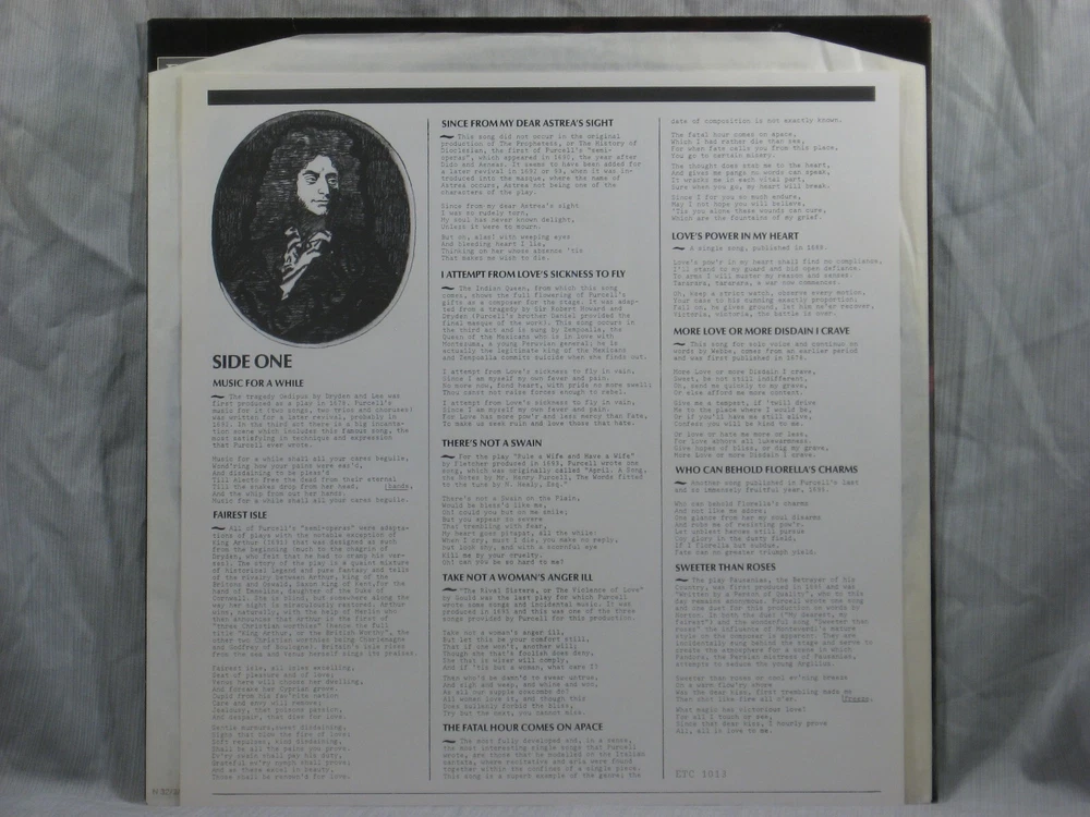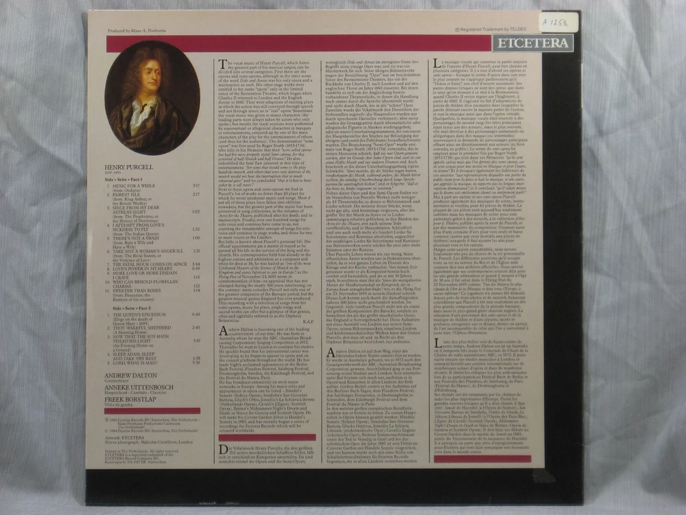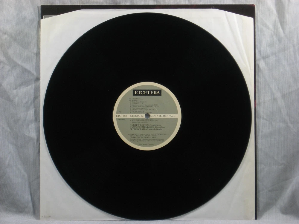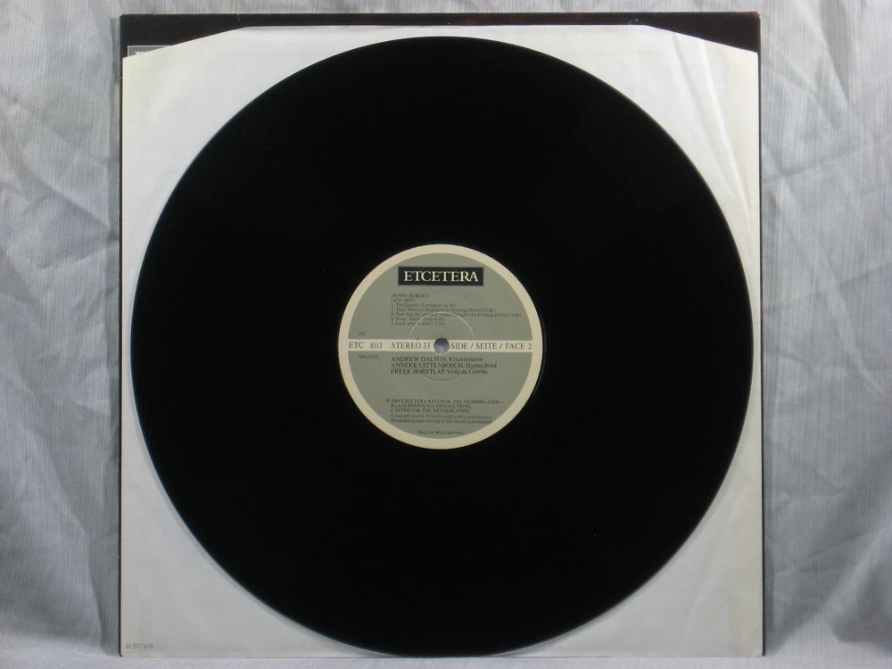 This 1984 Dutch import stereo album from EtCetera Records (ETC 1013) features performances of many works by Henry Purcell. Featured performers include Andrew Dalton (countertenor), Anneke Uittenbosch (harpsichord), and Freek Borstlap (viola da gamba). Album notes are in English, German, and French, written by Klaas A. Posthuma. Brief introductions and lyrics for each track are also provided on an insert sheet in English. The outer sleeve shows a small collection index sticker in the upper right corner of the back (Photo 2). Also included is a photocopy of a brief review of the album from the Sept/Oct 1984 issue of The Gramophone. This is one of many titles from an extensive collection of classical LPs and CDs that we will be listing here. All have been carefully stored for many years, played only on premium equipment, and show little to no wear. NOTES: Album sleeves may have a small index sticker, usually in the upper right corner of the back, which was applied when the album was first purchased for this private collection. Please be sure you know the Shipping charge to your address before bidding. See the Shipping and Handling section of this listing for all rates, including international Shipping charges. Please do not copy any part of this listing without permission.