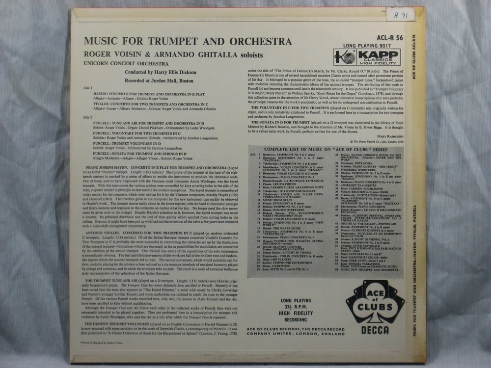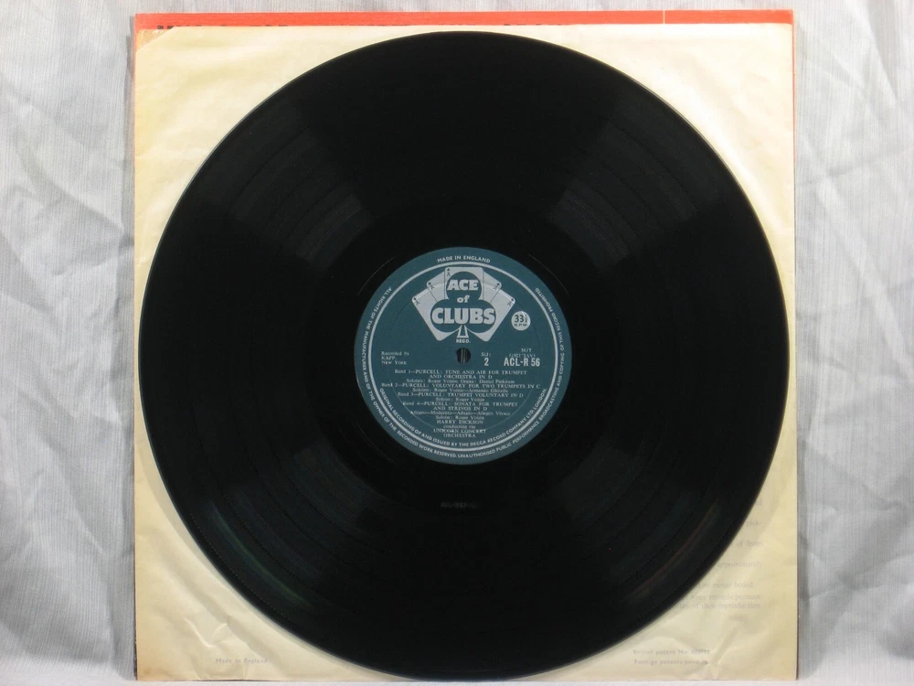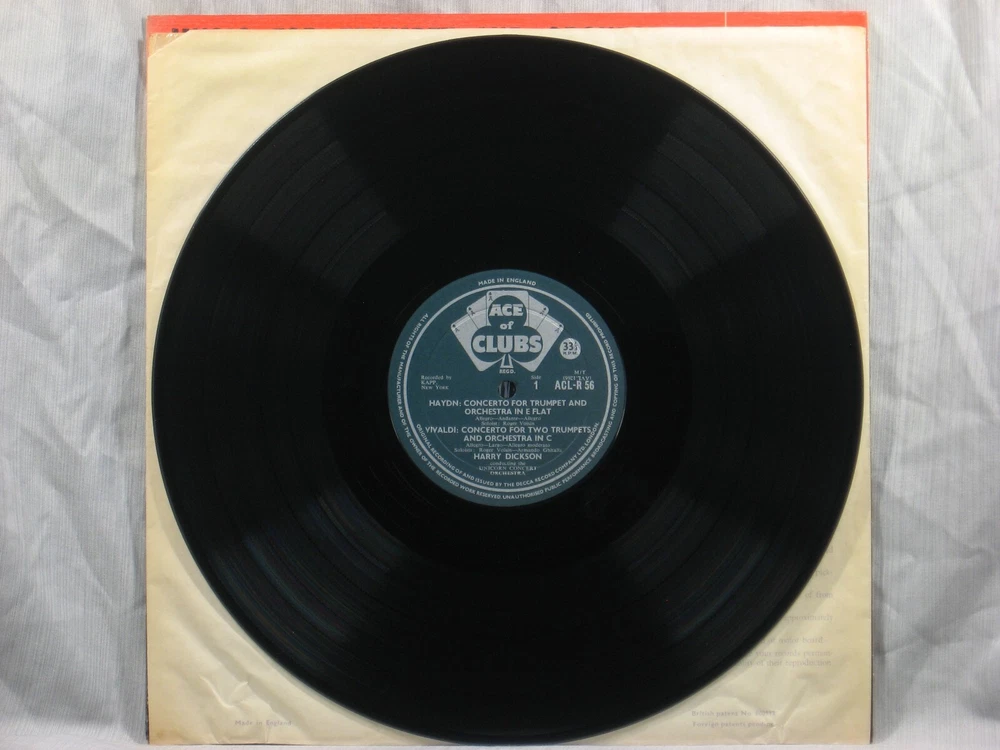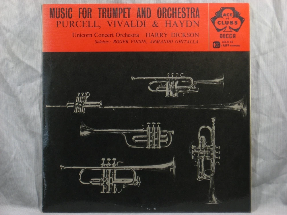 This 1959 British mono album from the Ace of Clubs label of Decca Records (ACL-R 56) features performances of works by Henry Purcell, Antonio Vivaldi and Franz Joseph Haydn. They are performed by the Unicorn Concert Orchestra conducted by Harry Ellis Dickson, with featured trumpet soloists Roger Voisin and Armando Ghitalla. Album notes are in English by Mary Rasmussen. The outer sleeve shows a small collection index sticker in the upper right corner of the back (Photo 2). This is one of many titles from an extensive collection of classical LPs and CDs that we will be listing here. All have been carefully stored for many years, played only on premium equipment, and show little to no wear. NOTES: Album sleeves may have a small index sticker, usually in the upper right corner of the back, which was applied when the album was first purchased for this private collection. Please be sure you know the Shipping charge to your address before bidding. See the Shipping and Handling section of this listing for all rates, including international Shipping charges. Please do not copy any part of this listing without permission.