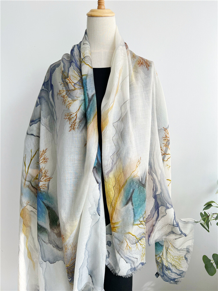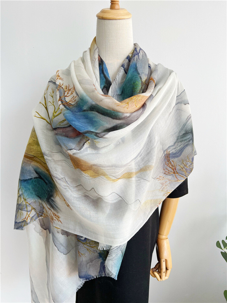 Pure 300s Cashmere Scarf Wrap Shawl 78x39 in Cloud Mountain Fog Sea Print