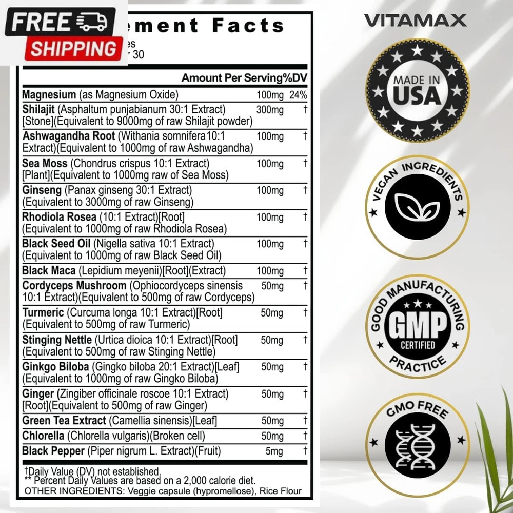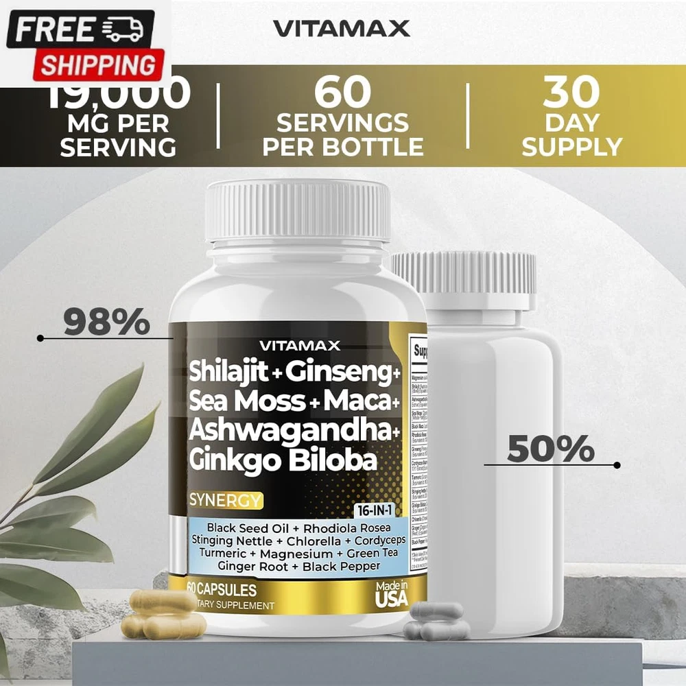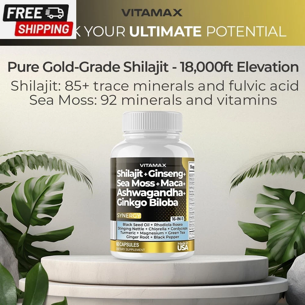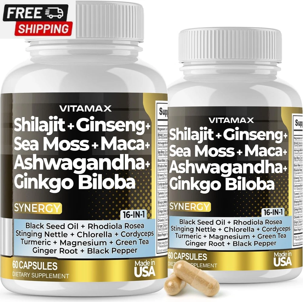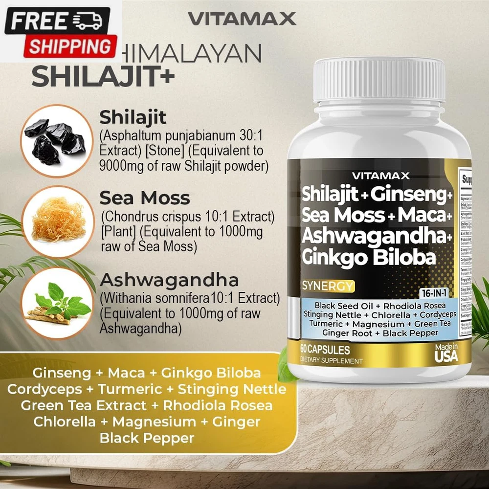 Pure Himalayan Shilajit Supplement 10,000Mg Ashwagandha 6,000Mg Sea Moss 2,000Mg Rhodiola Rosea 1000MG Gingko Biloba 500Mg Trace Mineral Capsules - Men and Women – Made in USA (60 Count (Pack of 1)) Rare Shilajit from 18,000ft: Unlike many other forms of Shiljajit, Vitamax's Nature's Synergy Shilajit is sourced from mountain peaks reaching 18,000ft, ensuring the purest and most potent grade Shilajit. Common in Ancient Ayurvedic traditions, Shilajit, combined with 15 other powerful ingredients, helps support our daily needs and enhances mineral absorption. Nature's Synergy Formula: Gold-grade Shilajit capsules, a Gilgit-Baltistan Himalayan Mountains marvel enriched with 80+ trace mineral supplements like iron, calcium, magnesium, zinc, and fulvic acid. Sea Moss, boasting 92 essential minerals and vitamins in one supplement, helps support our natural immune system and energy levels. Advanced Shilajit Capsules: For men and women. Pure organic shilajit is a centuries-old treasure from the Himalayas that nourishes our mind and body with rare and essential minerals and fulvic acid. This elixir of vitality, paired with Ginkgo Biloba, Rhodiola Rosea, Ashwagandha Extract, Panax Ginseng Extract, Stinging Nettle, Cordyceps Mushroom, and Turmeric, offers a vitalizing boost to our body's natural healing process. Trusted Quality: Quality is our utmost priority. Our supplements undergo rigorous third-party lab testing in the USA, ensuring premium quality and purity. Formulated meticulously in a GMP-certified facility, our capsules contain no unnecessary preservatives or fillers. They are always made in the USA. Product Description Shipping Fast shipping is very important for us. Our standard US shipping service is FREE. Your order will be shipped within 2-3 business days upon full payment received. Your order will be delivered within 2-3 business days after the handling time. We only ship to the confirmed PayPal address. We reserve the right to cancel any order for any reason at any time. We are not responsible for undeliverable addresses. Returns and payment We offer a 30 days return policy from checkout winning date. We allow only PayPal as payment method FeedBack Your feedback very important to us, after you get your package and you are satisfied with our service please leave us positive feedback If you have any problem with your order / any questions please before leave any type of feedback For any questions, using eBay contact system Please visit our eBay store to check out other items for sale! Thank you for shopping at our store.