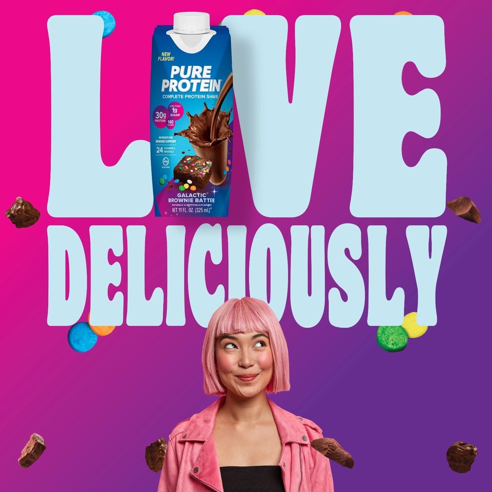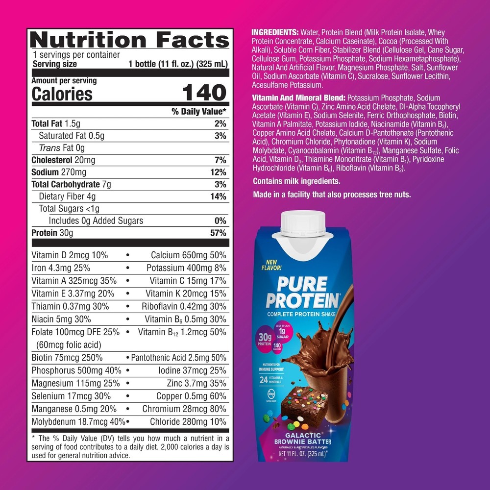 Elevate your fitness journey with Pure Protein Galactic Brownie Batter Shakes, the ultimate blend of taste, nutrition, and convenience. Each serving delivers a powerful 30 grams of complete protein, providing your body with the essential building blocks needed for muscle growth and recovery. Whether you're aiming to build lean muscle or maintain your current fitness level, these shakes are designed to support your goals effectively and deliciously. (1) Pure Protein products contain 5g of sugar or less. (2) Not suitable for people with galactosemia. HIGH PROTEIN, LOW SUGAR(1), GREAT TASTE: Enjoy the delicious, low-fat, non-GMO Pure Protein Galactic Brownie Batter Shakes. These shakes are designed to support muscle strength and are gluten-free, with only 140 calories, 24 vitamins and minerals—vitamins A, C, D, and E plus Zinc for immune health—and less than 1g of sugar 30G OF COMPLETE PROTEIN: Each serving of Pure Protein Galactic Brownie Batter Shakes delivers 30g of high-quality protein, providing the essential building blocks your muscles need to grow and recover. Achieve your fitness goals with this complete protein source MADE WITH MILK PROTEIN ISOLATE: These highly digestible shakes are suitable for those who are lactose conscious(2). The milk protein isolate provides all 9 essential amino acids for optimal muscle support and is ultra-filtered for more protein with fewer calories and less sugar KETO-FRIENDLY FOR A HEALTHY LIFE: Pure Protein Galactic Brownie Batter Shakes are perfect for both women and men focused on fitness. Whether your goal is muscle gain or getting lean, these shakes offer sustained energy to help you succeed RICH GALACTIC BROWNIE BATTER FLAVOR: Indulge in the rich, creamy taste of a Galactic Brownie Batter milkshake. Perfect for a pre- or post-workout boost, or as a convenient protein-packed treat any time of day GREAT ON THE GO: Stay on track even when you're pressed for time. Combine Pure Protein Galactic Brownie Batter Shakes with a healthy snack like fruit or vegetables to fuel your body with the nutrients and all 9 essential amino acids it needs to power through your day