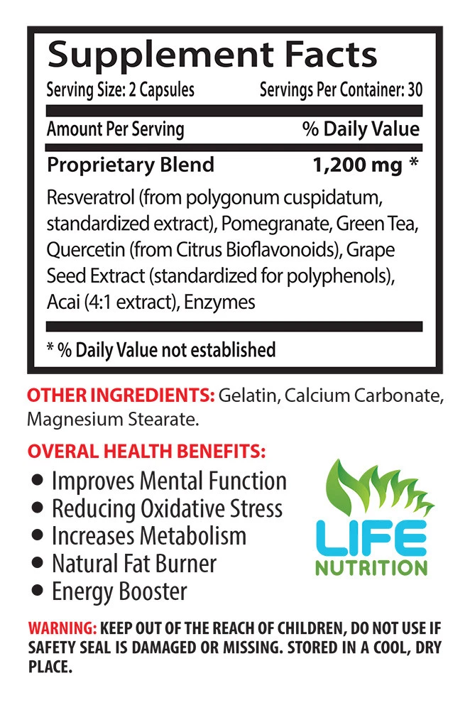 Pure Resveratrol 1200 Anti-Aging - Resveratrol Supreme (2 Bottle 120 Caps) The Red Wine Paradox One of the reason resveratrol has come to light as a positive force of nature is through wine. There aren't many foods that come to you without first being oxidized. Why do they say eat your fruits and veggies? Well for the most part they both come with a skin that protects the real value. Resveratrol is a polyphenolic compound found in red wine, grapes, peanuts, cacao beans, Japanese knotweed, and some berries. Resveratrol is produced by these plants in response to stresses, including infection, drought, and ultraviolet radiation. Though resveratrol has been shown to prevent the growth of cancer cells in some animals and it has increased the lifespan of fish and mice fed a high-calorie diet, little is known about the effects of resveratrol in humans. Despite the fact that some of the animal experiments used unrealistically high doses, resveratrol has garnered widespread scientific interest and researchers continue to study the substance, even while they disagree about which signaling pathways it activates. Powerful Antioxidants The antioxidant resveratrol that is found in red wine activates an ancient stress response mechanism in human cells that guards against DNA damage, say scientists at The Scripps Research Institute. Their research helps explain the health benefits attributed to the chemical, commonly found in the skins of dark grapes and wines made from these grapes. Efficacy and Benefits for Healthy Aging Numerous scientific publications and a growing body of clinical research support Resveratrol’s role in healthy aging. Its health benefits include: Maintenance of a healthy cardiovascular system Support of healthy blood glucose and blood pressure levels Maintenance of healthy neurocognitive function Reduction of oxidative damage common with aging The metabolic benefits of calorie restriction Increase of fat oxidation and storage capacity in muscles Ingredients: Serving Size: 2 Capsules Servings per container: 30 Proprietary Blend 1,200 mg Resveratrol (from polygonum cuspidatum, standardized extract), Pomegranate, Green Tea, Quercetin (from Citrus Bioflavonoids), Grape Seed Extract (standardized for polyphenois), Acai (4:1 extract), Enzymes. To ensure that our Formula contains best ingredients, we meticulously analyze every batch in our labs to guarantee the highest quality. Directions Take one capsule twice daily 30 minutes before meals with an 8oz glass of water. *These statements have not been evaluated by the Food and Drug Administration. Feedback From Buyer Date/time fast shipping ........... c*******************y ( 2253 ) 2017-02-02 05:13:02 ok d******n ( 563 ) 2017-02-01 21:40:45 A+ i*********m ( 2539 ) 2017-02-01 19:19:16 Fantastic service, quality. price, and fast shipping g******5 ( 197 ) 2017-02-01 17:08:32 Received. Thank you s*********1 ( 919 ) 2017-02-01 10:17:26 Fast service, Thanks!!! s*******2 ( 200 ) 2017-02-01 01:40:09 excellent transaction! t*************y ( 604 ) 2017-01-31 23:35:25 till tryiong but so far i like i**********p ( 169 ) 2017-01-31 20:41:29 It works awesome r*******e ( 76 ) 2017-01-31 20:30:20 fast ship +++++++++++++++++++++++++ r****c ( 1004 ) 2017-01-31 16:54:02 As described, Well packaged, fast shipping, Thanks! l************1 ( 298 ) 2017-01-31 14:08:37 Great deal, fast shipping. Thx 4******g ( 198 ) 2017-01-31 03:43:19 here w*****1 ( 1538 ) 2017-01-31 02:34:54 Quickly shipped, would buy from again, awaiting results, hopefully positive. 7***********2 ( 514 ) 2017-01-31 00:42:54 Great service 👌🏾 b*********6 ( 217 ) 2017-01-30 23:32:06 have not used enough of product to comment p*********4 ( 611 ) 2017-01-30 19:17:46 Really fast shipping nice product. l************1 ( 373 ) 2017-01-30 15:25:22 Thank you... n******3 ( 356 ) 2017-01-30 13:39:29 received the product... Thank you!! k******s ( 148 ) 2017-01-30 13:01:07 Very happy with this item b********2 ( 639 ) 2017-01-30 03:29:51 great seller fast delivery a************2 ( 1039 ) 2017-01-30 02:17:47 perfect b*********4 ( 538 ) 2017-01-29 20:43:03 Aaa 6*******3 ( 326 ) 2017-01-29 20:33:58 Very fast shipping !!! Great deal 😀 c*********9 ( 343 ) 2017-01-29 19:22:01 Thanks c****************k ( 834 ) 2017-01-29 17:34:29 GREAT QUALITY SUPPLEMENT