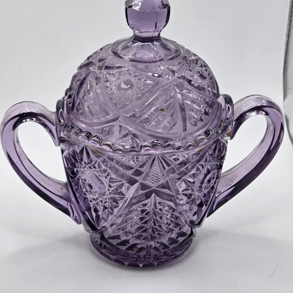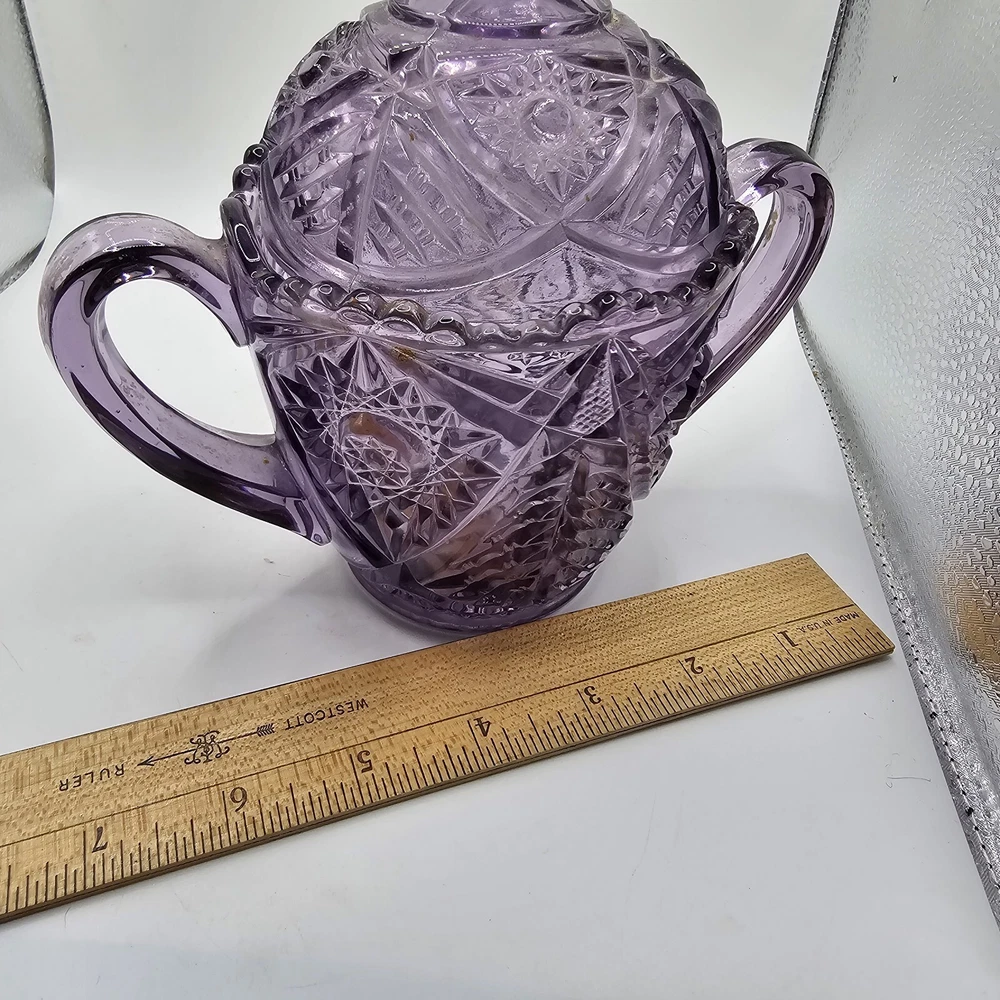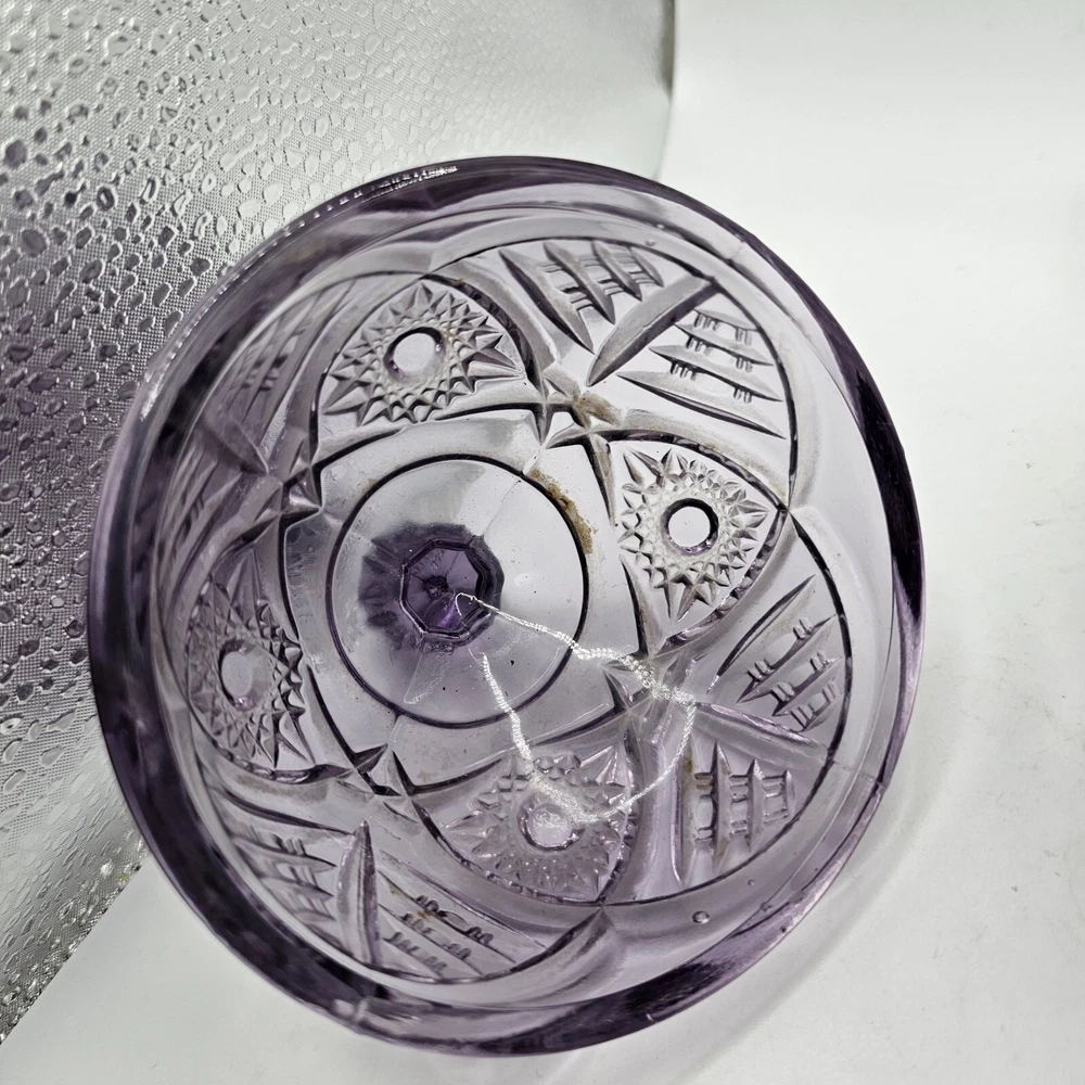 This vintage candy dish is a stunning addition to any collection. The ornate design features an etched cut glass lid and is made of high-quality glass material. The dish is perfect for storing candies, nuts, or other small items. The brand is unmarked, adding to the unique and timeless appeal of the piece. The production style is cut glass, a technique that adds depth and texture to the dish. The purple color is rich and vibrant, making it a standout item on any tabletop. This candy dish is a must-have for collectors of vintage glassware. There is a rough edge along rim... feels like chipping. Sold as is