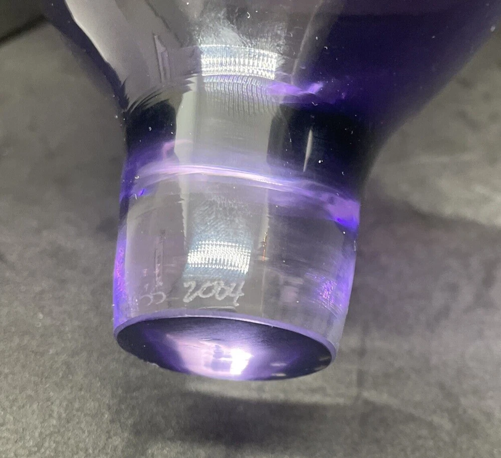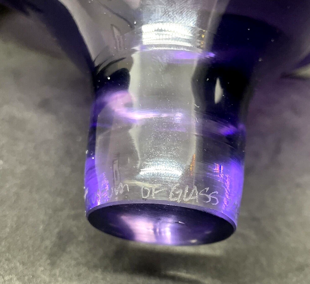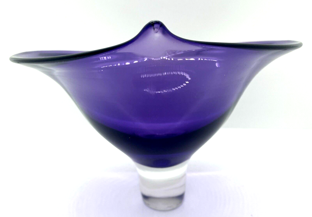Purple Heart Art Glass Centerpiece Pedestal Bowl Mueseum of Glass Signed 2004 Valentines This art glass piece is in excellent pre owned vintage condition. There are no chips or cracks. It measures 6' x 7.5". Please note the photos for detail.