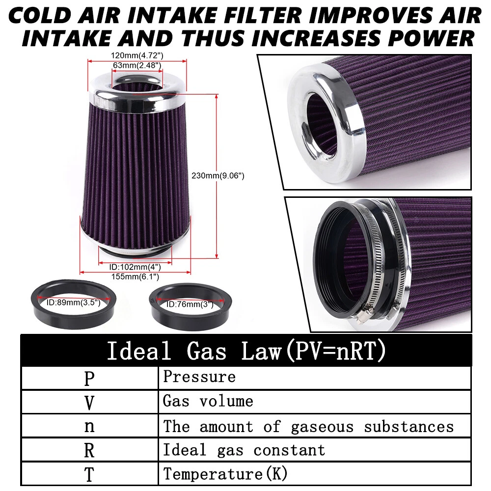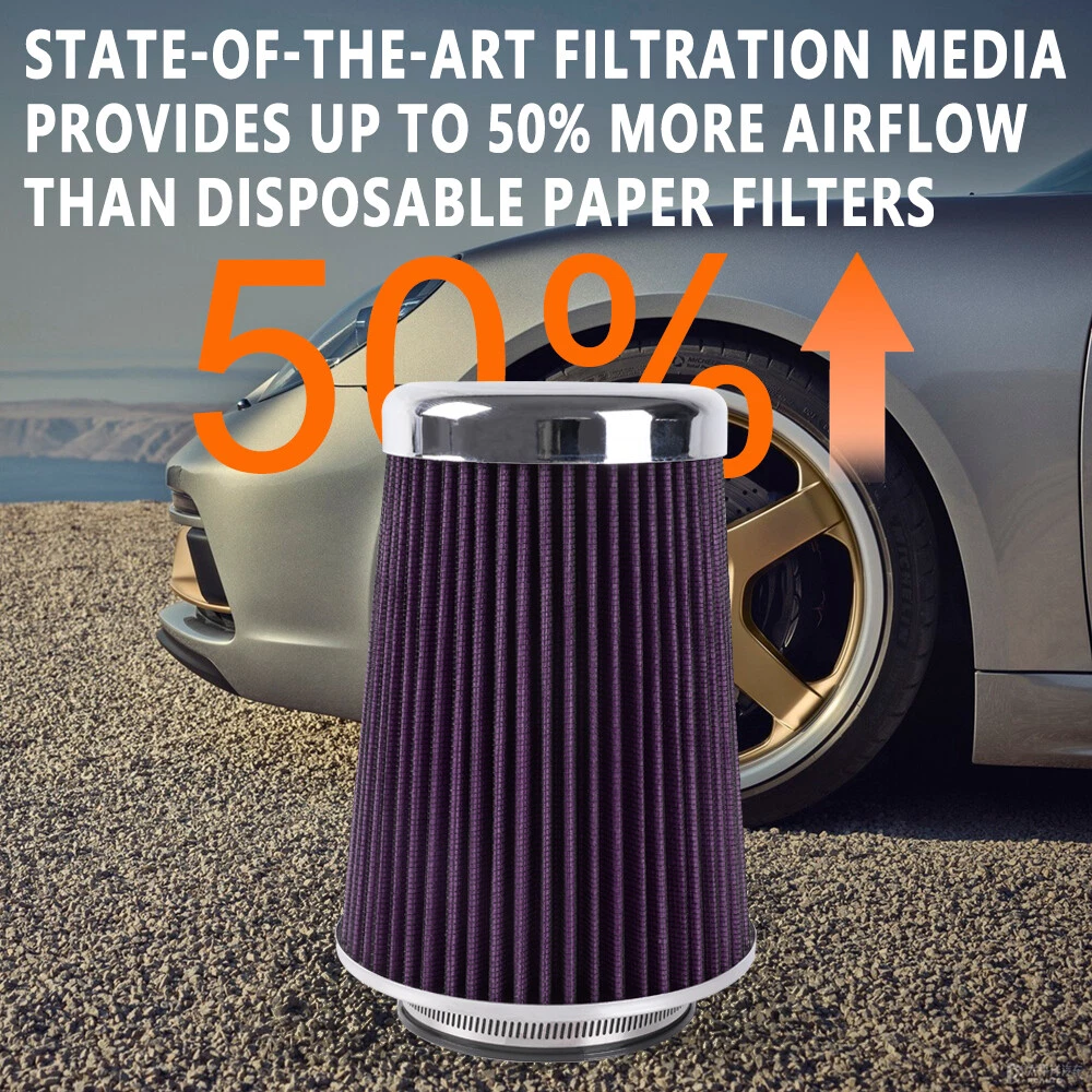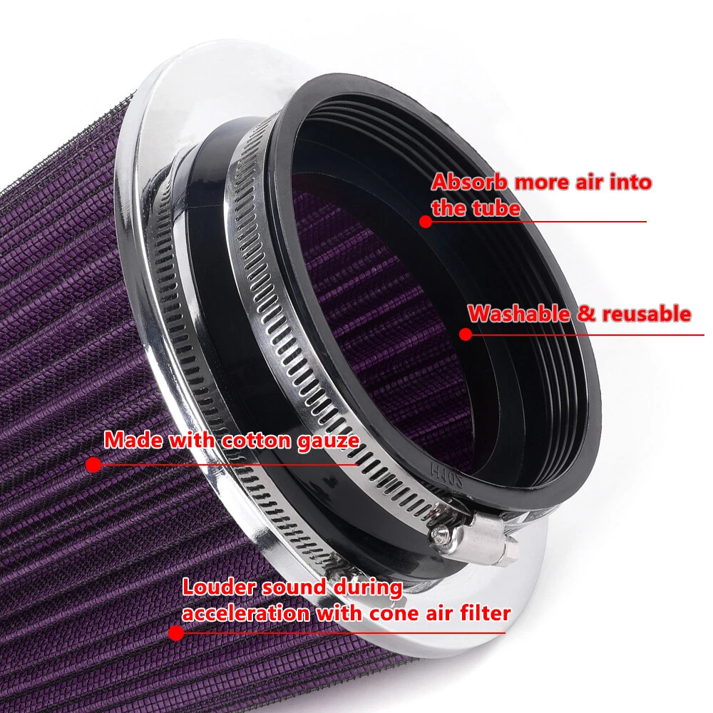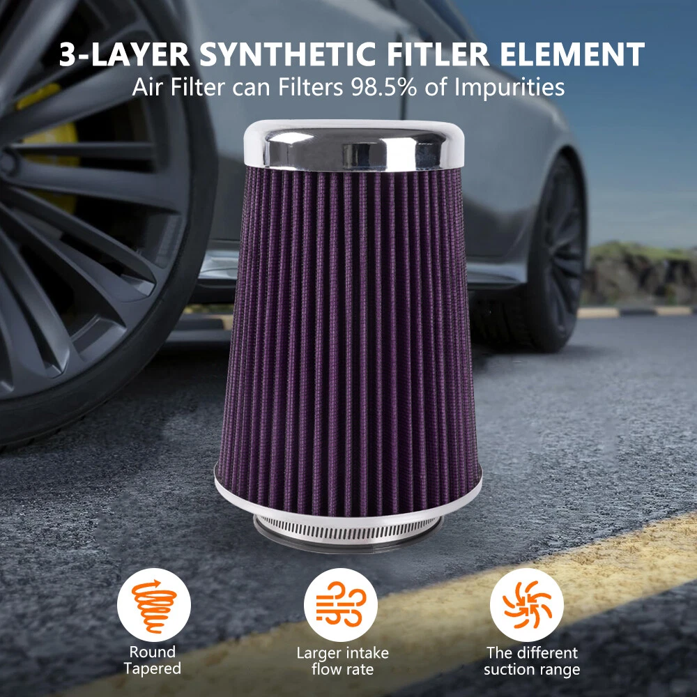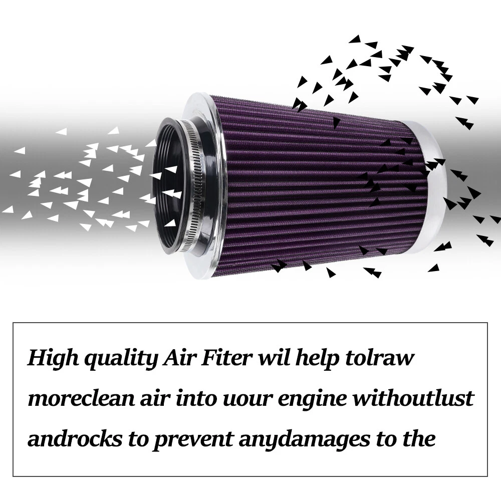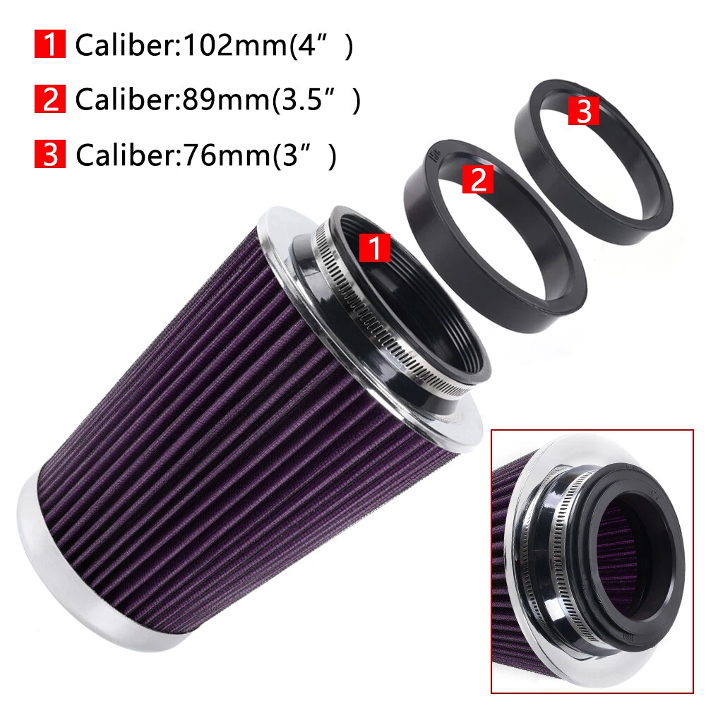 Purple High Flow Cold Air Intake Air Filter Replacement 3",3.5",4"Inlet, 9" Tall SPECIFICATIONS: Type: Air Filter Material: Non-woven Fabric +Rubber + Metal Air Filter Type: Dry Air Filter Style: Round Tapered FEATURES: 100% Brand New and Never Used or Installed Increase horsepower, torque and improve the gas mileage. It universally fit for any 3inch/3.5inch/4inch air intake hose. The high flow air filter help engine to draw more cooler air resulting in better throttle response & higher explosive horsepower output. It comes with a washable and reusable cone air filter and a clamp. Filter consisted of 2 layers to double the filtration efficiency. PACKAGE INCLUDE: 1 x Air Filter 1 x Clamp 2 x Rubber Ring Adapters All accessories in the picture are included. NOTE: 1.Please confirm your address is correct 2.Please check the size measurement and the picture carefully before making payment. 3.Please allow 0.5-1 inch difference due to manual measurement. (1 inch=2.54cm) 4.Due to the difference between different monitors, the picture may not reflect the actual color of the item. Please understand, Thank you. SHIPPING INFORMATION PAYMENT WARRANTY ABOUT US CONTACT US SHIPPING INFORMATION We will only ship this item to buyers by Normal Mail, please confirm your address is correct, and if you want to change the delivery address, just feel free to contact us when you purchase. Usually, we will ship the orders out and upload the tracking number within 1-2 business days(Monday to Saturday from 8:30am-5:30pm) after you complete the payment. PAYMENT We will only accept eBay payment. Please pay using eBay payment ONLY within 7 days from the date of transaction be made. WARRANTY Please inspect your order upon receipt.No damage claims will be honored after 14 days of delivery. All item we sold come with 90 days defective warranty from the date. ABOUT US We are a powerful factory producing auto parts,and we have a professional sales and after-sales team that can provide you with excellent products and services. CONTACT US For any reason you want to contact us,We aim at satisfying every visitor, no matter what kind of situation you meet with, we will be right here to serve you. Please contact our team. If you are happy with the transaction with us, leaving us an ALL-5-STAR positive feedback would be greatly appreciated. Have a good shopping.
