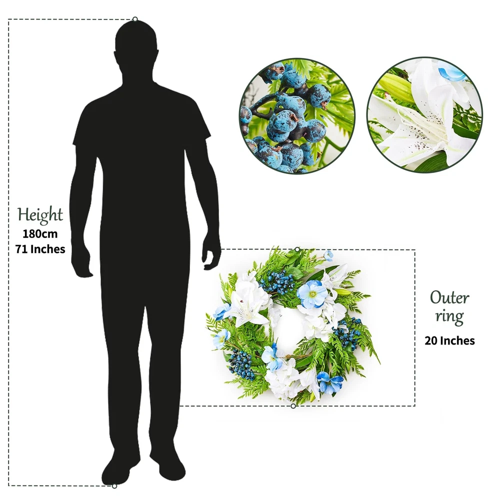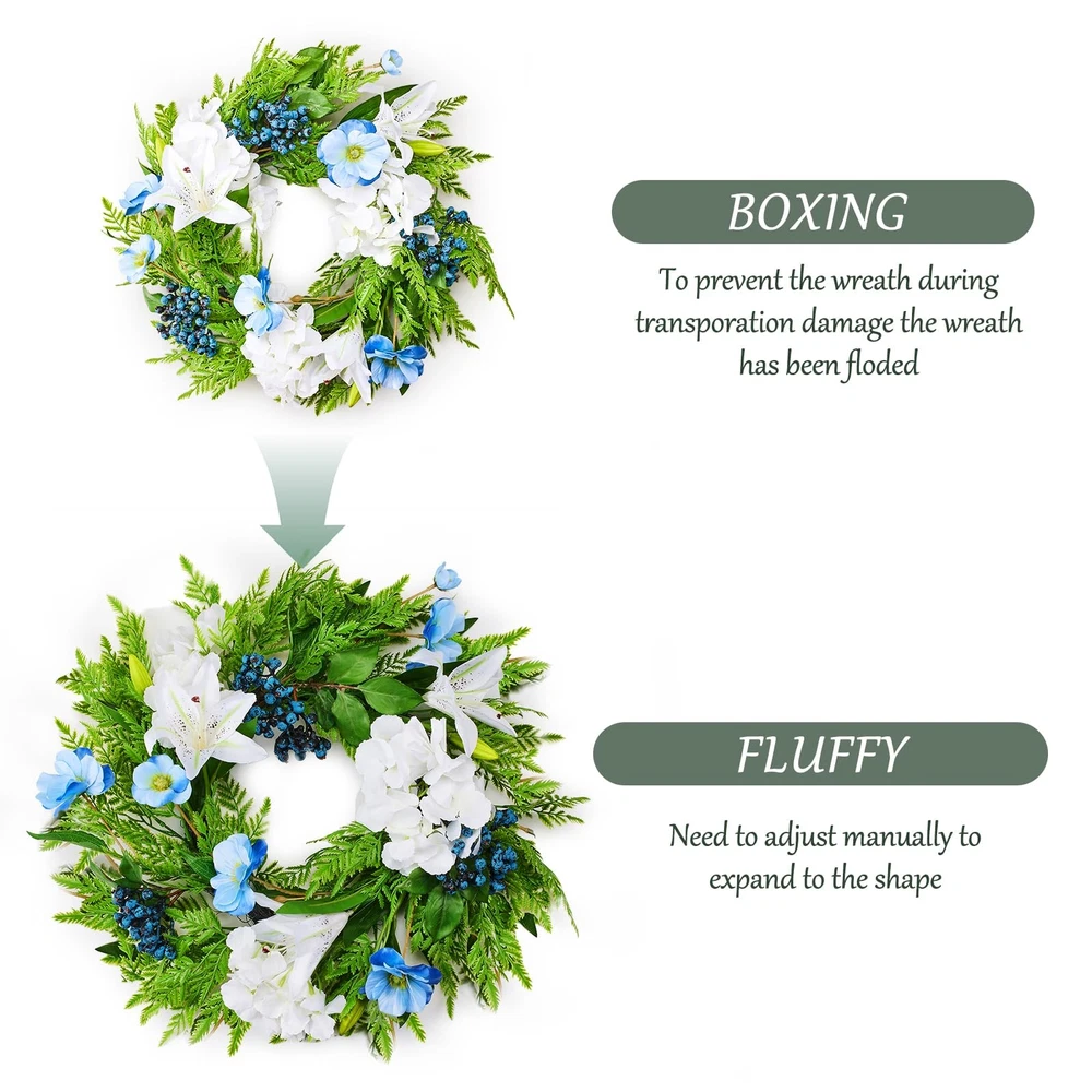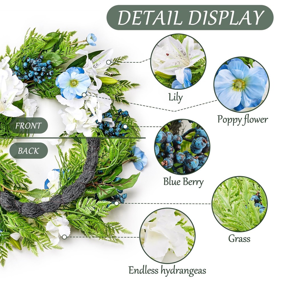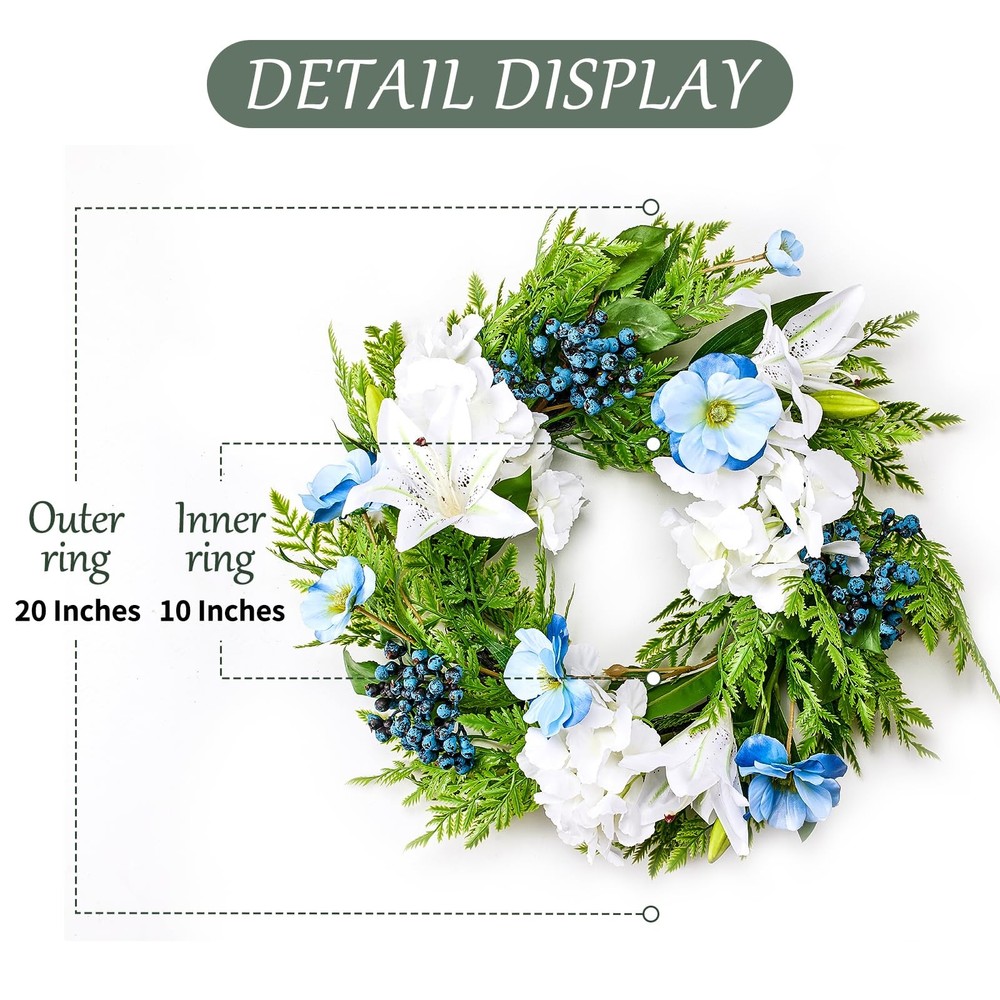 Spring Summer Wreath for Front Door with Purple Poppy,Lily, 20 inches Blue Berry Indoor Outdoor Farmhouse Wall Holiday Decor Festival High-quality Material: This artificial Spring wreath is made of silk which can be used all year round, the colors are fade-resistant and look more vivid and colorful. Our spring wreath is 100% handcrafted and that are not easy to fade or break Unique Design: This Spring front door wreath is decorated with a full circle of fake Poppy,pansy flower,ivy leaves,rose leaf,fern leaves, creates a romantic look that makes for a wonderful style for spring door decoration. Elegant and vivid colors make for timeless seasonal home décor Perfect Size: The outer diameter is about 20", the inner diameter is about 10", perfect size for indoor and outdoor decoration.You can place anywhere . Easy Maintenance: Highly realistic handmade artificial wreath makes it durable and requires no special maintenance. Just wipe it with a wet tissue or towel to keep it neat Multi-occasions: The wreath can be used indoor or outdoor, place it on your front door, or hang it above your fireplace. It's also perfect for decorating weddings, birthdays, stages, bedrooms, offices, dining rooms, and others