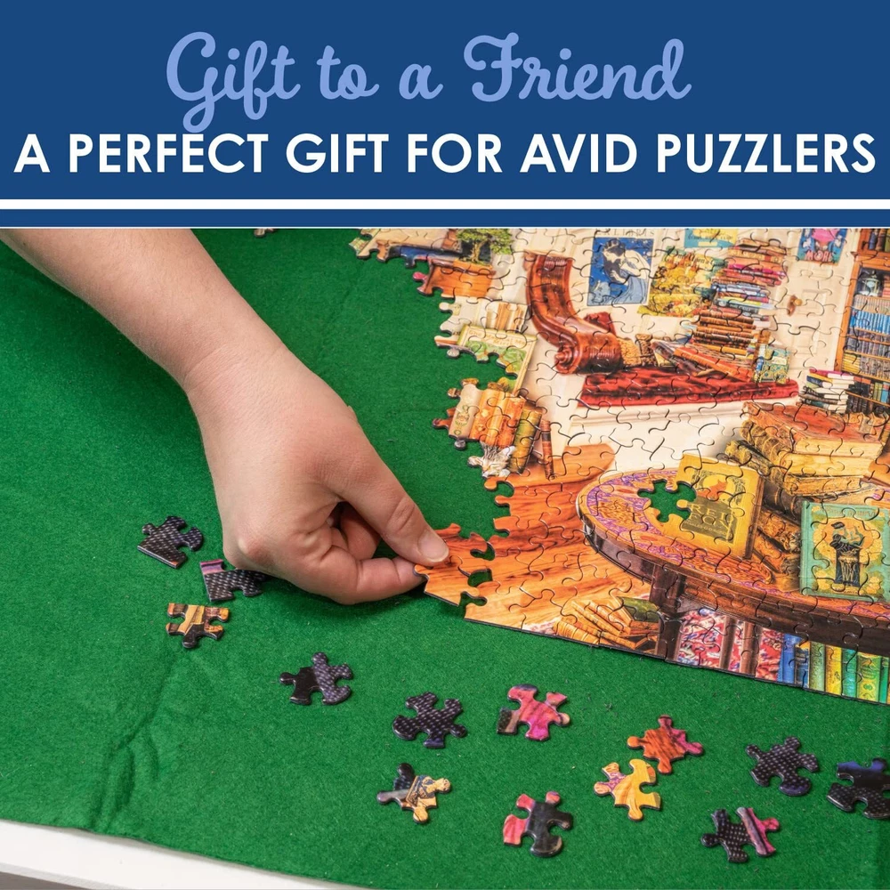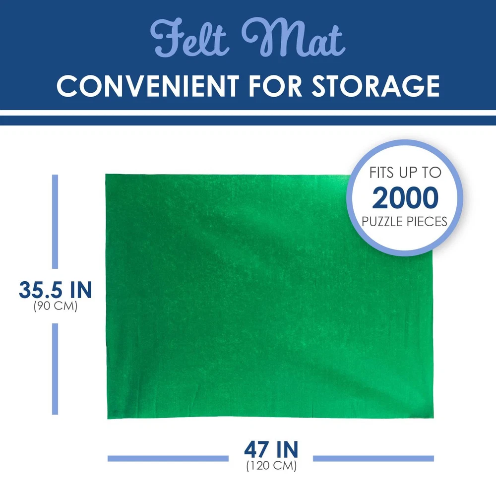 Safely your in-progress puzzles with a roll-up mat that can hold up to 2000 jigsaw pieces. This set includes a felt mat, inflatable tube, pump, 3 velcro straps. The felt mat measures 47" x 35.5" and ensures all pieces stay in place without folds or creases. The green mat color creates contrast for easy visibility. Keep pieces about 8” from the edge, inflate the tube with pump & place it on either side of the mat, roll up the mat over the inflated tube, & tie with included fasteners. HOLDS LARGE PUZZLES: Safely your in-progress puzzles with a roll-up mat that holds up to 2000 jigsaw pieces. This set includes a felt mat (47" x 35.5"), inflatable tube, pump, & 3 velcro straps. EASY TO AND TRANSPORT: Save the puzzle you’re working on with a convenient storage mat with an inflatable tube and roll up mat. It can hold pieces in place where you travel. PUZZLE SAVER: The felt mat measures 47" x 35.5" and ensures all pieces stay in place without folds or creases. The green mat color creates contrast for easy visibility. EASY TO USE: Keep pieces about 8” from the edge, inflate the tube with pump & place it on either side of the mat, roll up the mat over the inflated tube, & tie with included fasteners. MADE IN THE USA: For over 30 years, Puzzles has crafted the highest quality puzzles for the entire family to enjoy. We offer colorful jigsaw puzzles for all ages from recognized artists.