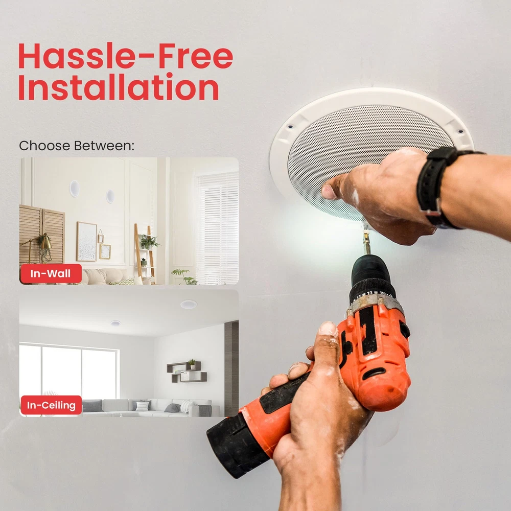 Pyle 6.5 Inch 300W Dual Channel 8 Ohm Home Audio In Ceiling Marine Grade Waterproof Speaker with 60Hz to 22kHz Frequency Response, Single, 1 Pack WEATHER RESISTANT SPEAKERS: Pyle 6.5” ceiling wall mount speaker is a dual channel speaker that features weather resistant for high moisture areas. The product is marine grade construction perfect for indoor and outdoor installation 60Hz - 22kHz FREQUENCY RESPONSE: Pyle ceiling speaker system is equipped with (2) 1/2” polycarbonate tweeters and frequency response. This product is pack with exceptional 8 ohm impedance rating and impressive 300 watts power handling capability FLUSH MOUNT DESIGN: A single flush mount design stereo speaker for simple and easy in-wall / in-ceiling installation. The product features convenient push-type speaker terminals allow for quick and hassle-free speaker wire connection 300 WATTS PEAK: Pyle in-wall speaker system were carefully combined to reproduce sound clearly with outstanding responsiveness. The heavy-duty voice coil can achieve wide-ranged sound performance speakers and extending the life of the product EASY INSTALLATION: The product includes cut-out template for easy installation. The cut-out template measure 7 2/3” in diameter and 2 3/4” in mounting depth. The product also includes the mounting hardware for precise application or installation