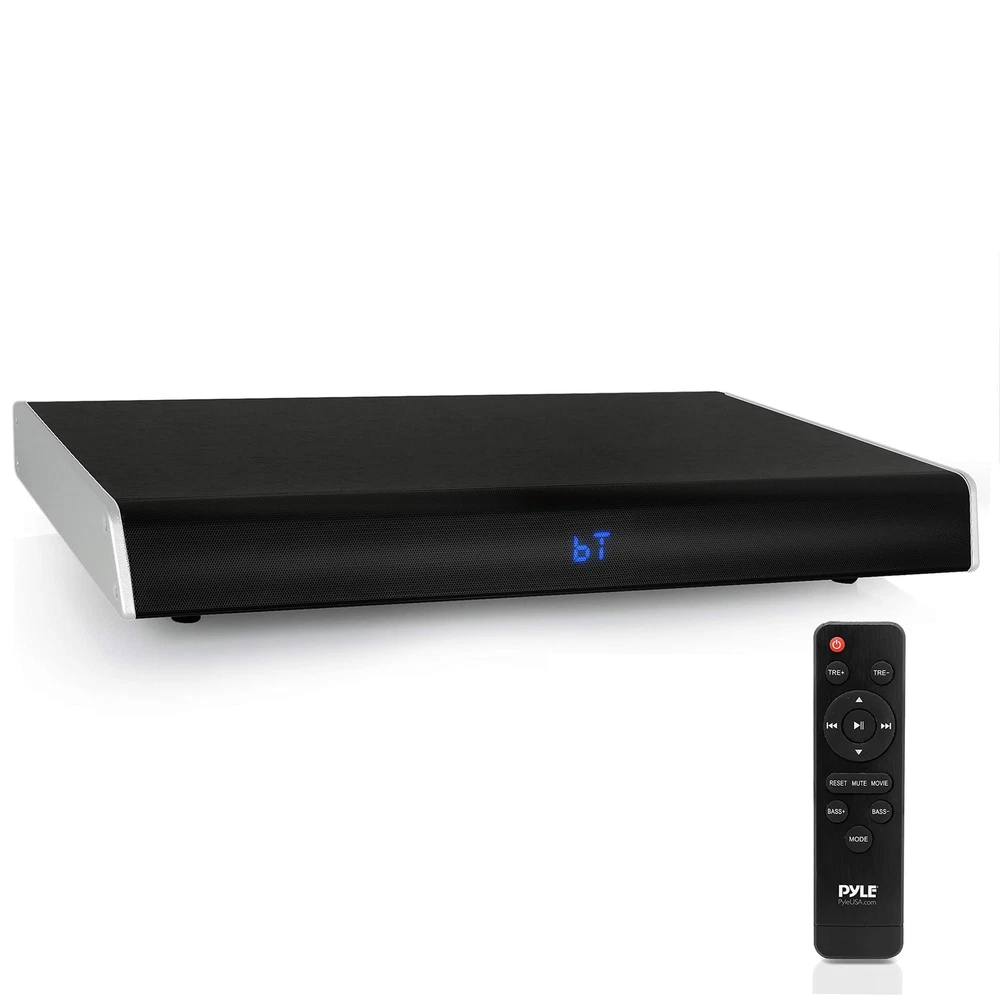 Pyle Surround Sound TV Sound Bar - Bluetooth Compatible Wireless Soundbar for TV w/Built-in Subwoofer Speaker - Television Sound Bar System w/LCD/Digital Optical Audio/RCA/AUX/USB - PSBV820BT, Black Low Profile Sound Base Speaker System Designed to Sit Under Your Television Versatile Home Theater Entertainment Tabletop TV Stand with Full Range Stereo Sound Bluetooth Wireless Music Streaming Ability Works with All of Your Favorite Devices 2.1 Channel Digital System - Connect to Smartphones, Tablets, MP3 Players, Laptops, PC, etc. Sound System: (1) 5'' Woofers, (2) 1.5'' Speakers - Max Power: 25 Watt x 2 (100 Watt Woofer) Power source type: Corded Electric