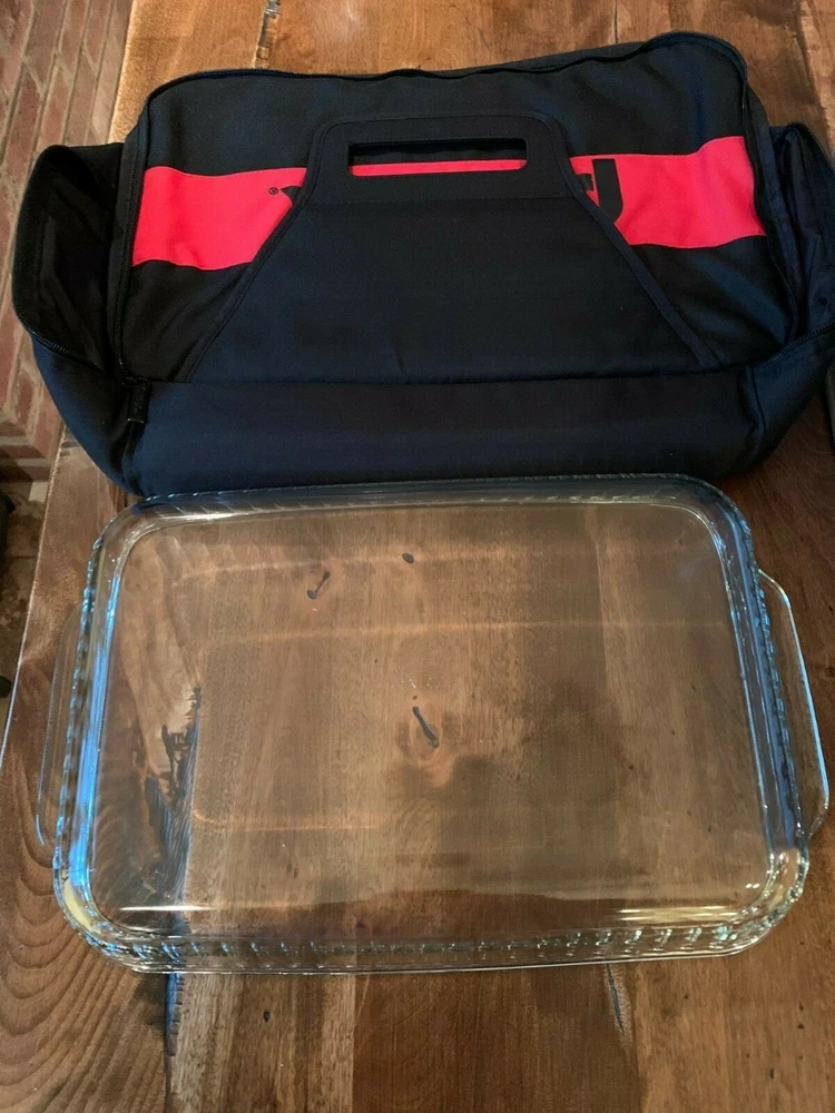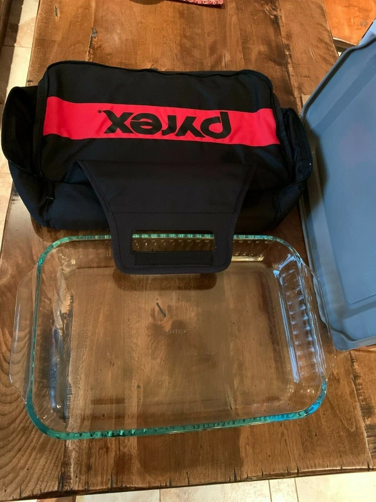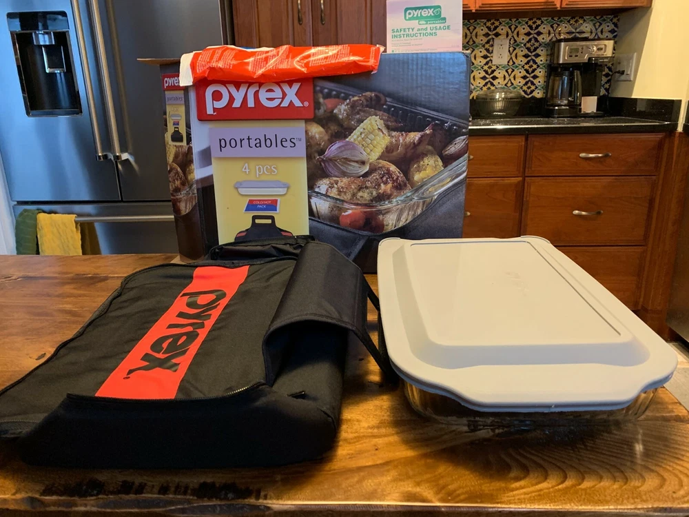 Pyrex 4-piece Portables Set - 3 Qt. - with Black Carry Bag - New in Box. Transport food safely and easily at the perfect temperature. Large Pyrex baking dish with a designed-to-fit insulated bag. The dish has a snug-fitting lid to prevent spills Included is a hot/cold pack - no re-heating or chilling necessary. Durable high-quality tempered glass dish for even heating Sturdy, easy-to-clean bag keeps dishes warm or cool as they travel Bag has easy-open, easy-close secure zipper and comfortable handle for a sure grip Dish resists stains and does not absorb food odors or flavors Dish is dishwasher, freezer, microwave and preheated-oven safe BPA-free plastic lid is top-rack dishwasher, freezer and microwave safe Made in the U.S Dish Measures 16 1/2" L x 11 1/4" W x 3" H. Though it has not been used, there are a few light scratches on the bottom of the dish. Please take a moment to check out my other items for sale. Thanks for looking!!