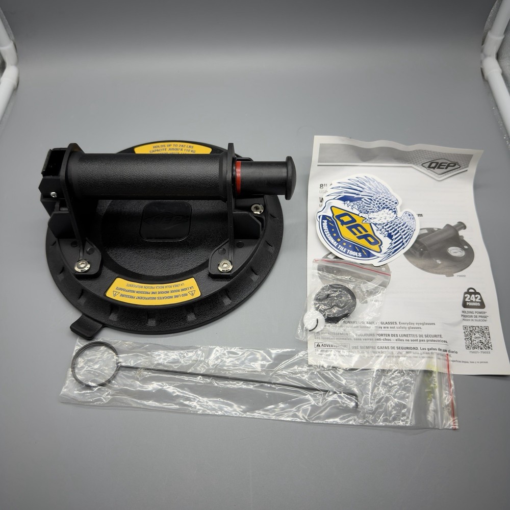 This QEP 8-inch vacuum suction cup (model 75021) is ideal for safely lifting and handling large-format tiles, glass panels, and stone surfaces. It delivers a strong 242 lb lifting capacity, perfect for professional tile setters and contractors. Condition: • Open box – unused item • Missing one latch on the storage case (see photos) • Suction cup and pump mechanism are complete and in excellent condition Specifications: • Brand: QEP • Model: 75021 • Cup Size: 8 inches • Lifting Capacity: 242 lbs • Type: Vacuum Pump Suction Cup • Includes: Protective case (missing one latch)