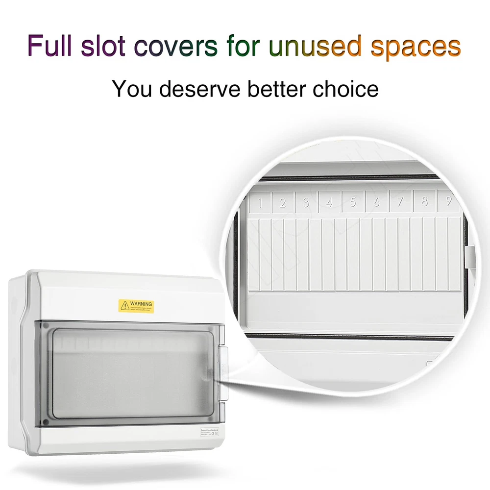 Description QILIPSU IP65 Waterproof Home Electric Vehicle Charger Box Specifications * Way: 9 way * Material: PC plastic * Waterproof Rating: IP65 * Size: 8.6"x7.9"x3.9" (219x200x100mm) Application Electric Vehicle Charger, Communication, Firefighting, Lighting, etc. 【SUPERIOR FIRE SAFETY】- The material for this circuit breaker box has been upgraded to the finest V0 PC/ABS alloy plastic now, which has demonstrated flame resistance through a rigorous 960℃ hot wire test. This premium material provides enhanced durability, superior resistance to high temperatures and pressures, and longevity that's second to none. It's the perfect solution for high-end projects that demand the highest-quality equipment. 【FULL SLOT COVERS】- QILIPSU upgrades all outdoor breaker boxes with full slot sovers for snused spaces. This ensures protection from electrical shock, prevent the accumulation of dust and debris and reduce the risk of damage to the electrical components. 【BUS BARS INCLUDED】- Easy for neutral and ground wiring, made from high quality copper to ensure a good conductivity, safety and reliable for your applications. 【IP65 GRADE】- The power distribution boxes are waterproof & weatherproof designed, effectively block splashing water, rain, dust, snow, oil, UV rays and more. You can rest assured to use the box in both indoor and outdoor applications. 【EFFORTLESS SETUP, EXTENSIVE VERSATILITY】- The reserved hole position of our din rail enclosure can help you mount the box to the wall very easily. It can be widely used for solar power systems, electric vehicle charging stations, networks, communication infrastructures, and other utility applications. 【EXTERNAL DIMENSIONS】- 8.6"x7.9"x3.9" (219x200x100mm). Ensure a perfect fit: Please double-check dimensions before purchasing to ensure a seamless match that saves you time and costs. If you have any doubts about the dimensions, please don't hesitate to contact us. 【QILIPSU UNIQUE SERVICE】- At QILIPSU, we're more than just a brand, we're a community that puts your satisfaction at the heart of everything we do. We understand that perfect experiences are crafted with care, so we offer an exceptional extended after-sale service for effortless returns, even beyond Amazon's return window. Please don’t hesitate to contact us if you have any issues. Our dedicated after-sale team is here to turn every concern into comfort, ensuring your journey with us is nothing short of perfect. Your voice helps us grow and refine, guiding us to serve you better. 【WHY CHOOSE QILIPSU】- We're exclusively focused on industrial products, bringing electrifying expertise to your projects. While words can easily be duplicated, true excellence shines through in comparison. Guided by the invaluable insights from our valued customers, we commit to thinking differently, redefining standards of quality and service. Try QILIPSU, you're choosing more than a provider; you're gaining a partner committed to enhancing your efficiency and reducing costs.