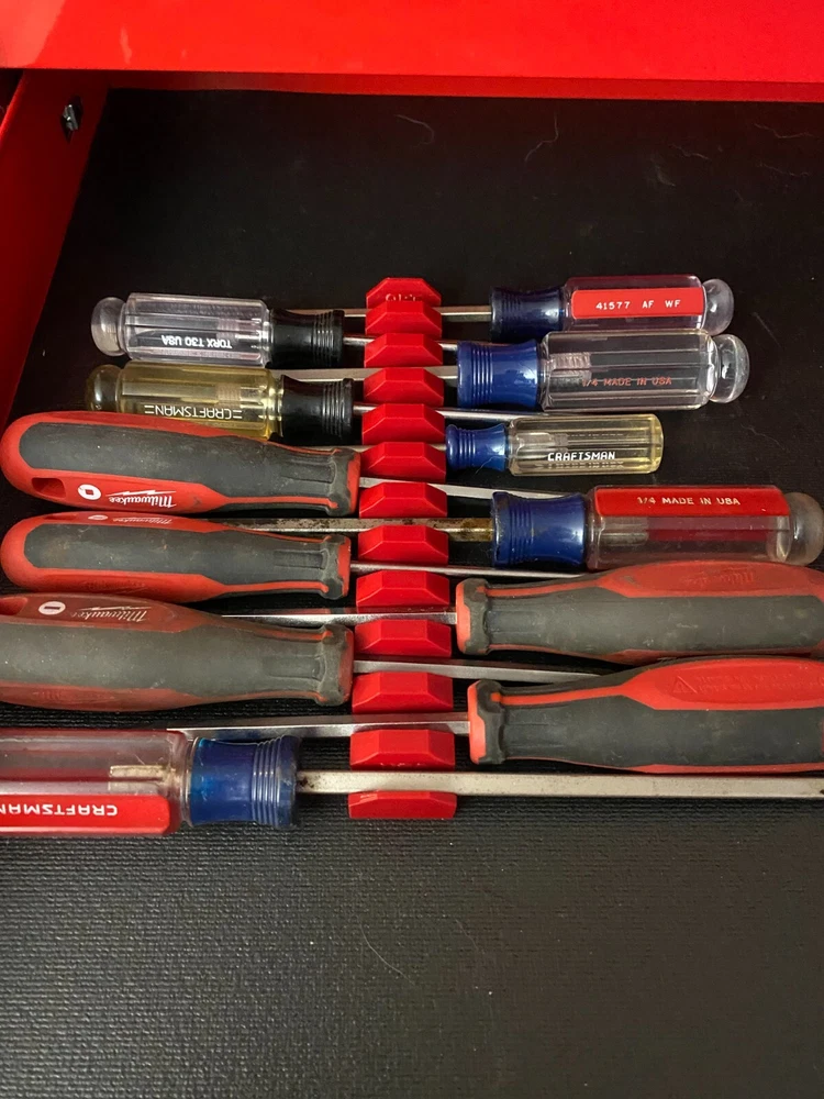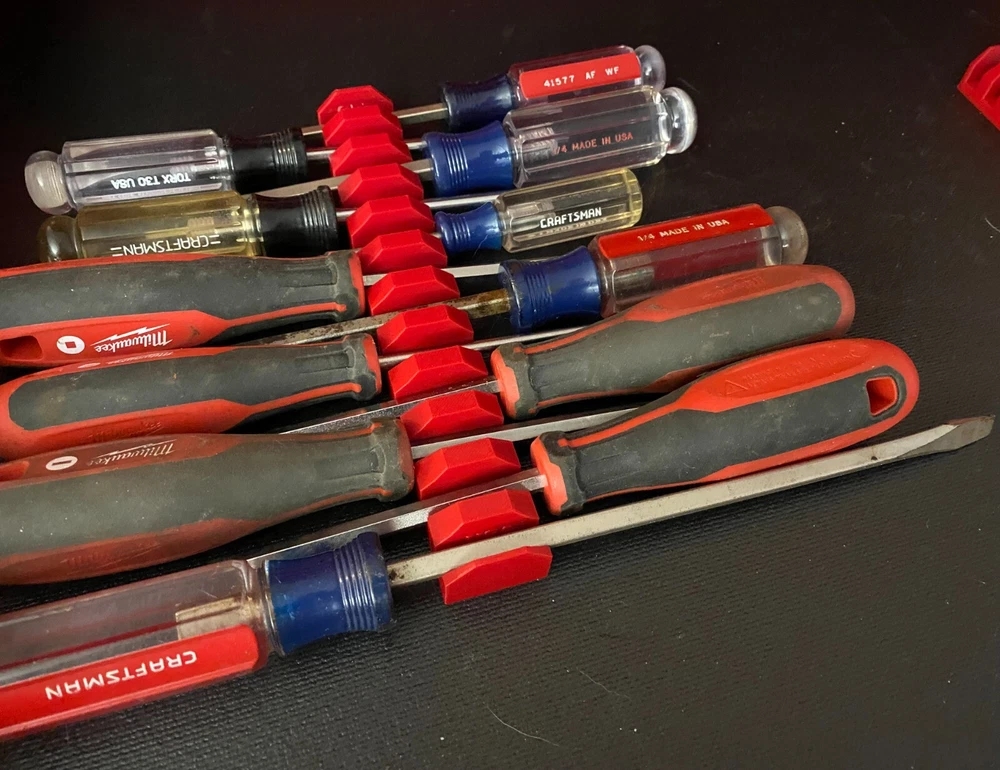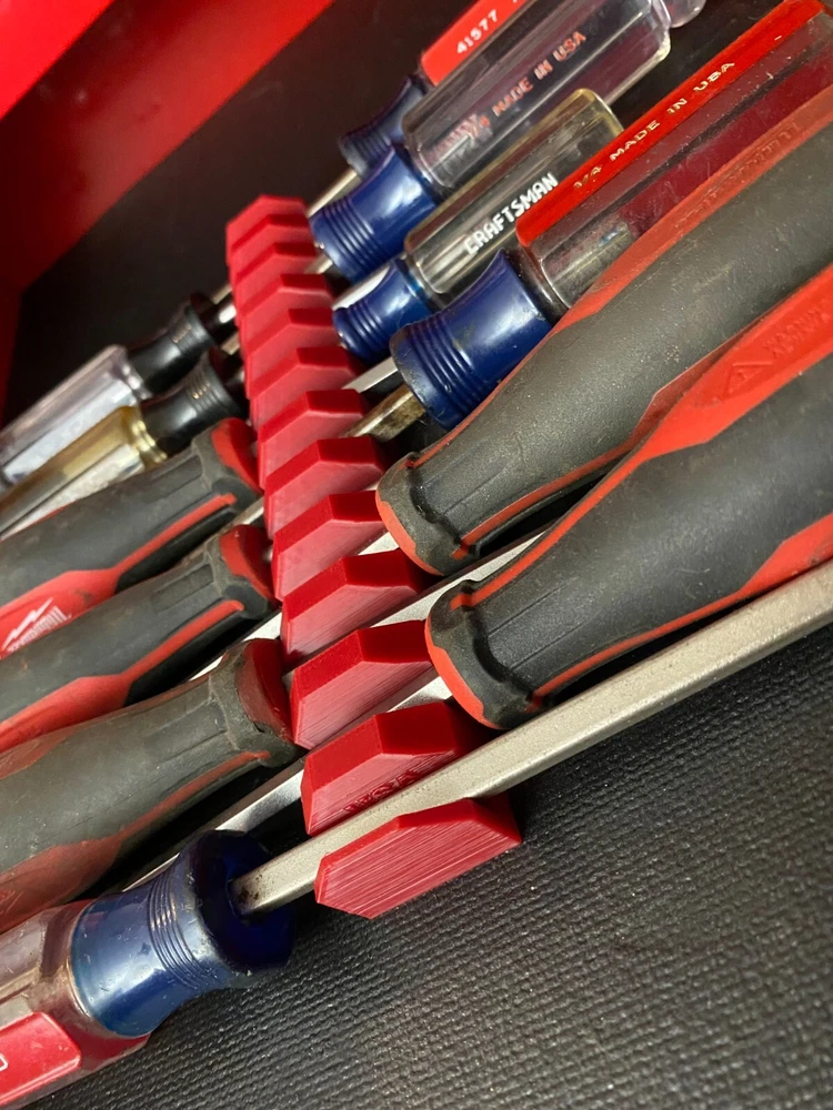 Get your drivers in order with QRT's 12/6 Slot Screwdriver Holder Organizer Rail With Integrated Magnets 12 and 6 Slot Versions to build/fit set to your needs. Each Slot has 2 8x3mm N52 Disc Magnets, which are strategically printed into the block holding it firmly in place even through the thickest tool liners while also holding your tools firm. Dimensions are 22mm High, 31 mm wide and 202mm long 3D Printed in USA from High Quality Imported PLA Plus Filaments. Magnets are Imported **Drivers in photos are for photographic purposed only to demonstrate the utility of the product and are not included with the rack** Check out our other tool storage organizers Feel free to reach out with any questions! QRT Combined Shipping Policy - We automatically combine your shipping no need to reach out, we refund the difference back when we ship your order.