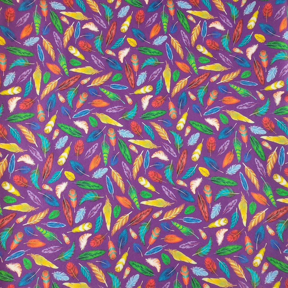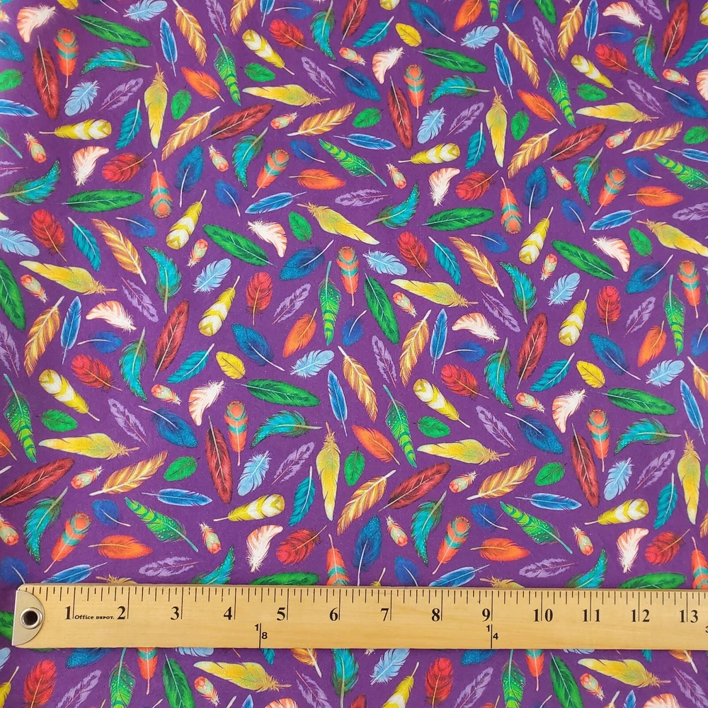 QT Fabrics Vibrant Feathers on Purple 1 3/4 yards (63") Cotton Quilting Fabric Single Piece measures 63" or 1 3/4 yards Fabric has been washed without detergent and dried and cut. It is unused and in excellent condition. Selling off my large collection of fabric. All fabrics were purchased new and prewashed upon receiving FABRIC has been pre-washed Width is standard for the print 40" or wider Contents: 100% Cotton Care: Machine Wash/Tumble Dry Low