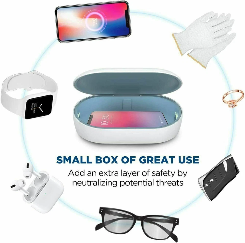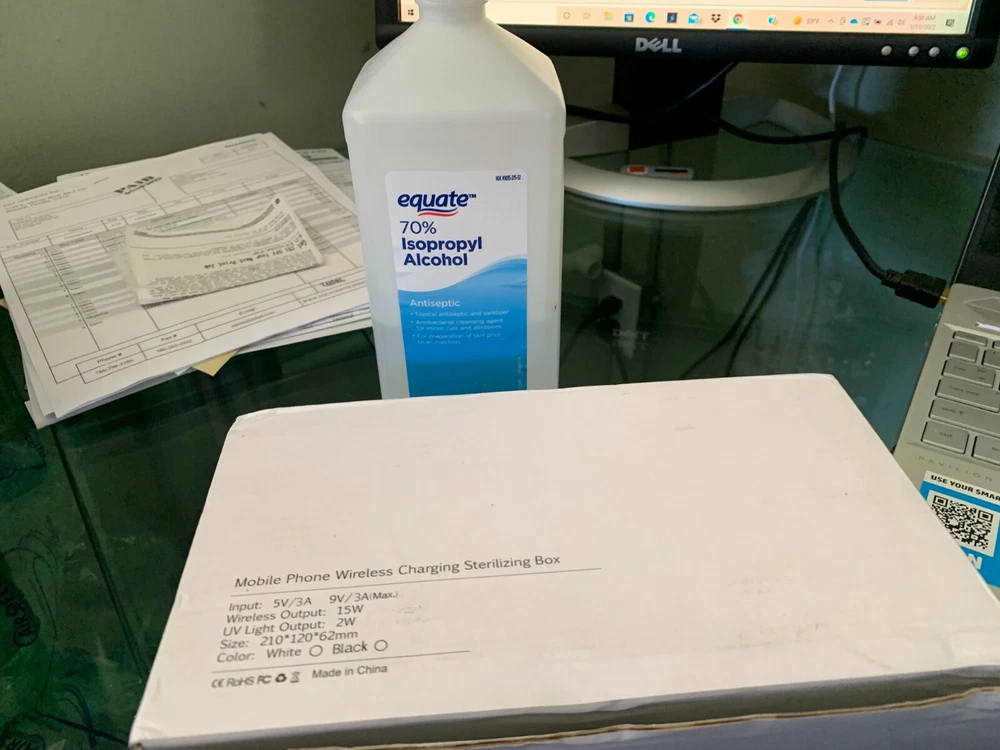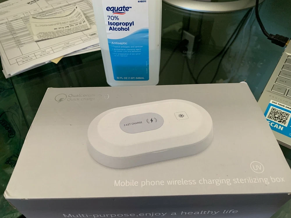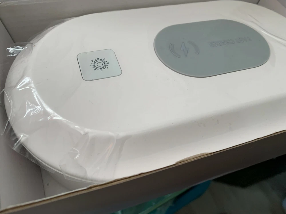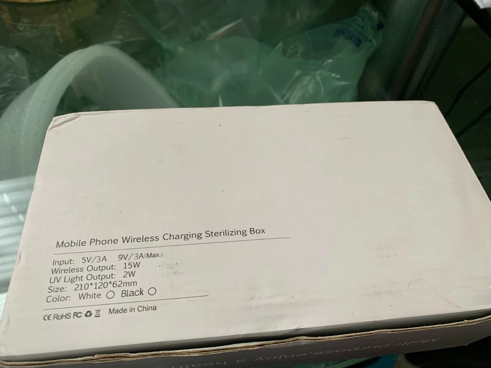 Qualcomm quick charge 3.0 Mobile phone wireless charging sterilizing box. Double Sterilization Wireless Charging Aromatherapy purification Multi-purpose, enjoy a healthy life Input: 5V/3A, 9V/3A (Max.) Wireless Output: 15W UV Light Output: 2W Size: 210 x 120 x 62 mm Color: White Made in China Non Smoking environment. Shipping: Economy : 1-10 working days