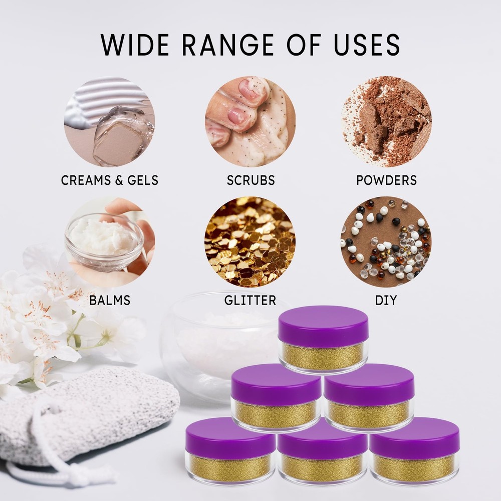 10G/10ML Purple Lid Container Jars Reusable Acrylic Jars to Store Creams, Lotions, Make Up, Cosmetics, Lip Balm, Lip Gloss, Scrubs, Salves, Nail Accessories, Charms, Beads, Small Jewelry and More Can Be Used For Mixing or Sampling Beauty or Health Products Great for Professional or Personal Use Lightweight and Compact for Easy Travel Use Color: Purple Quantity: 300 Pieces (Jar and Lid) Dimensions: Outer - 1.5 Inches x 0.7 Inches / Inner – h (0.58 in) w (1.17 in) High Quality Acrylic Resistant to Breaking and Warping, BPA Free Use to store a wide variety of items from food to cosmetics to art supplies and hardware. Possibilities are endless!