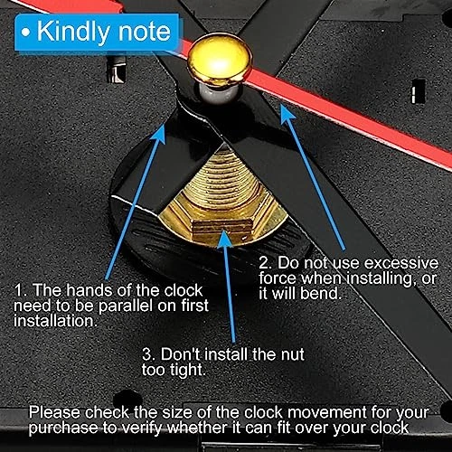 Return Policy Fast Delivery Trusted seller Clock Mechanism Replacement, 1set Quartz Clock Mechanism Battery Operated DIY Wall Clock Aluminium 63mm Hands and Motor Kit Mute Movement, Black Red Product Description Material: Plastic, Quartz, Aluminum , Metal; Battery Type: AA Carbon Battery (Not included); Thread Length: 11 mm / 0.43 inch; Mechanism Shaft Length: 18 mm / 0.7 inch; Mechanism Box Size: 56x 56 x 16 mm/ 2.2x 2.2 x 0.63 inch (L*W*T); Suitable for Clock Face Thickness: 7-8 mm / 0.28-0.32 inch Advantage:Mute clock mechanism: The clock movement adopts a super silent scanning design, and the scanning clock movement has no noise, providing a quiet environment for your sleep. Time accuracy: The error in a day is within 1 second. This clock mechanism battery operated is low power consumption, only 1 AA battery is required (not included). Instruction: 1. Insert the movement into the clock face slot; 2. Install the washer and nut in the movement shaft; 3. Place the hour hand, minute hand, and second hand at the twelve o'clock position in order. Application: The diy clock mechanism replacement Kit is a good replacement. suitable for cross-stitch, three-dimensional embroidery, craft clock, frameless draw clock,12888, etc. Suitable for repairing, replacing, and also suitable for diy various styles of the clock frame. Note: 1. Please check the size of the battery clock mechanism for your purchase to verify whether it can fit over your clock; 2. Do not use excessive force when installing, or it will bend. Shipping Returns Payment Shipping Shipping is FREE to all addresses other than APO/PO boxes in the lower 48 states. All our stock ships from US-based warehouses. Shipped via USPS or UPS (depending on location and package weight) Unless stated otherwise, all orders will ship within 24-72 hours of your payment being processed. Check our feedback to see the great reviews of FAST shipping we offer. Returns Seller does not accept returns Payment We currently accept payment via eBay managed payments only. Once payment is cleared, we will dispatch your shipment within 1-3 business days. Please refer to the "Shipping" tab for more information regarding shipping speed to your destination.