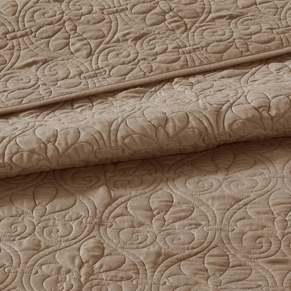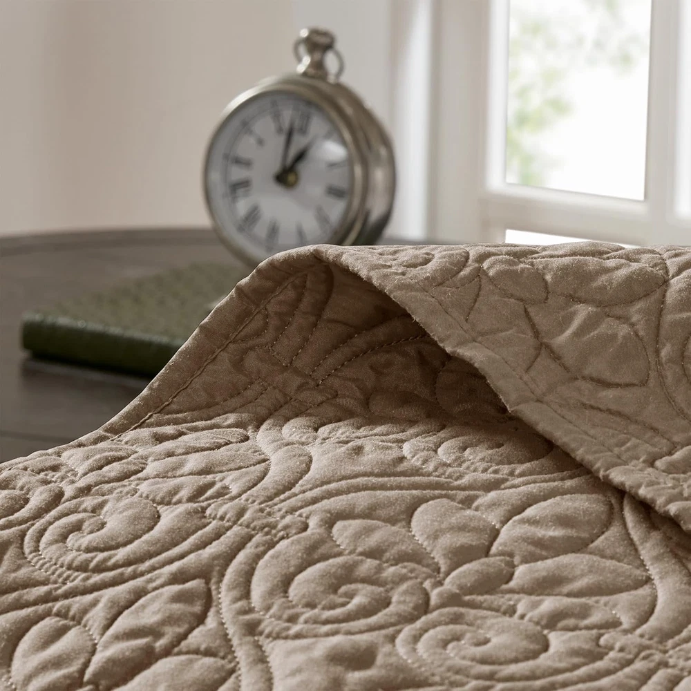 100% Microfiber Face & Reverse, Filling: 90% Cotton, 10% Olefin Madison Park Quebec Reversible Bedspread Set is the perfect classic update to your bedroom décor. Bedspread dimension is oversized to drape better on high depth mattress The classic stitch pattern pairs easily with your existing decor and will sure to add a new decorative element to your bedroom Naturally lightweight fabric perfect for summer use or layer it on for cold weather Set includes: 1 Bedspread: 120"W x 118"L, 2 King Shams: 20"W x 36"L Care instructions: machine washable The Madison Park Quebec Reversible Bedspread Set offers a charming cottage-inspired update to your bedroom. The reversible bedspread and shams (1 in Twin/TwinXL) flaunt a classic stitch pattern that creates a rich depth and texture on the face of the bedding set. Prewashed cotton filling provides added comfort and durability, while the oversized dimensions allow the bedspread to drape better.
