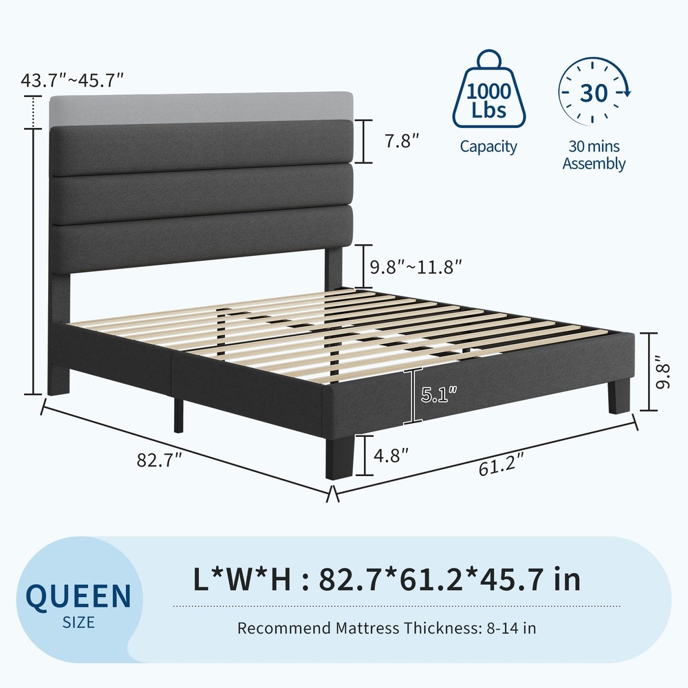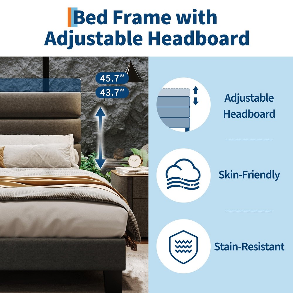 About this item Adjustable Headboard: The queen bed frame with headboard featured with an adjustable headboard that can be adjusted from 43.7 to 45.7 inches high, allowing you to use mattresses of different thicknesses. The linen fabric upholstery is designed to be both stain-resistant and wear-resistant. Stylish & Comfortable: Bed frame queen size features linen upholstered headboard adds elegance and sophistication to your bedroom. High-quality and affordable headboard that looks great and provides excellent support and providing a comfortable backrest for reading or watching TV. Wooden Slats & No Box Spring Needed: Design with Veclro wooden slats for fast assembly also the mattress doesn’t slide around on it. Provide the excellent support for your mattress and durability. Memory foam or spring mattress without the need for a box spring. Most important thing to note is support your mattress and prevent it from sagging or shifting. Sturdiness & Noise-Free: Extra-thick heavy-duty feet that provide a stable base and superior stability and support without any wobbling or shaking. Can support up to 1000 pounds of weight. The Eva mute bar prevents noise from friction,ensuring a quiet, shake-free sleep without squeaks or creaks. Quick Assembly: The queen bed frame with headboard with headboard ships in one box and is easy to follow the simple assembly instruction with no special tools required. The process is straightforward and hassle-free, you can set it up in no time. Product Description Previous page Next page Adjustable Headboard 4.8'' Under Bed Space 4.8'' for Storage Space Previous page Next page Soft Touch Headboard Headboard & Feet Veclo & EVA Bar Special Feature Adjustable Headboard Adjusted From 43.7'' to 45.7'' Veclo Design for Quicken Install Wood Slats The Mattress Doesn’t Slide Around on It Heavy Duty Feet Max. Capacity 1000 Lbs Payment Delivery details Terms of sales About us Contact us Payment We accept payment either via PayPal or any of the following credit cards; Visa, MasterCard, Discover, and American Express. Delivery details 1. We will delivery out at the handing time when we receive the payment. 2. The delivery time is 3-5 business days to US by usually time.The parcel maybe delay 1-2day of the weekend.Due to the bad weather,Holidays,Hot Season ect.the parcel maybe delay,If you have any problems,mssage us,we will try our best to solve it. 3. We ship to your eBay address. Please make sure your eBay address is correct before you pay. 4. If you want to change the shipping address,message us before our send out. Terms of sales If you are not satisfied with the item for any reason, please do not quick to leave negative/neutral feedback even open request and case without any communication with us. We devote ourselves making EVERY CUSTOMER in 100% Satisfactory and resolve any problem. Thank you for your understanding and recognition,we are always leave positive feedback to all our customers. About Reply: All replies will be sent to your email box, if you do not get response within 24 hours (Sat. & Sun. excluded) please check your eBay My Messages in case that our emails will be filtered automatically by your settings. About us automobilee-01 is a brand new store but we are one of North America’s top online suppliers of specialized, high-quality aftermarket online retailers and suppliers, committed to developing new markets. We primarily offers tool sets, auto parts, home goods, etc..With over 20 years of product selection and manufacturing experience, we delivers unparalleled quality, value, service and satisfaction. Our highly-trained, professional staff offer in-depth knowledge and personalized assistance for customers worldwide. Providing our customers with a simple, hassle-free experience with best-in-class customer service is more than a goal. Contact us Any problem please rest assure to contact us by eBay message first. We will reply you as soon as we can. We will deal with it within 24hs on working days. Brand Unbranded Compatible Mattress Size Queen Frame Material Wood, Metal, Fabric Type Bed Frame Features Adjustable Headboard, Durable Color Gray Mattress Included No Assembly Required Yes Style Contemporary/Modern Shape Rectangular MPN Does not apply Care Instructions Easy Care Room Bedroom Country/Region of Manufacture China Item Length 82.7'' Item Width 61.2'' Item Height 45.7'' Department Adults Footboard Height 8.6'' Product Dimensions 82.7"L x 61.2"W x 45.7"H Upholstery Fabric Fabric Manufacturer Warranty 5 Years