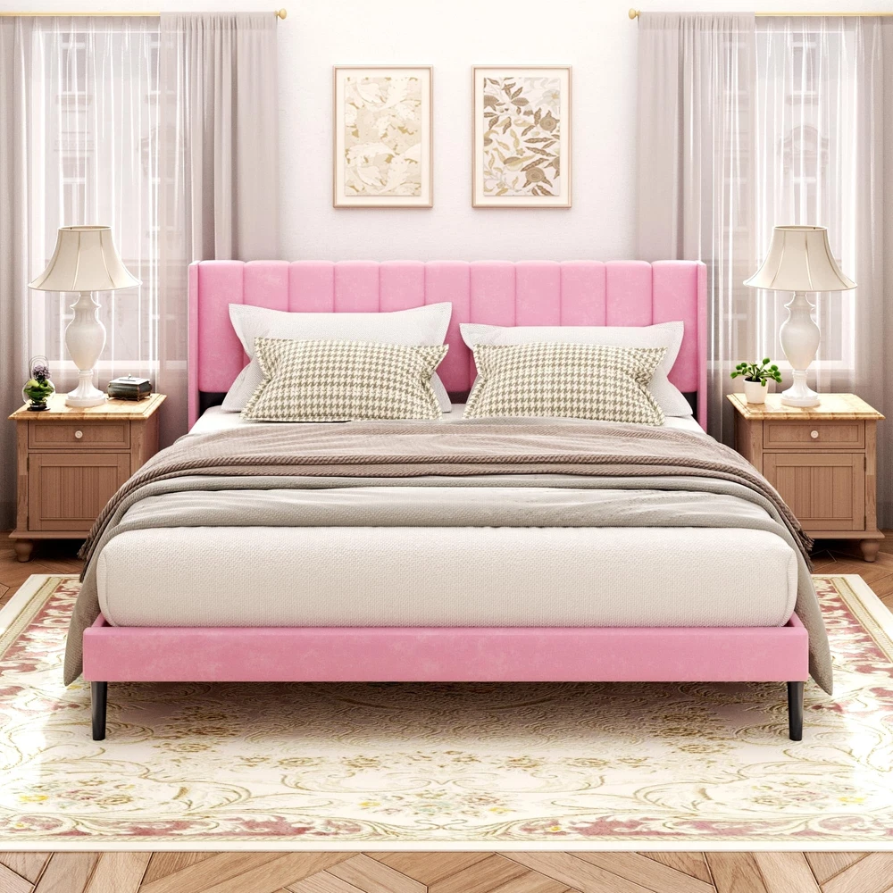 LUXURY WING BACK: Wide backrest design provides unrivaled stability, prevents pillows from slipping, and supports your head and shoulders as you lean against the headboard. Sturdy & Resistant: Made with a sturdy high-quality metal frame and center support legs blend naturally into the sturdy frame to provide dense and strong support. Weight capacity: 1000 Lbs. Thoughtful Design: 6" under-bed storage space is perfect for storing extra odds and ends. The sound-quieting features of the foot pads and sound-absorbing foam ensure a good night’s sleep. No Box Spring Needed: Durable velcro wooden slats are designed to support and extend the life of your latex, memory foam, or spring mattress. Mattress thickness recommended being 8"-12". Quick Setup: Easy to assemble in about 30 minutes, enjoy a hassle-free installation with no additional tools or springs.